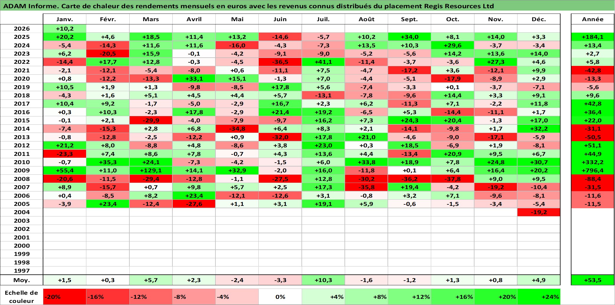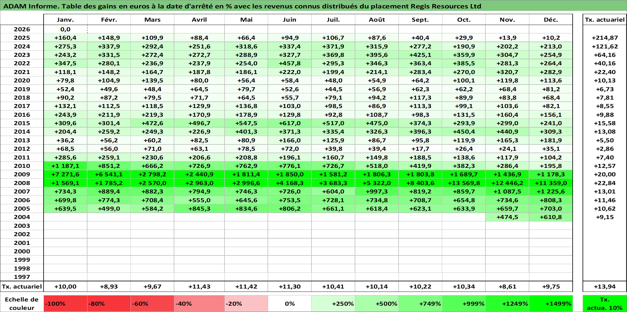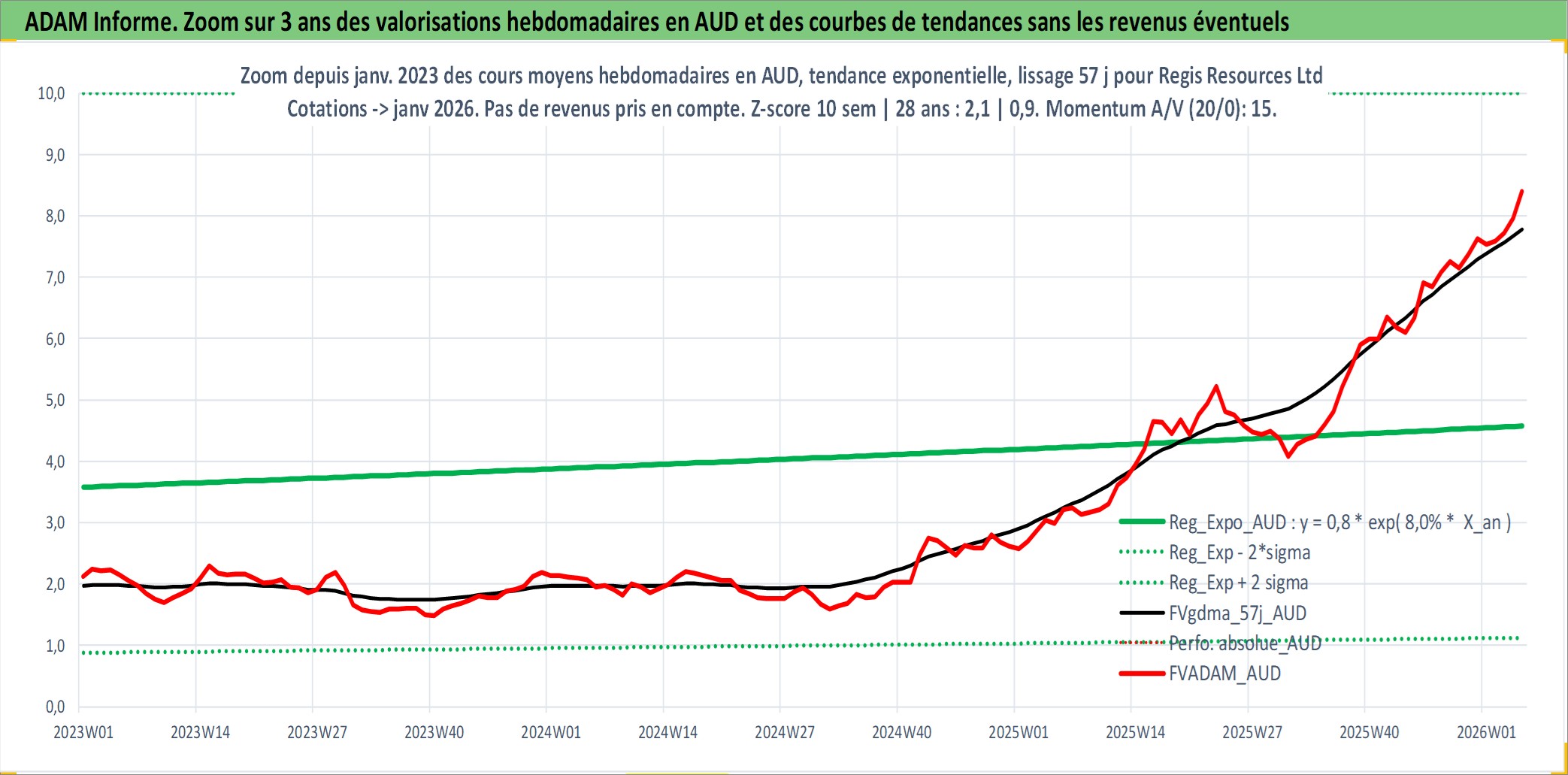 Site dédié aux investisseursPage dédiée sur site financeAnalyse des valorisations hebdomadaires de l'action Regis Resources Ltd. Cet actif est cote en AUD. Les valorisations sont en contrevaleur EURO et couvrent les semaines 2004W47 a 2026W05. Les revenus de cet actif financier sont pris en compte depuis la semaine 2013W41. La note ESG de cet actif n'est pas connue.