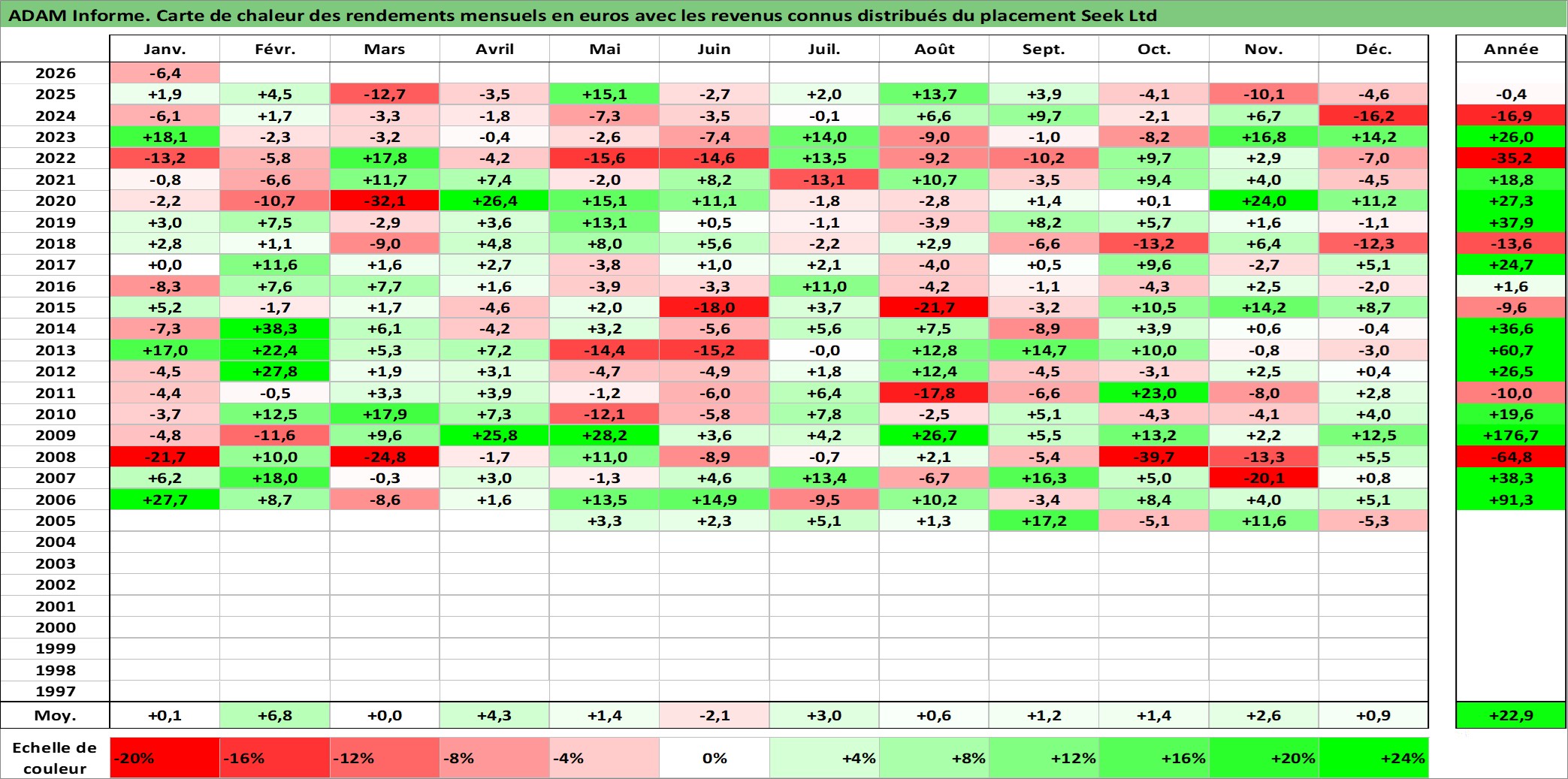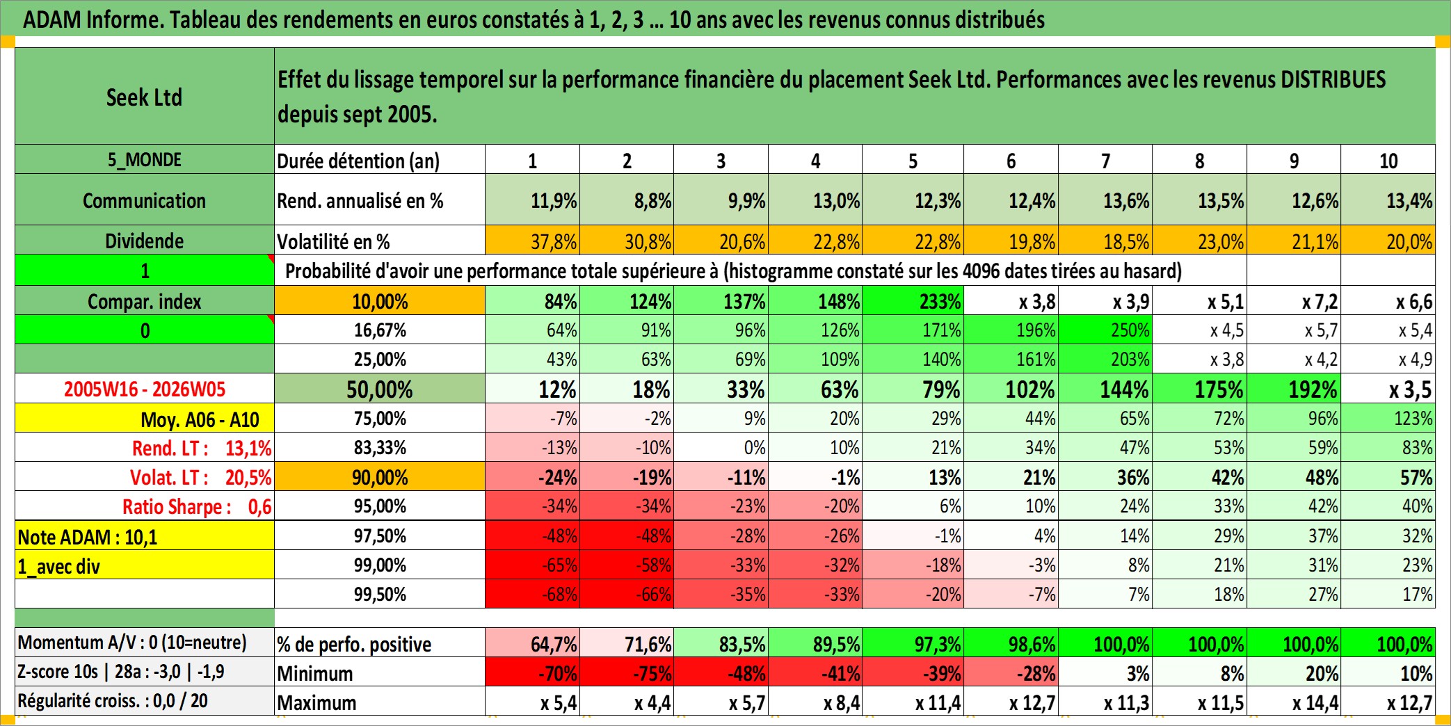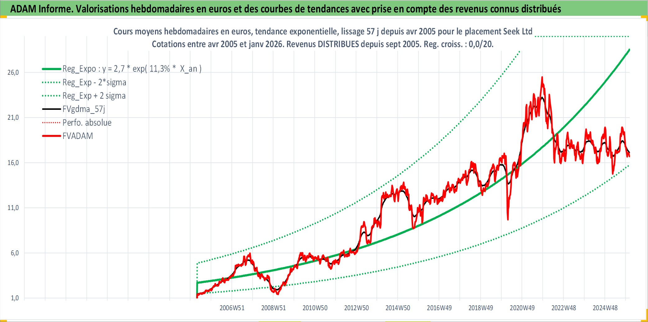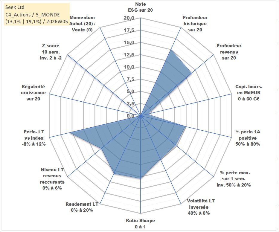 Site dédié aux investisseursPage dédiée sur site financeAnalyse des valorisations hebdomadaires de l'action Seek Ltd. Cet actif est cote en AUD. Les valorisations sont en contrevaleur EURO et couvrent les semaines 2005W16 a 2026W05. Les revenus de cet actif financier sont pris en compte depuis la semaine 2005W37. La note ESG de cet actif n'est pas connue.