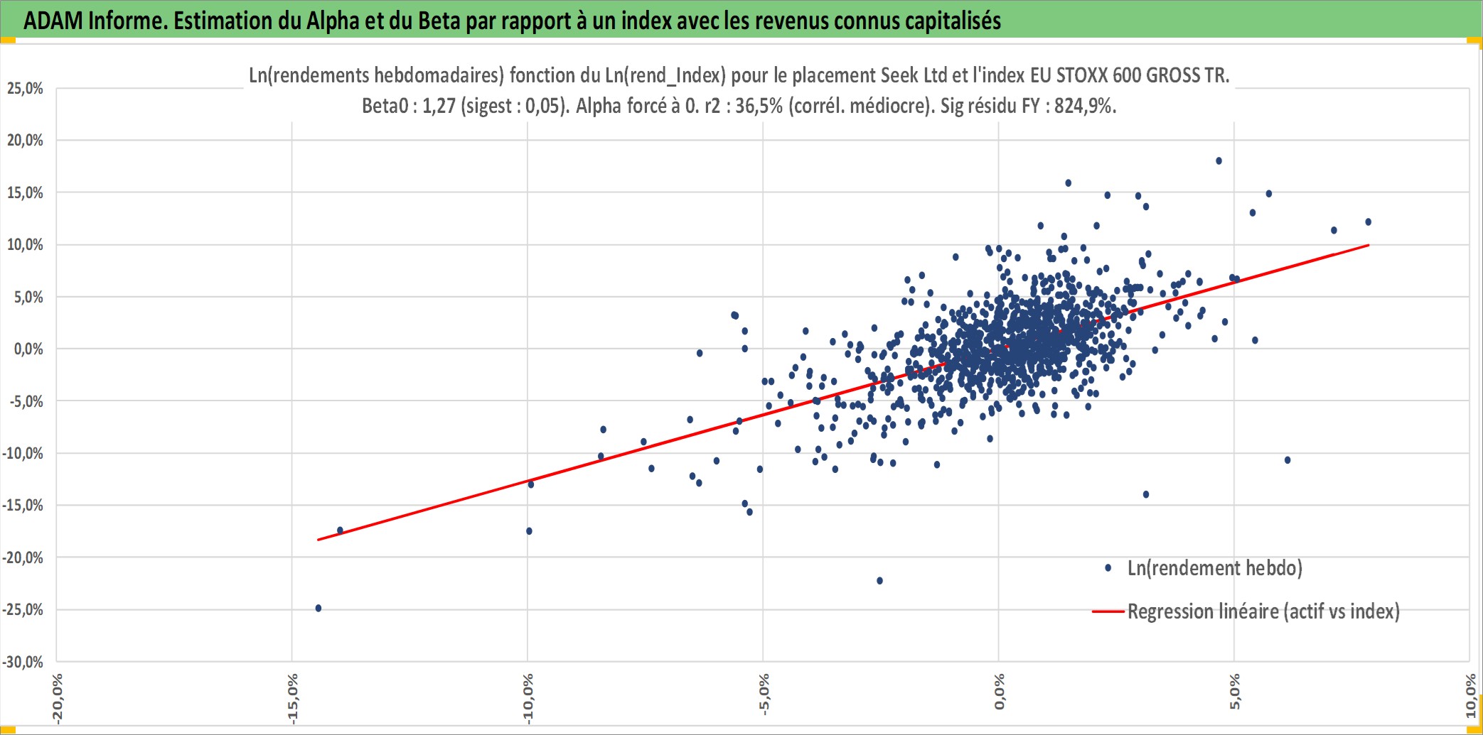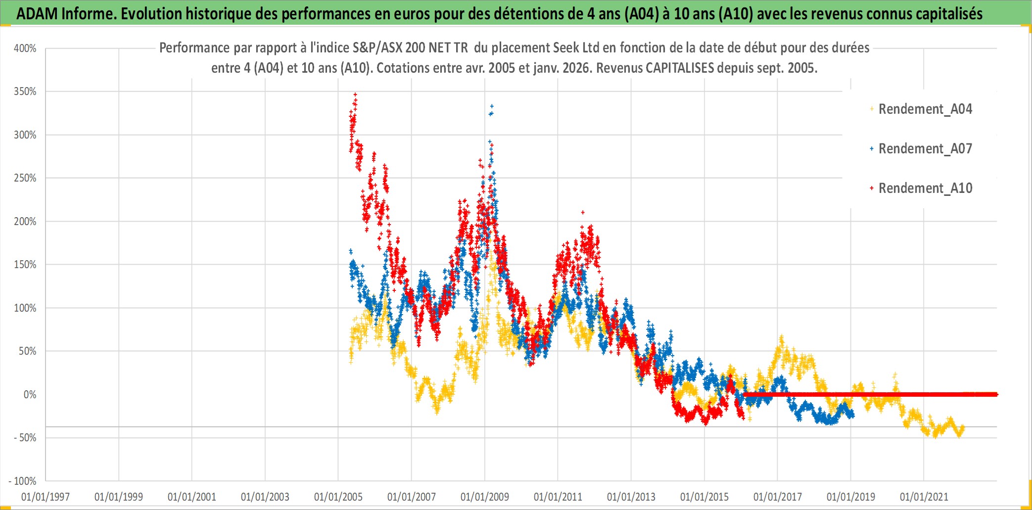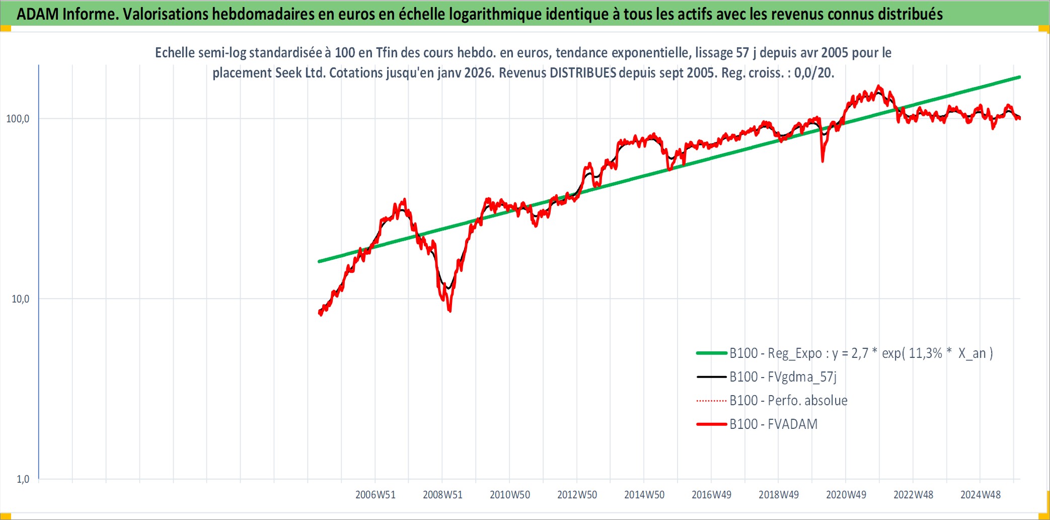 Site dédié aux investisseursPage dédiée sur site financeAnalyse des valorisations hebdomadaires de l'action Seek Ltd. Cet actif est cote en AUD. Les valorisations sont en contrevaleur EURO et couvrent les semaines 2005W16 a 2026W05. Les revenus de cet actif financier sont pris en compte depuis la semaine 2005W37. La note ESG de cet actif n'est pas connue.