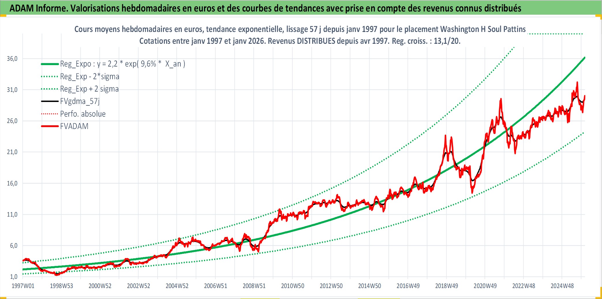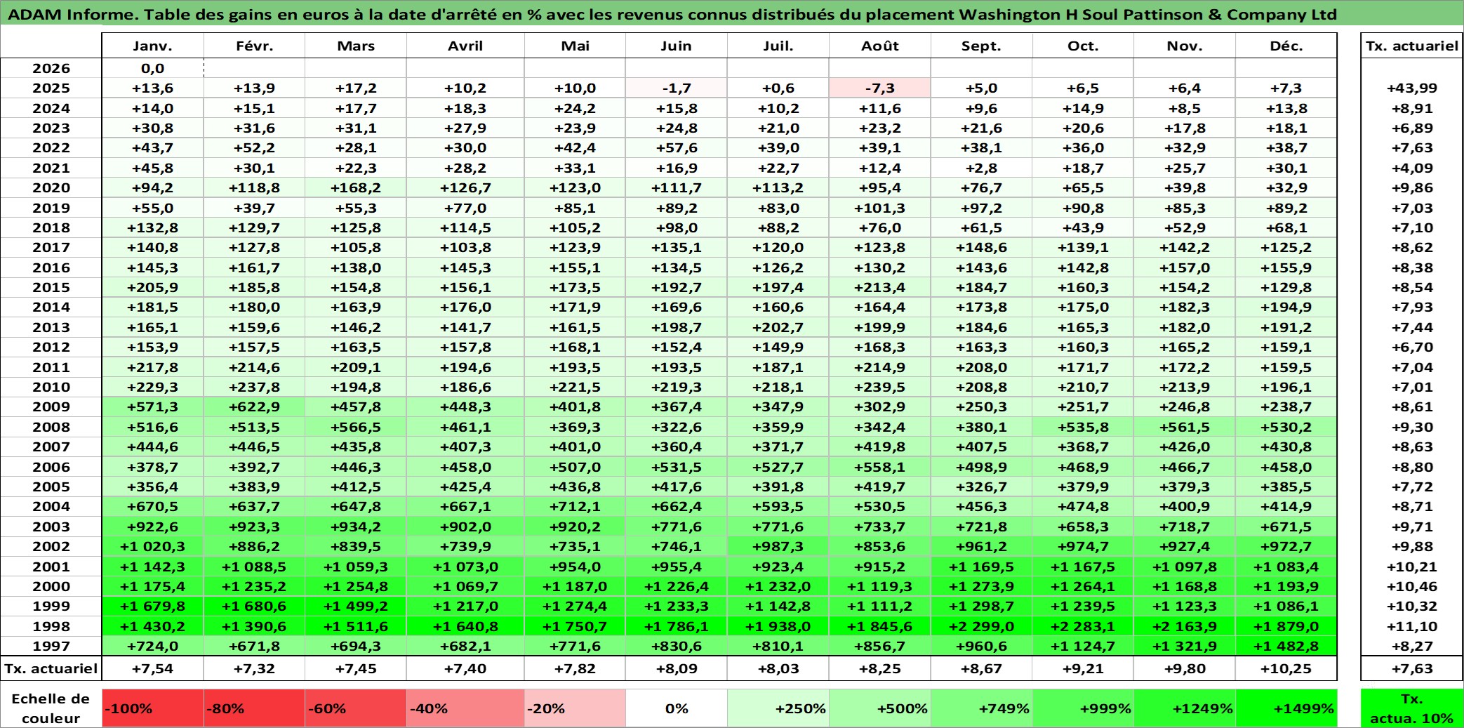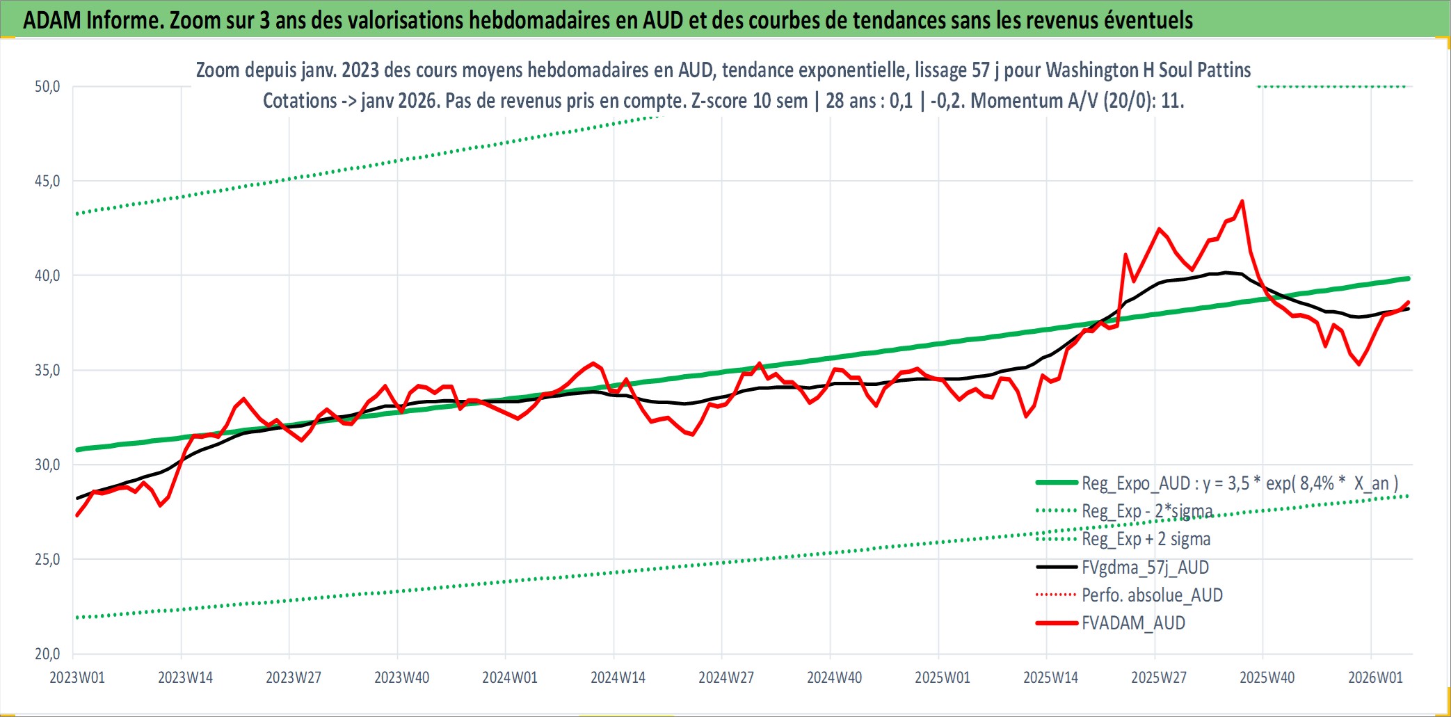 Site dédié aux investisseursPage dédiée sur site financeAnalyse des valorisations hebdomadaires de l'action Washington H Soul Pattinson & Company Ltd. Cet actif est cote en AUD. Les valorisations sont en contrevaleur EURO et couvrent les semaines 1997W01 a 2026W05. Les revenus de cet actif financier sont pris en compte depuis la semaine 1997W17. La note ESG de cet actif n'est pas connue.