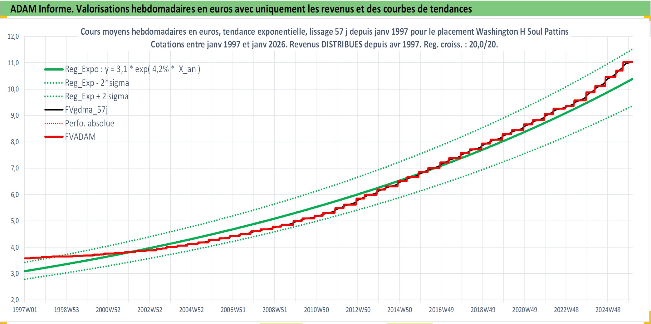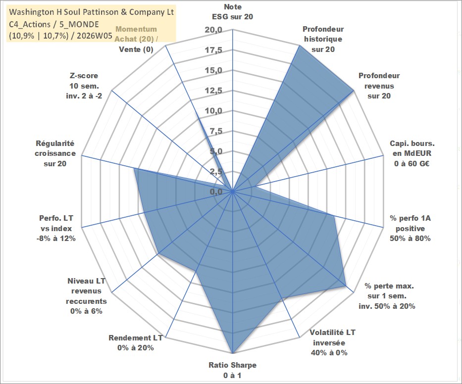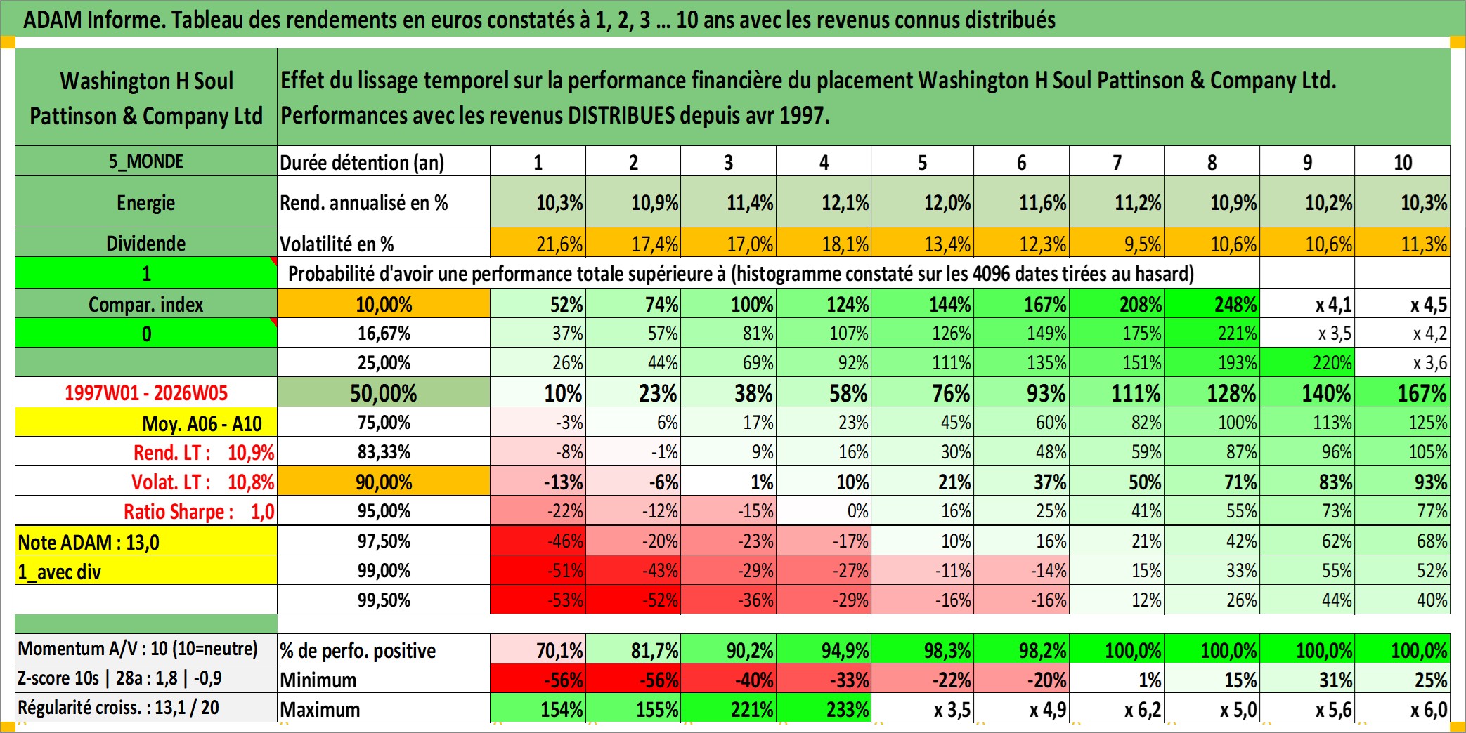 Site dédié aux investisseursPage dédiée sur site financeAnalyse des valorisations hebdomadaires de l'action Washington H Soul Pattinson & Company Ltd. Cet actif est cote en AUD. Les valorisations sont en contrevaleur EURO et couvrent les semaines 1997W01 a 2026W05. Les revenus de cet actif financier sont pris en compte depuis la semaine 1997W17. La note ESG de cet actif n'est pas connue.
