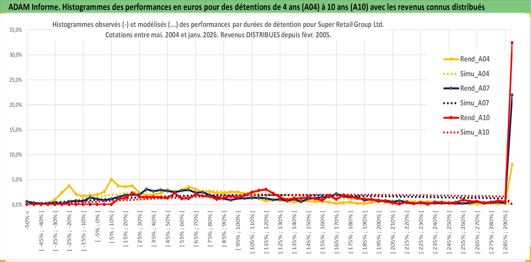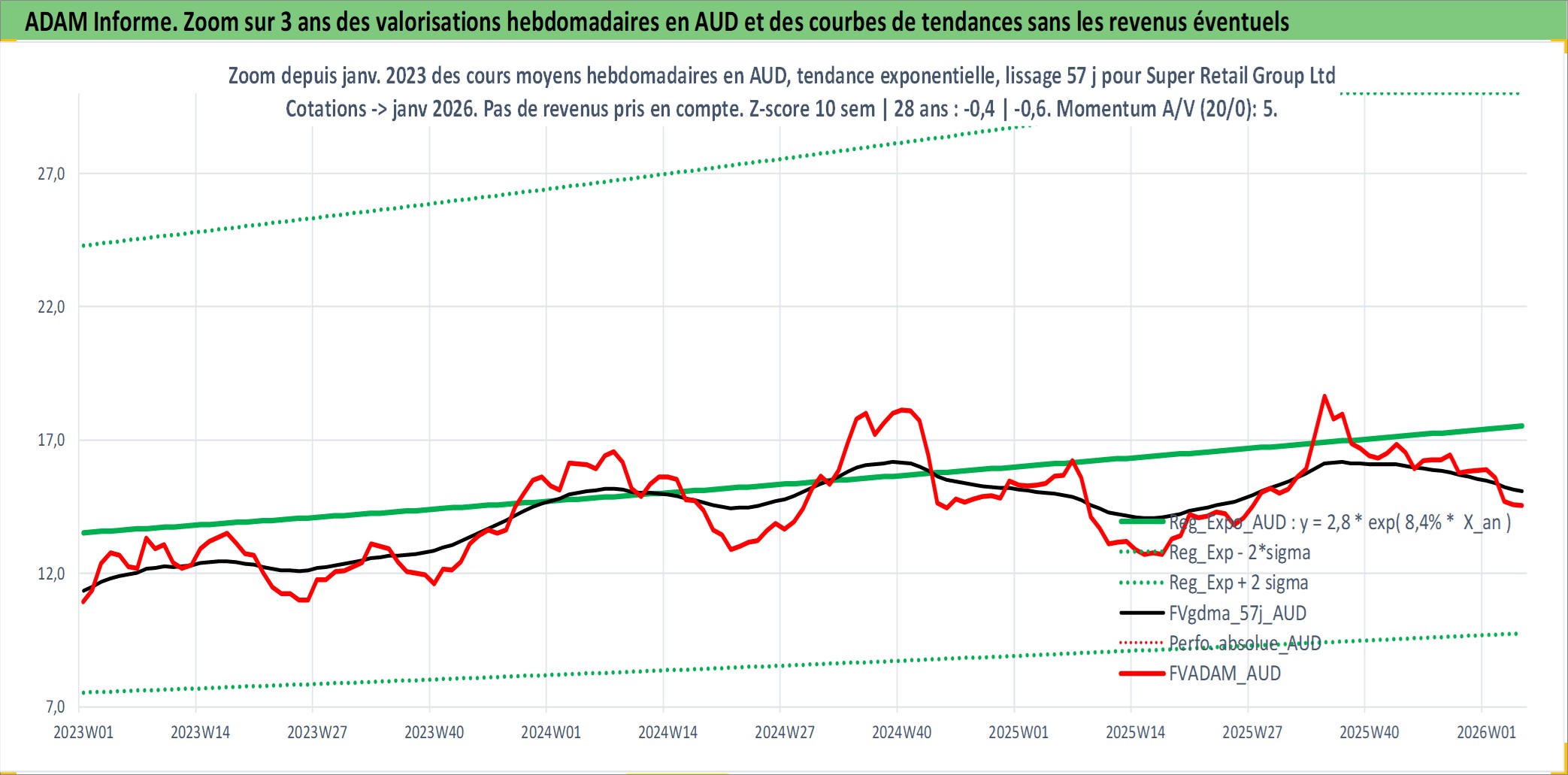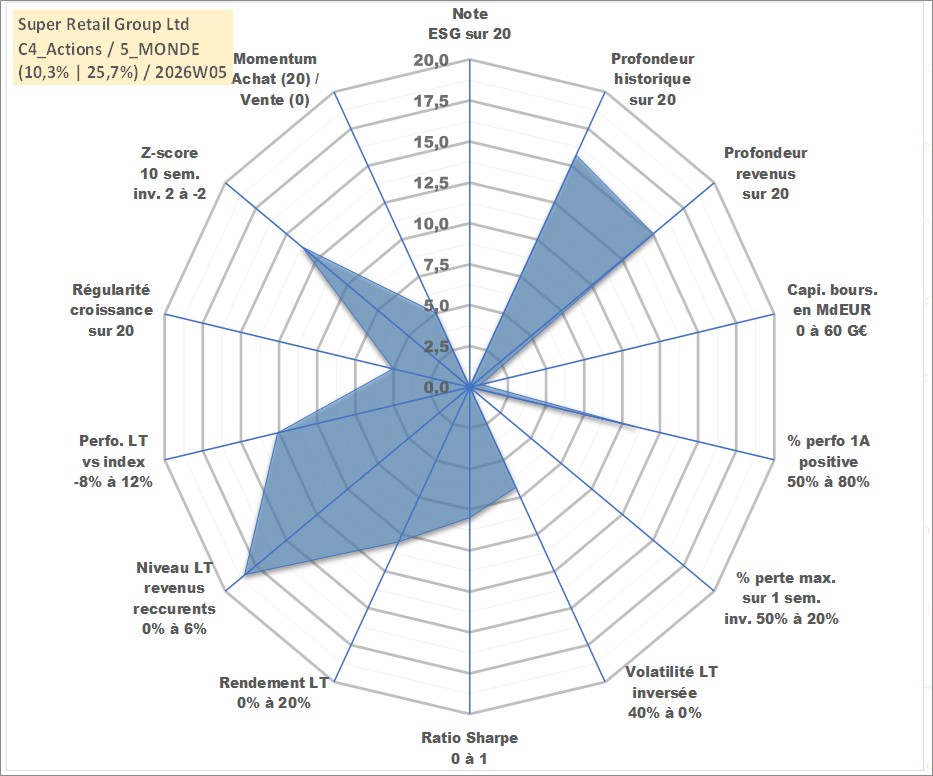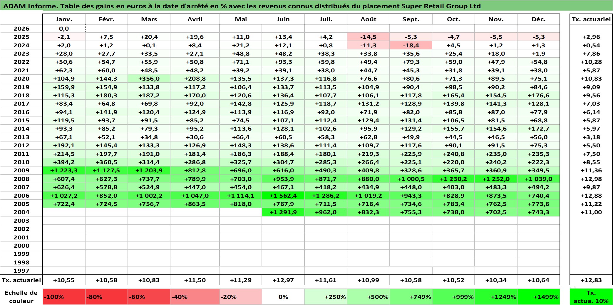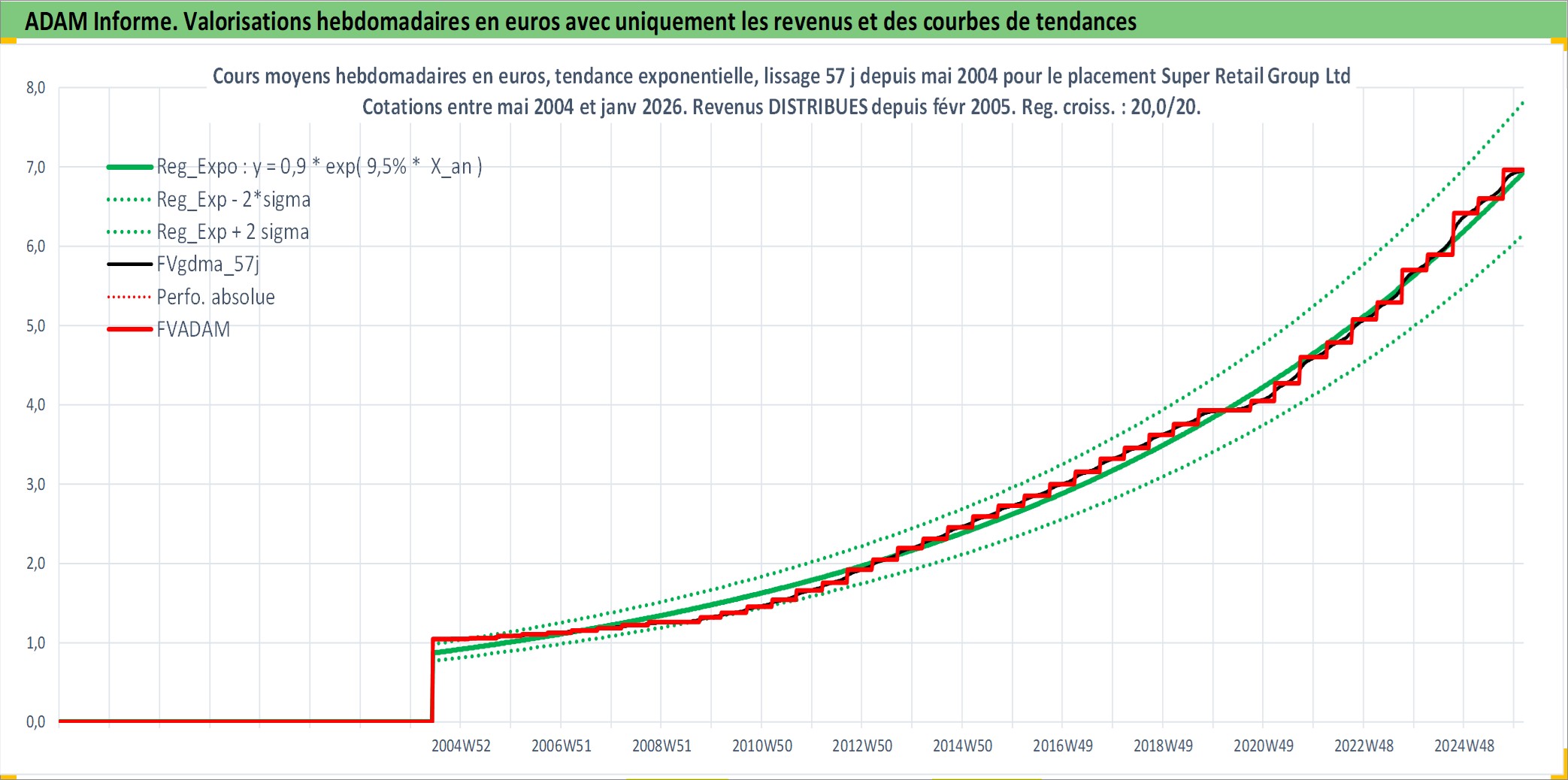 Site dédié aux investisseursPage dédiée sur site financeAnalyse des valorisations hebdomadaires de l'action Super Retail Group Ltd. Cet actif est cote en AUD. Les valorisations sont en contrevaleur EURO et couvrent les semaines 2004W23 a 2026W05. Les revenus de cet actif financier sont pris en compte depuis la semaine 2005W08. La note ESG de cet actif n'est pas connue.