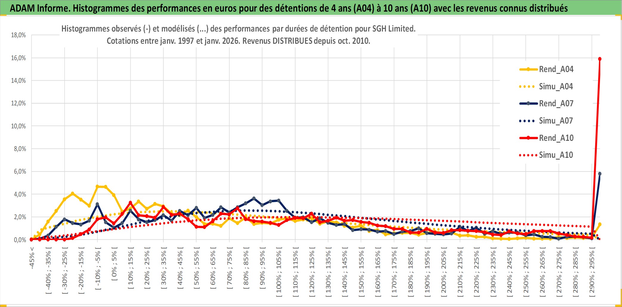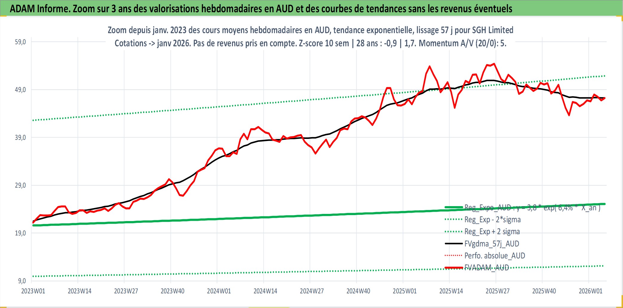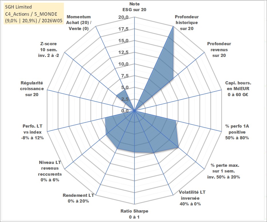 Site dédié aux investisseursPage dédiée sur site financeAnalyse des valorisations hebdomadaires de l'action SGH Limited. Cet actif est cote en AUD. Les valorisations sont en contrevaleur EURO et couvrent les semaines 1997W01 a 2026W05. Les revenus de cet actif financier sont pris en compte depuis la semaine 2010W39. La note ESG de cet actif n'est pas connue.