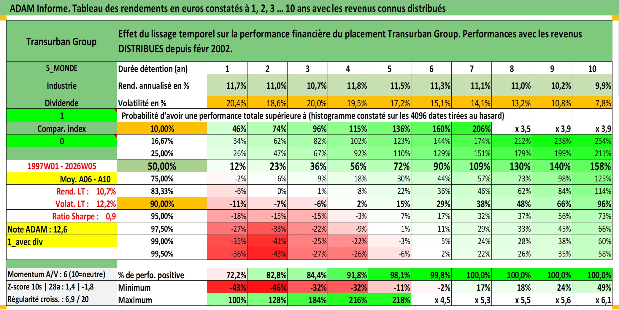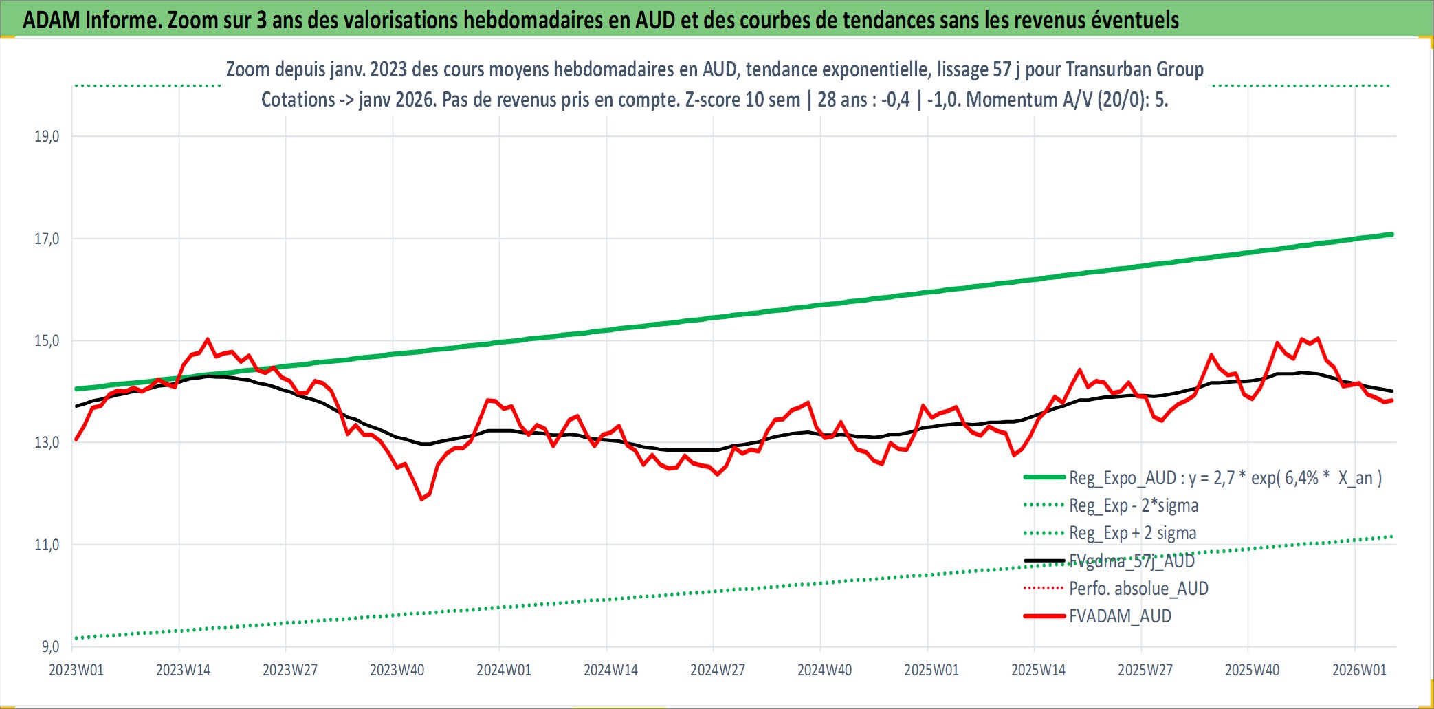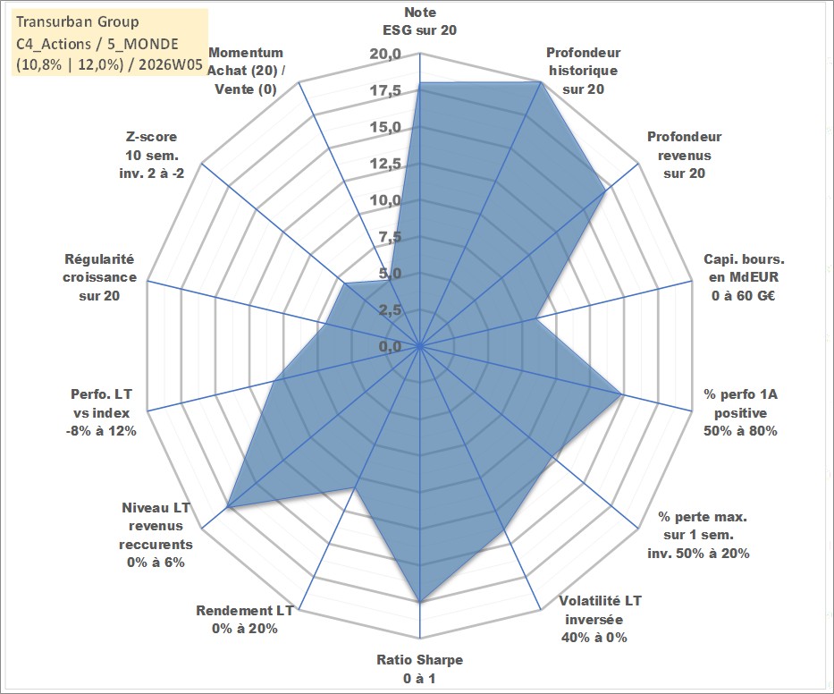 Site dédié aux investisseursPage dédiée sur site financeAnalyse des valorisations hebdomadaires de l'action Transurban Group. Cet actif est cote en AUD. Les valorisations sont en contrevaleur EURO et couvrent les semaines 1997W01 a 2026W05. Les revenus de cet actif financier sont pris en compte depuis la semaine 2002W06. La note globale ESG de cet actif est estimee a 18.0 (apres rebasage entre 0 et 20).