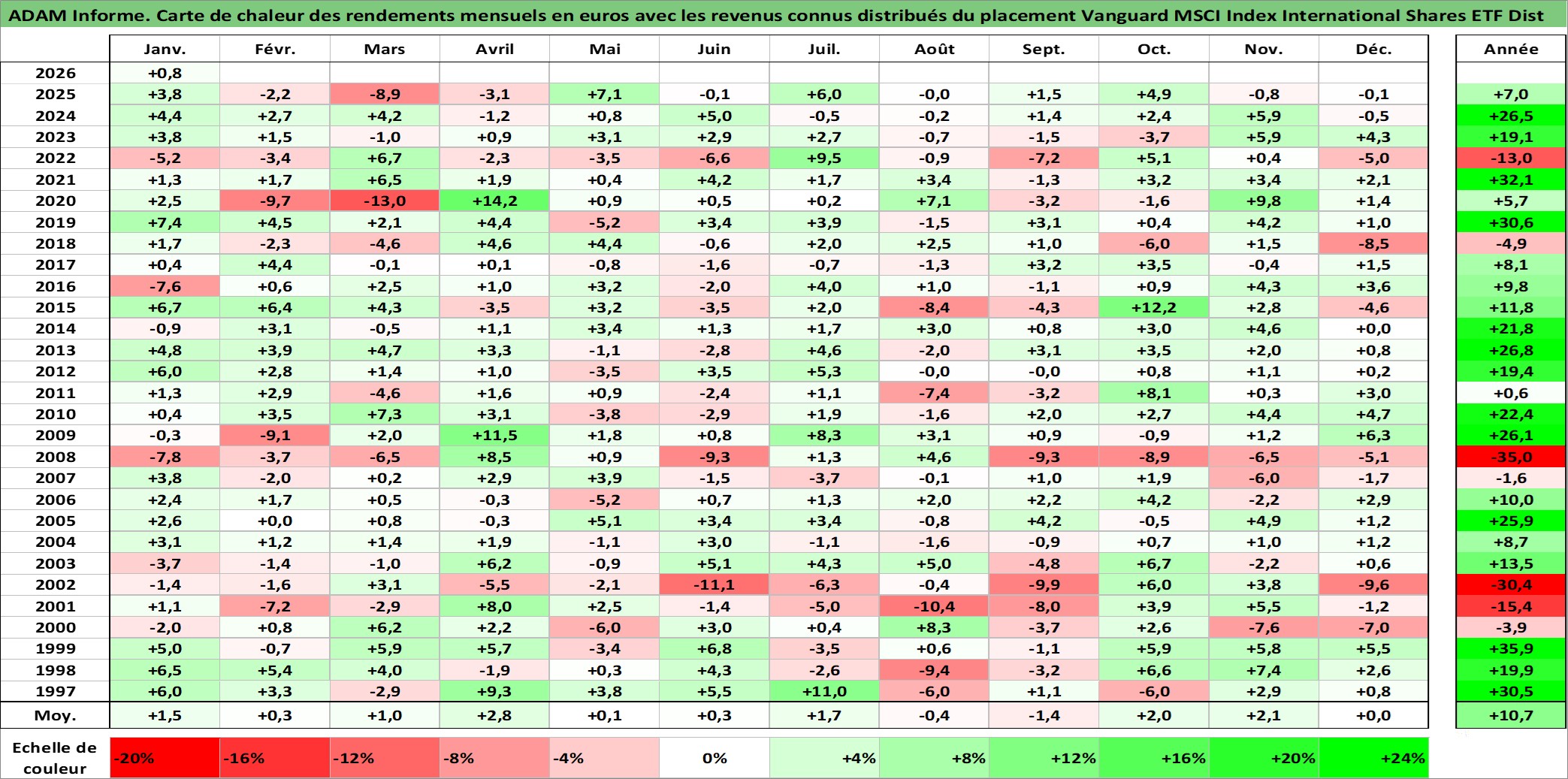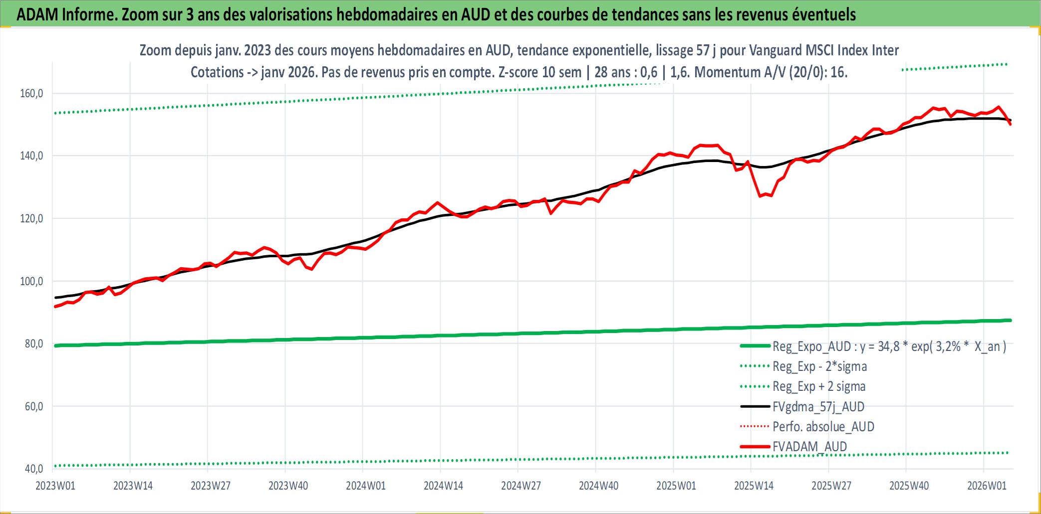 Site dédié aux investisseursPage dédiée sur site financeAnalyse des valorisations hebdomadaires du fonds Vanguard MSCI Index International Shares ETF Dist. Cet actif est cote en AUD. Les valorisations sont en contrevaleur EURO et couvrent les semaines 1997W01 a 2026W05. Les revenus de cet actif financier sont pris en compte depuis la semaine 1997W02. La note ESG de cet actif n'est pas connue.