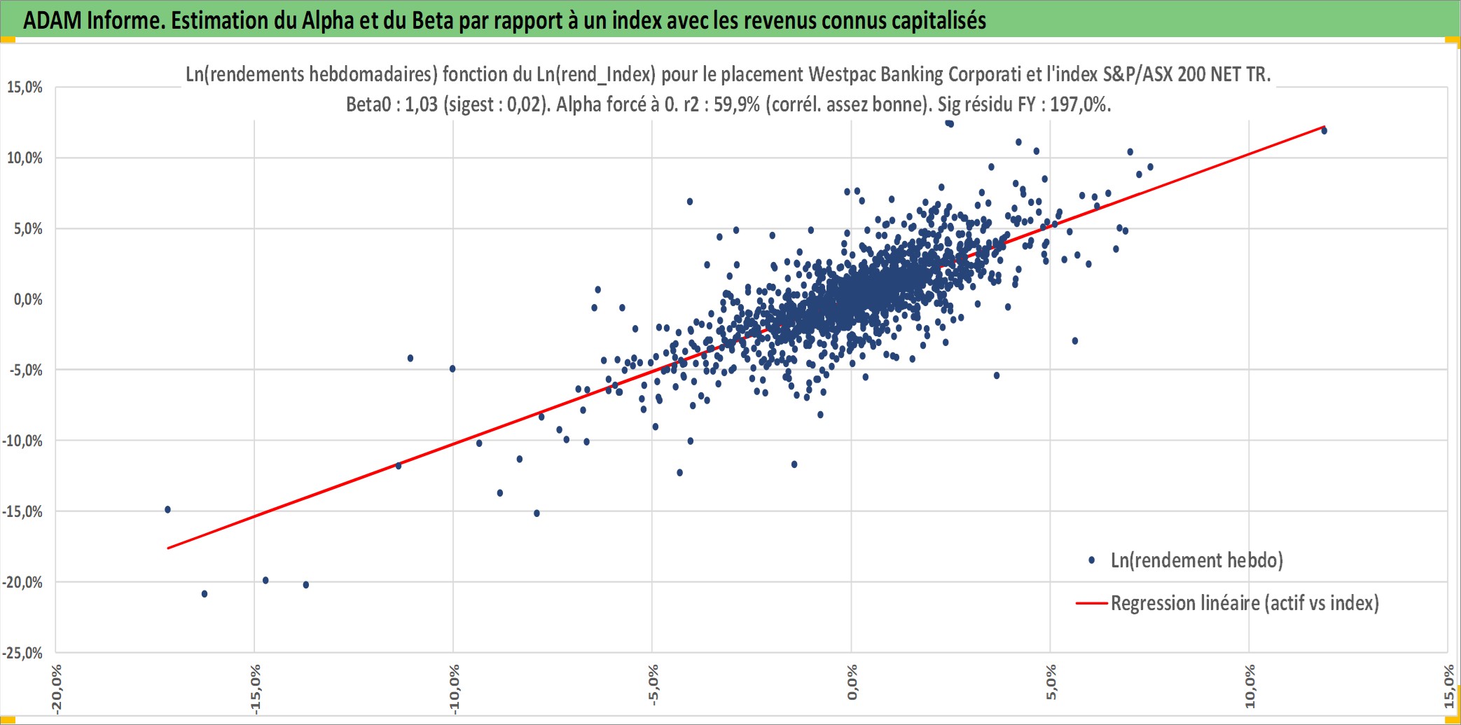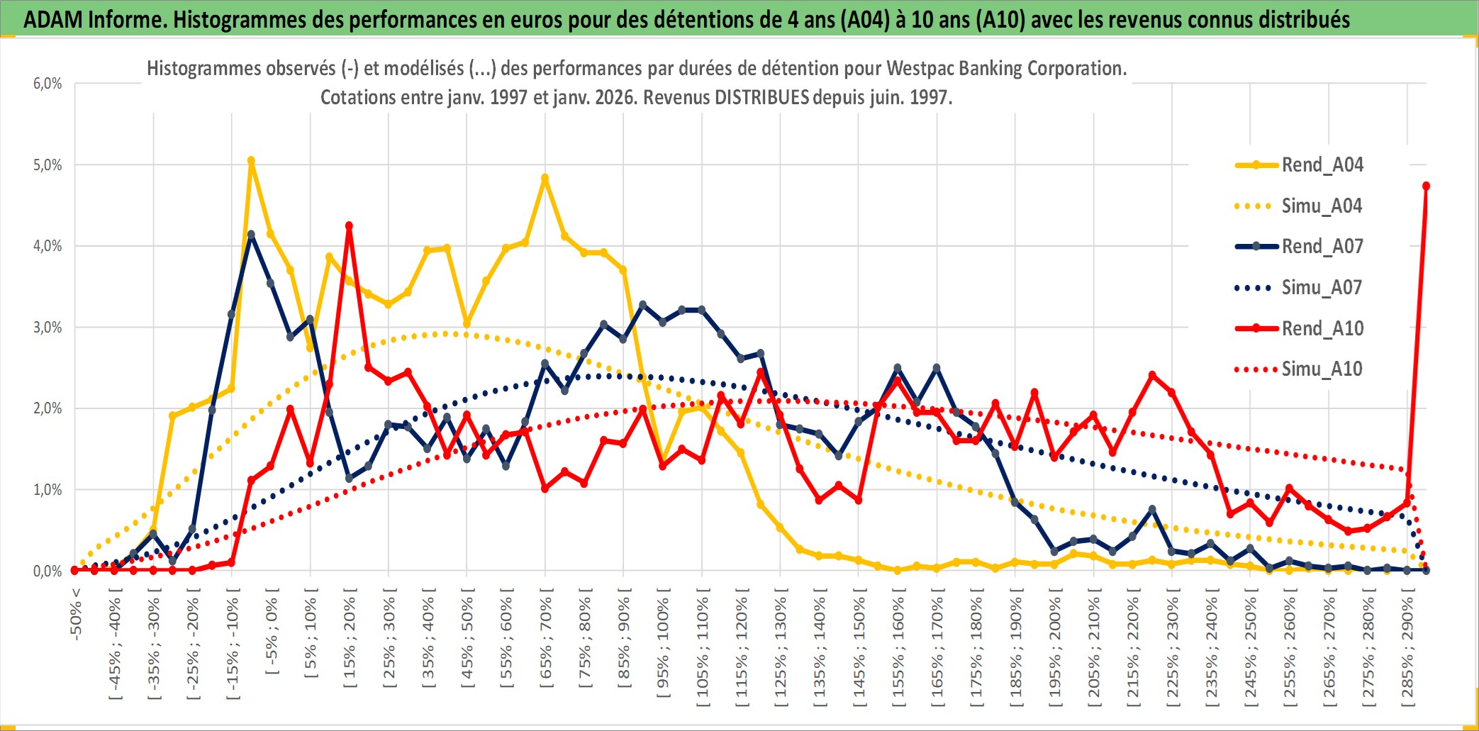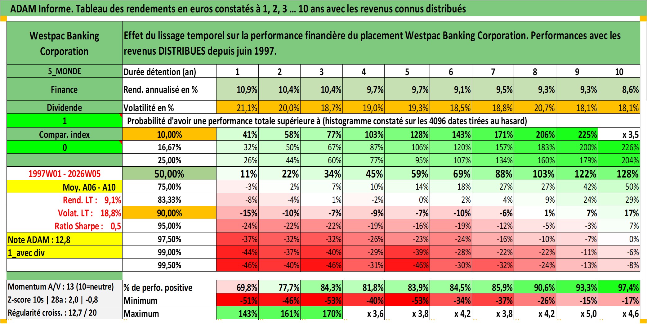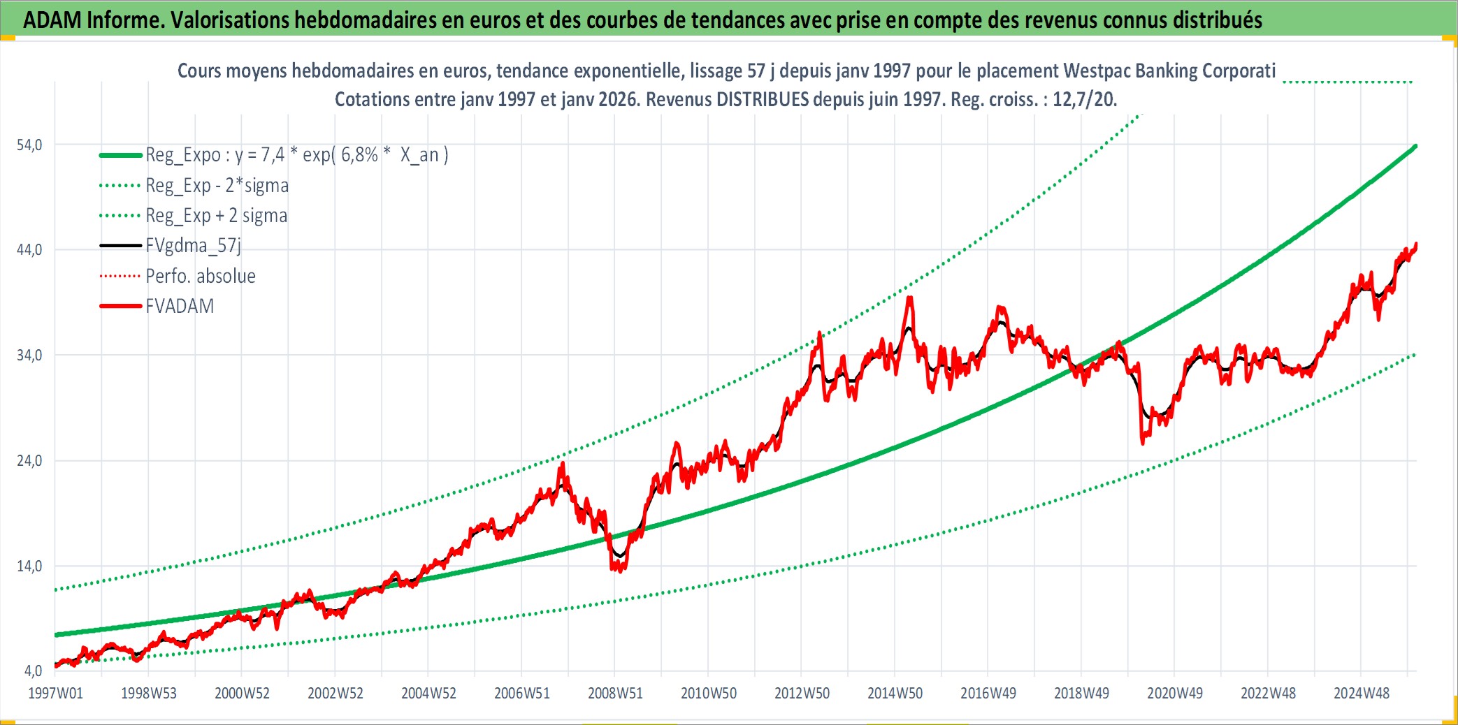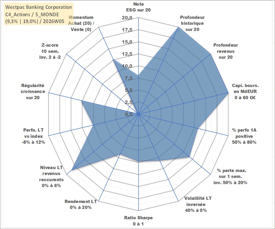Site dédié aux investisseursPage dédiée sur site financeAnalyse des valorisations hebdomadaires de l'action Westpac Banking Corporation. Cet actif est cote en AUD. Les valorisations sont en contrevaleur EURO et couvrent les semaines 1997W01 a 2026W05. Les revenus de cet actif financier sont pris en compte depuis la semaine 1997W23. La note globale ESG de cet actif est estimee a 8.0 (apres rebasage entre 0 et 20).