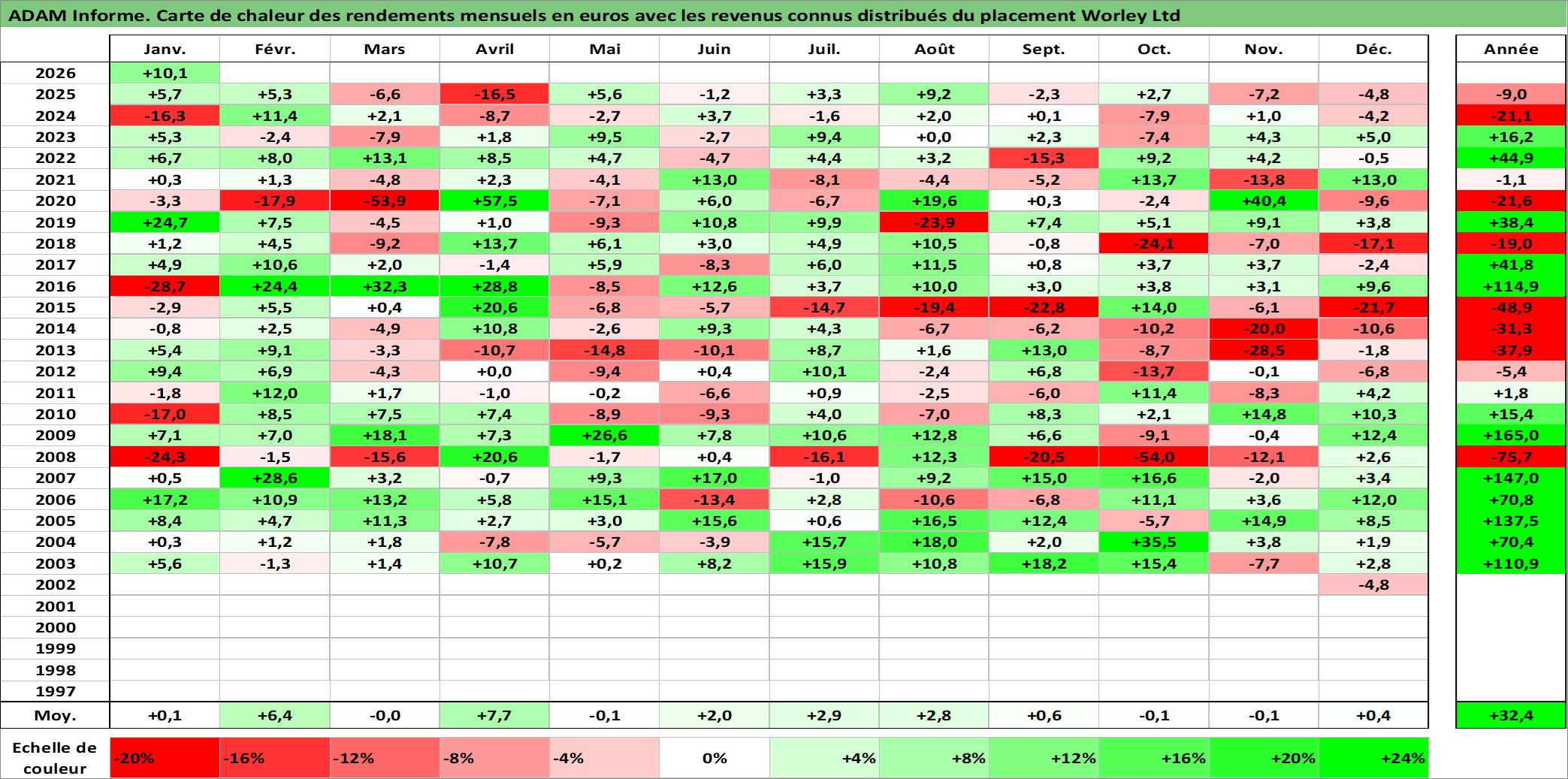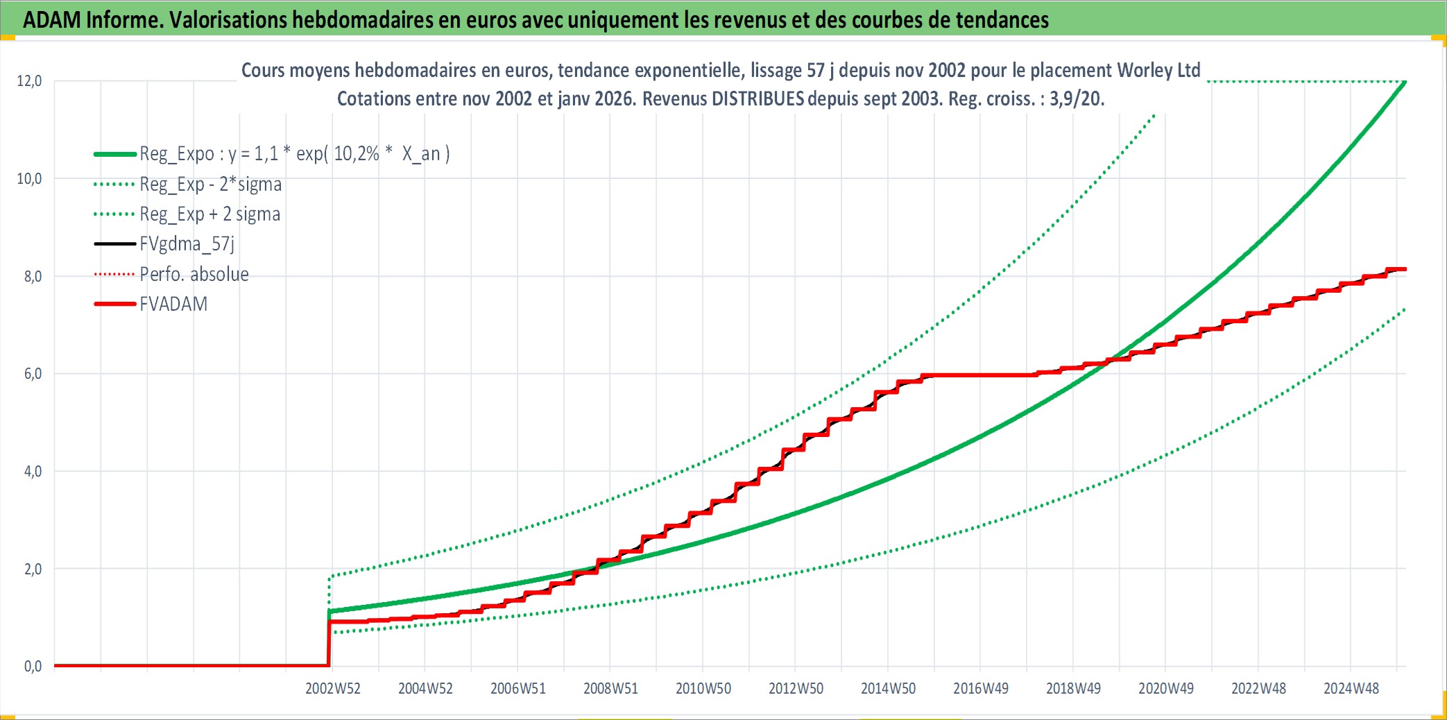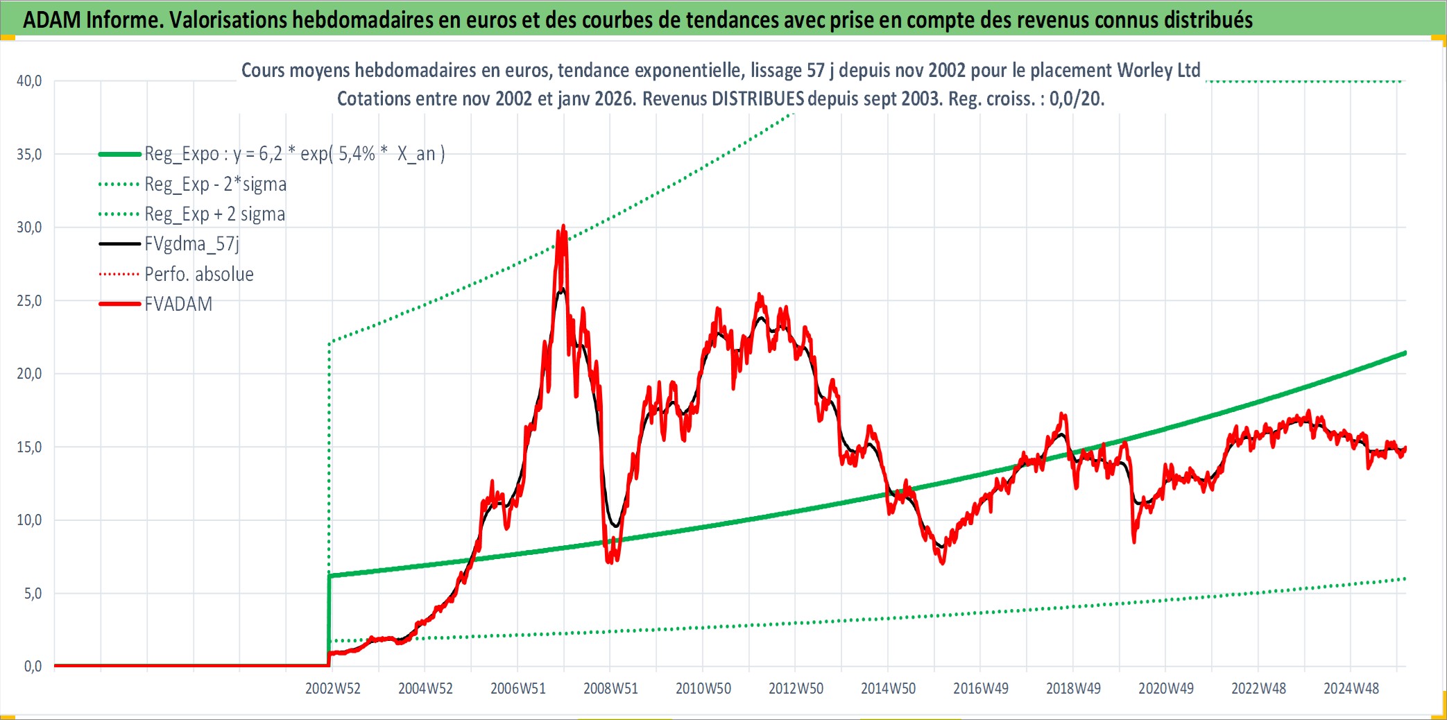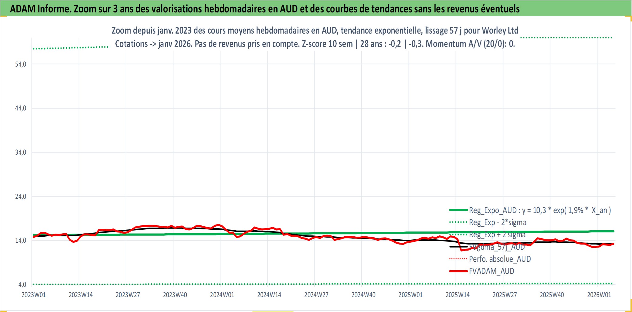 Site dédié aux investisseursPage dédiée sur site financeAnalyse des valorisations hebdomadaires de l'action Worley Ltd. Cet actif est cote en AUD. Les valorisations sont en contrevaleur EURO et couvrent les semaines 2002W48 a 2026W05. Les revenus de cet actif financier sont pris en compte depuis la semaine 2003W40. La note ESG de cet actif n'est pas connue.