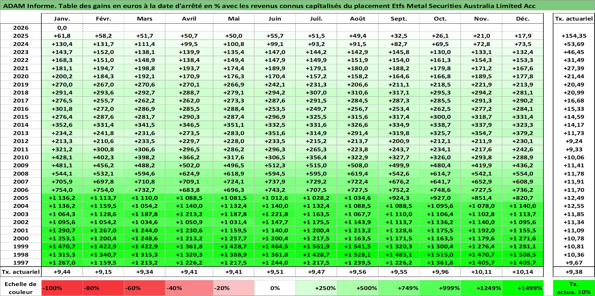 Site dédié aux investisseursPage dédiée sur site financeAnalyse des valorisations hebdomadaires du fonds Etfs Metal Securities Australia Limited Acc. Cet actif est cote en AUD. Les valorisations sont en contrevaleur EURO et couvrent les semaines 1997W01 a 2026W05. Les revenus de cet actif financier sont pris en compte depuis la semaine 1997W01. La note ESG de cet actif n'est pas connue.