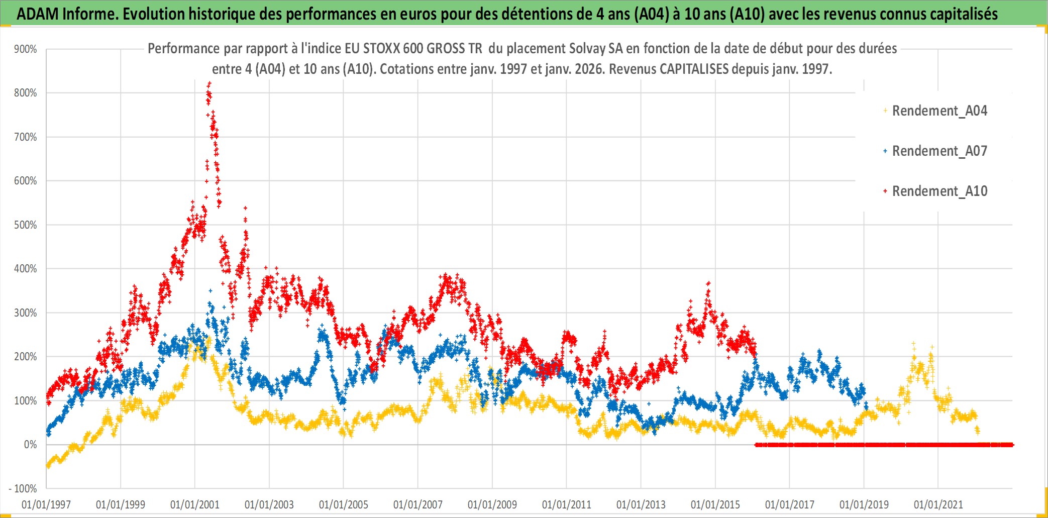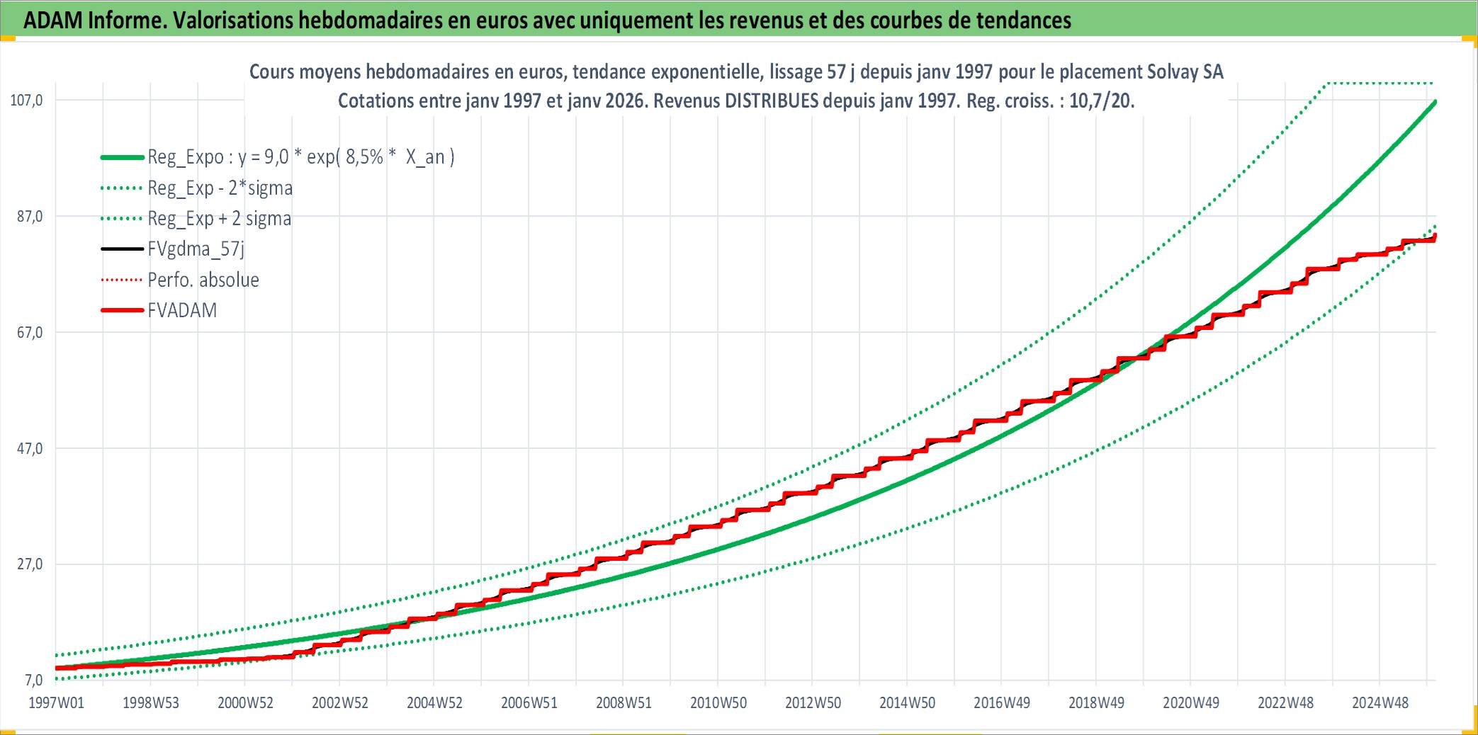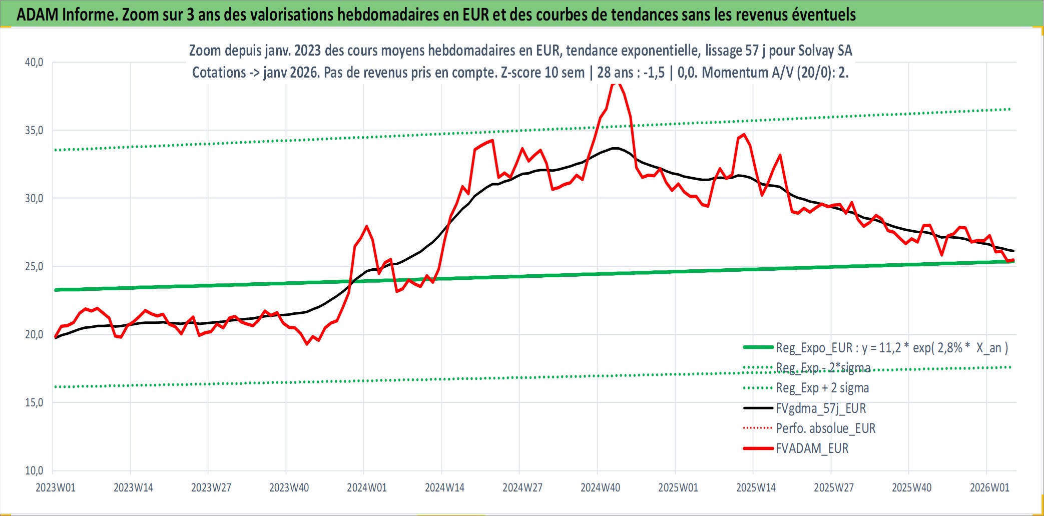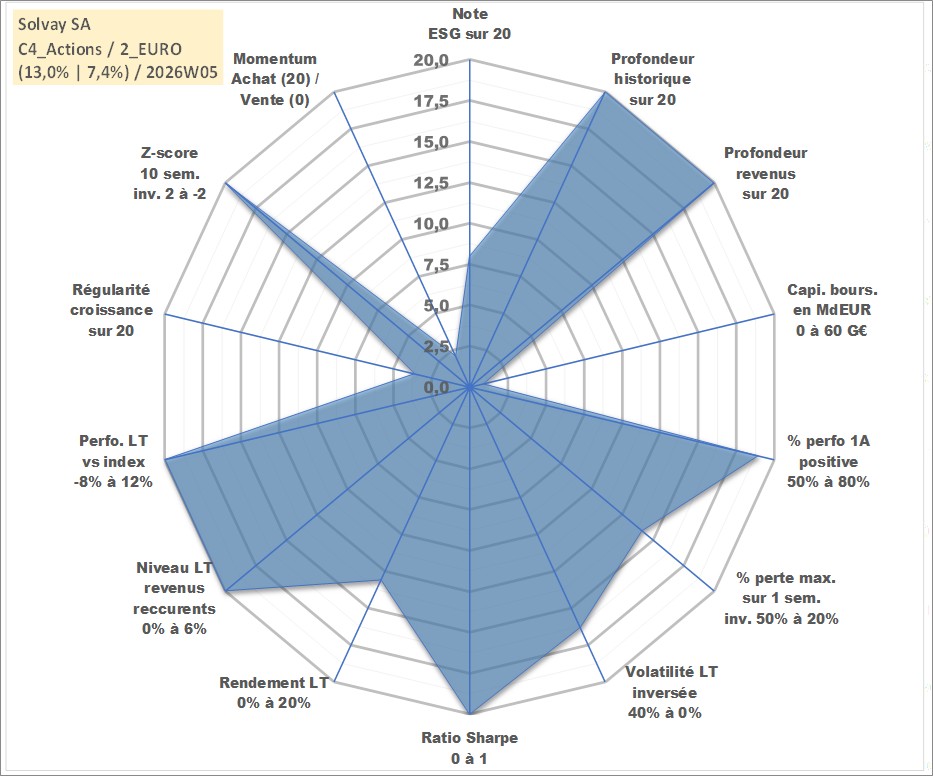 Site dédié aux investisseursPage dédiée sur site financeAnalyse des valorisations hebdomadaires de l'action Solvay SA. Cet actif est cote en EUR. Les valorisations couvrent les semaines 1997W01 a 2026W05. Les revenus de cet actif financier sont pris en compte depuis la semaine 1997W04. La note globale ESG de cet actif est estimee a 8.0 (apres rebasage entre 0 et 20).