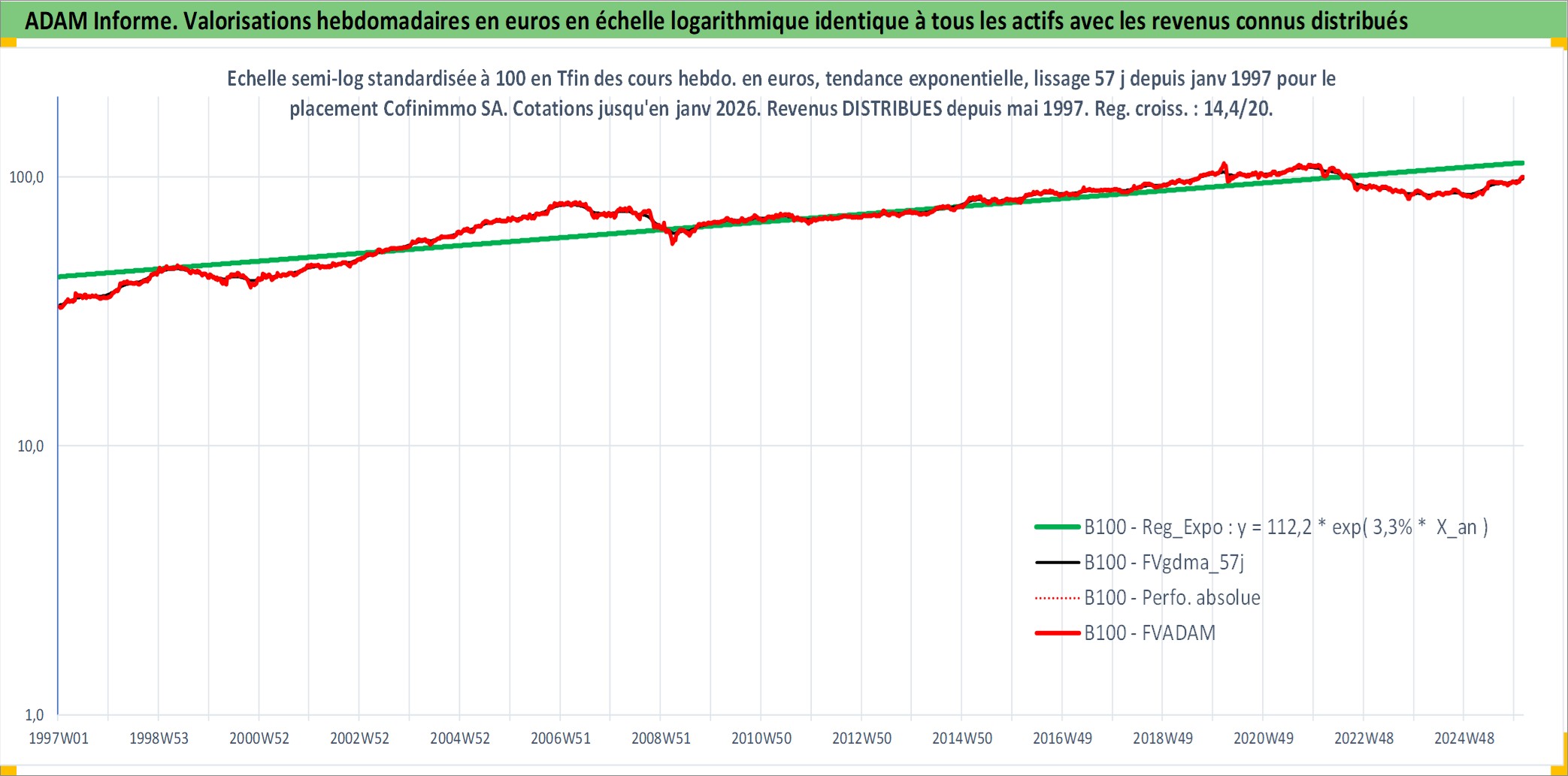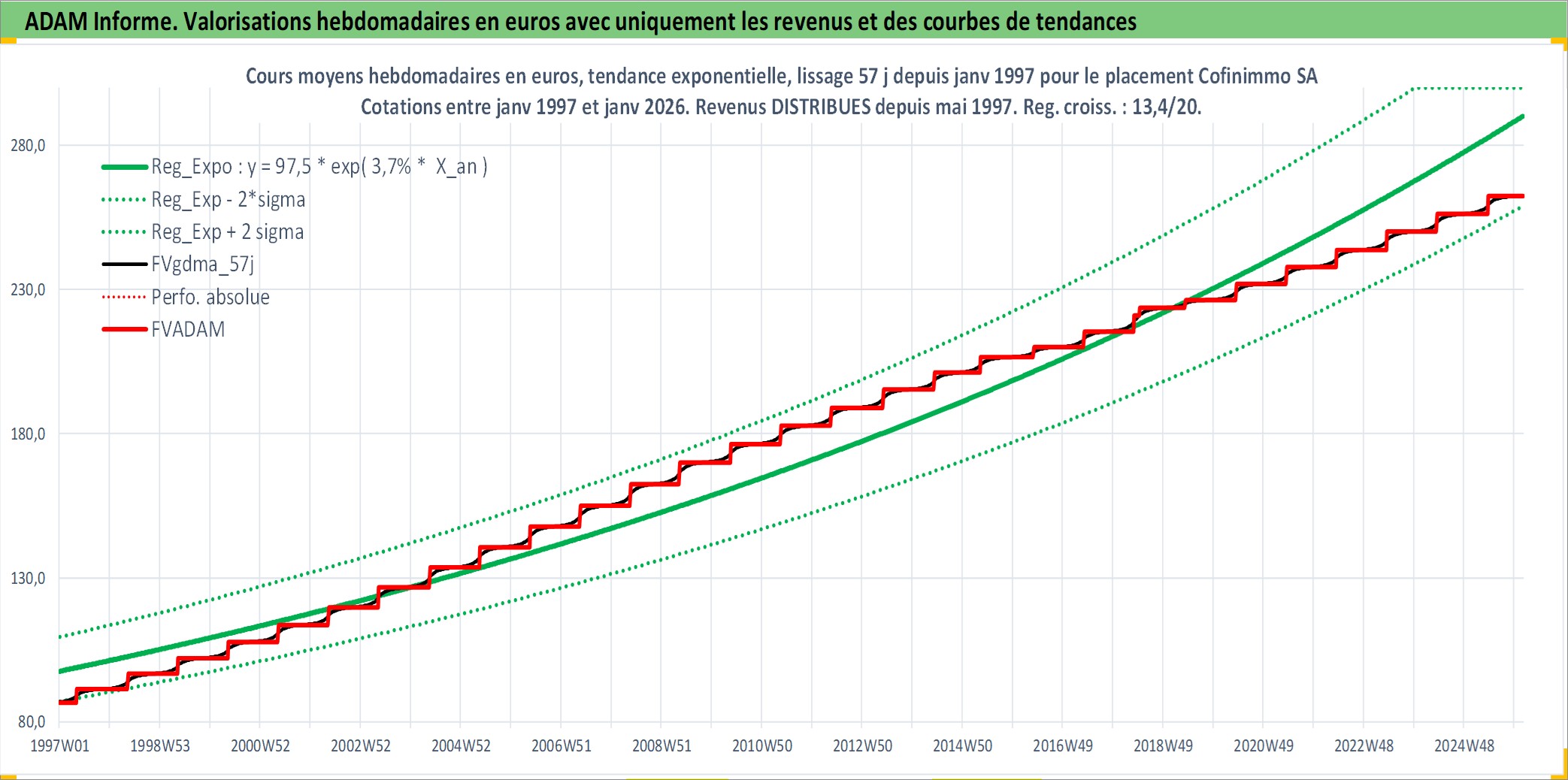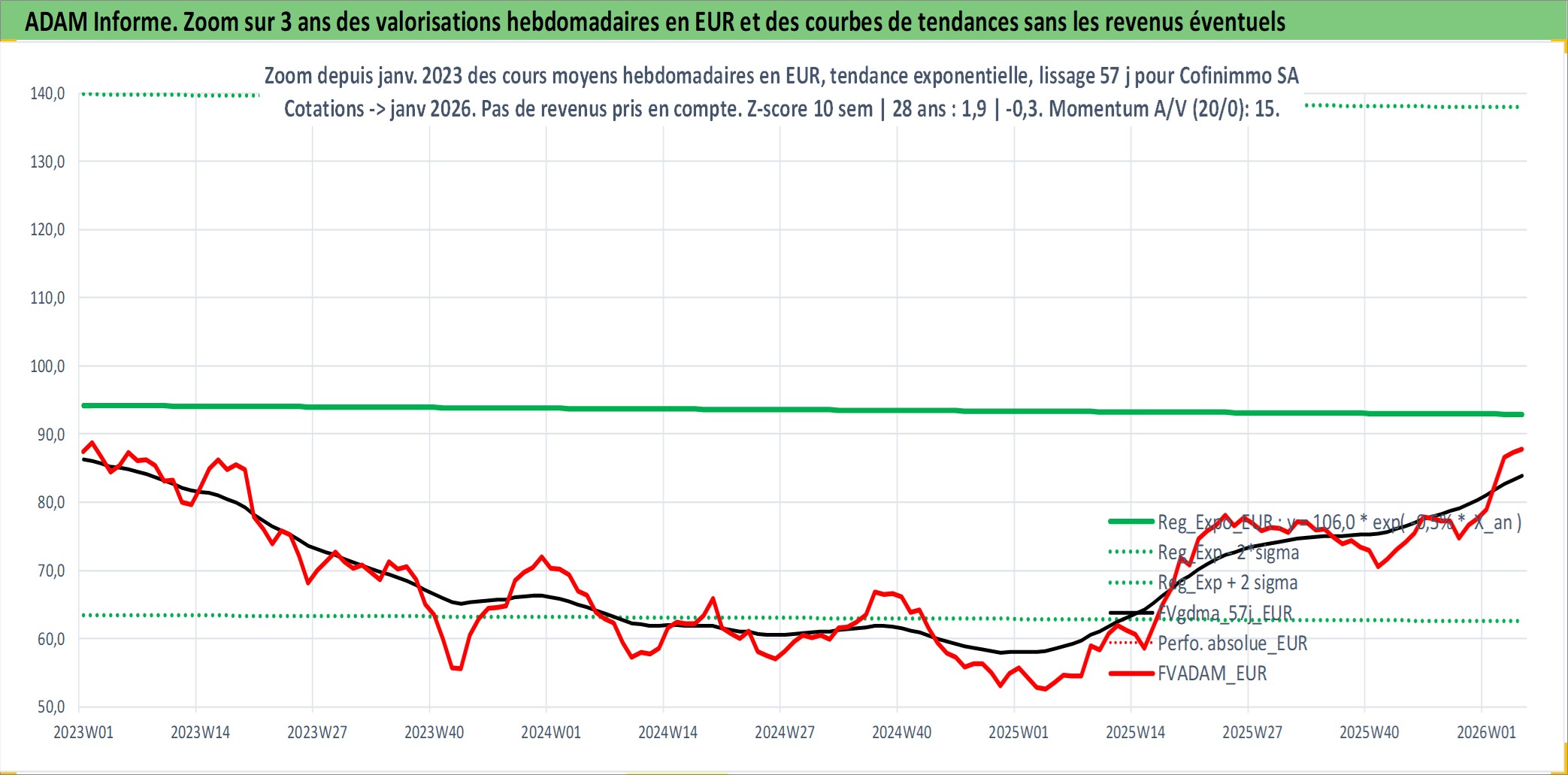 Site dédié aux investisseursPage dédiée sur site financeAnalyse des valorisations hebdomadaires de l'action Cofinimmo SA. Cet actif est cote en EUR. Les valorisations couvrent les semaines 1997W01 a 2026W05. Les revenus de cet actif financier sont pris en compte depuis la semaine 1997W19. La note ESG de cet actif n'est pas connue.