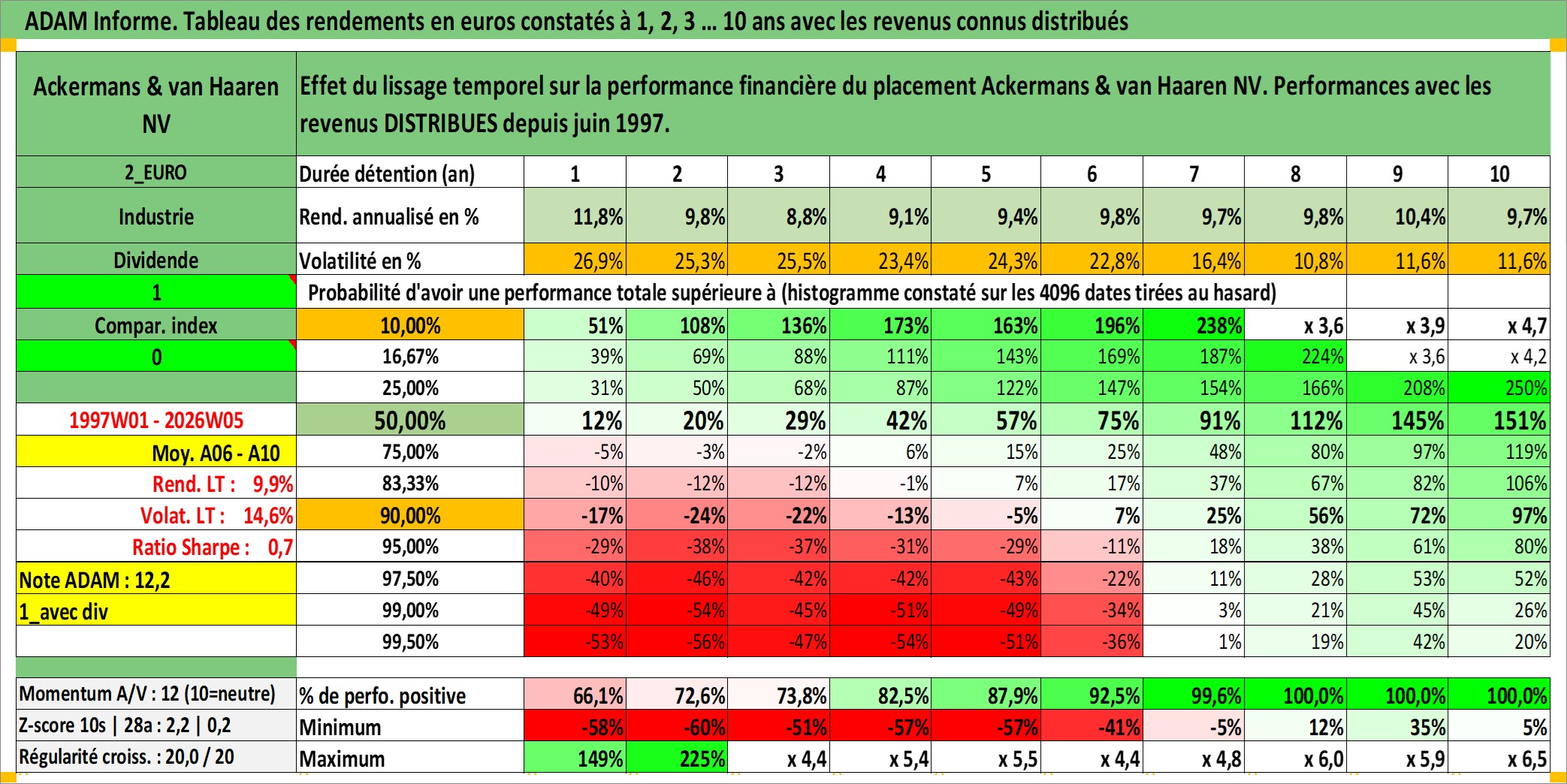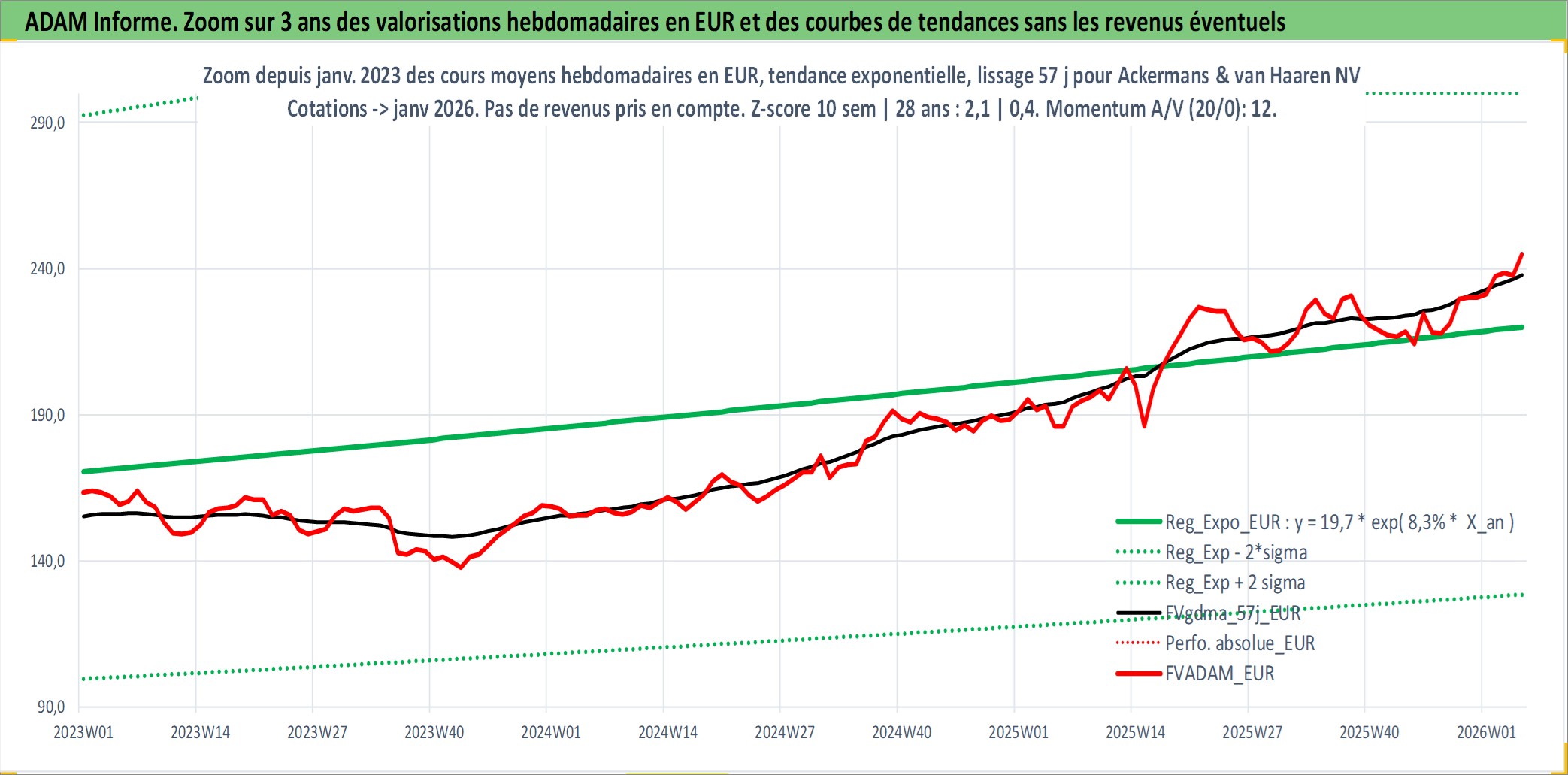 Site dédié aux investisseursPage dédiée sur site financeAnalyse des valorisations hebdomadaires de l'action Ackermans & van Haaren NV. Cet actif est cote en EUR. Les valorisations couvrent les semaines 1997W01 a 2026W05. Les revenus de cet actif financier sont pris en compte depuis la semaine 1997W24. La note ESG de cet actif n'est pas connue.