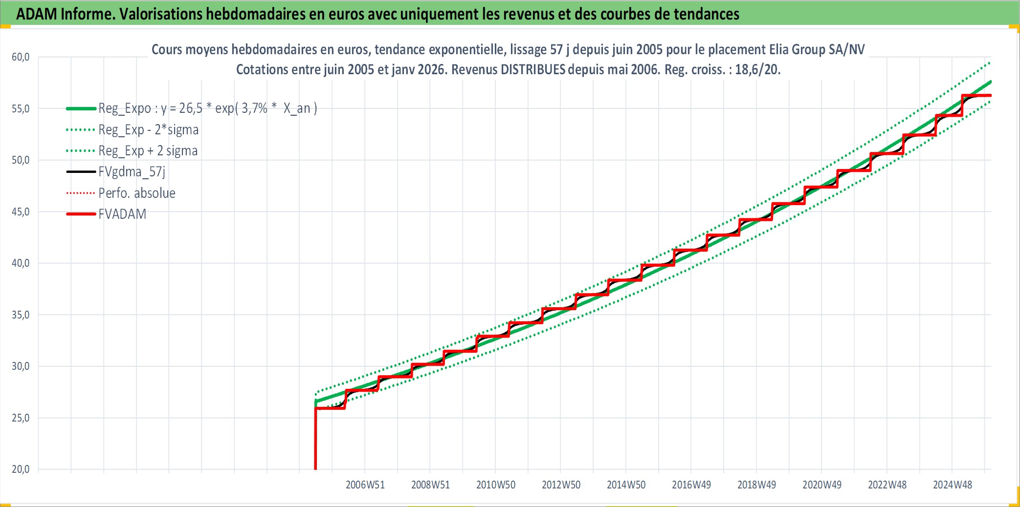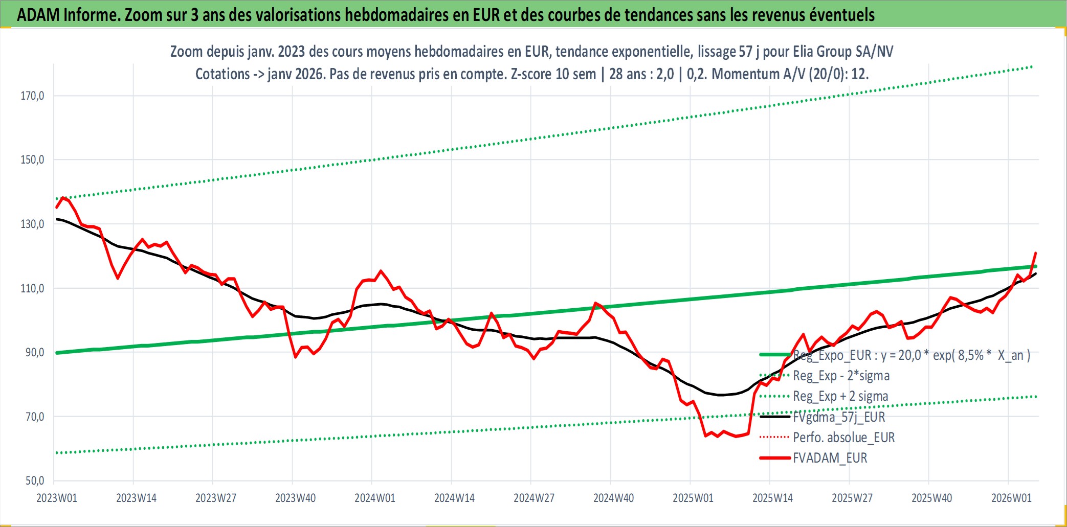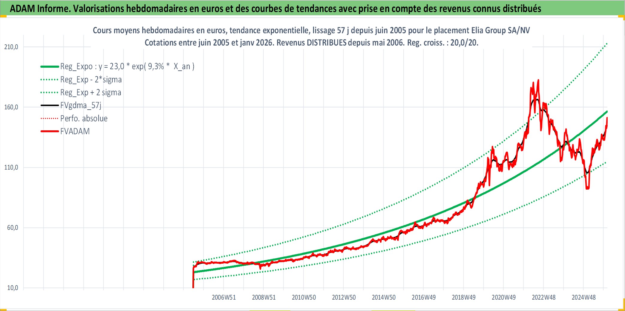 Site dédié aux investisseursPage dédiée sur site financeAnalyse des valorisations hebdomadaires de l'action Elia Group SA/NV. Cet actif est cote en EUR. Les valorisations couvrent les semaines 2005W24 a 2026W05. Les revenus de cet actif financier sont pris en compte depuis la semaine 2006W19. La note ESG de cet actif n'est pas connue.