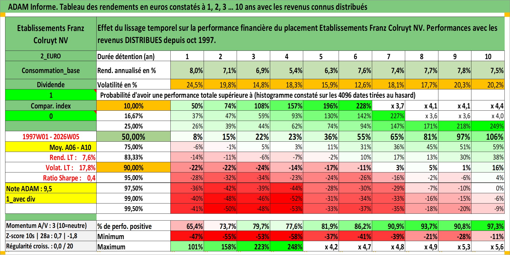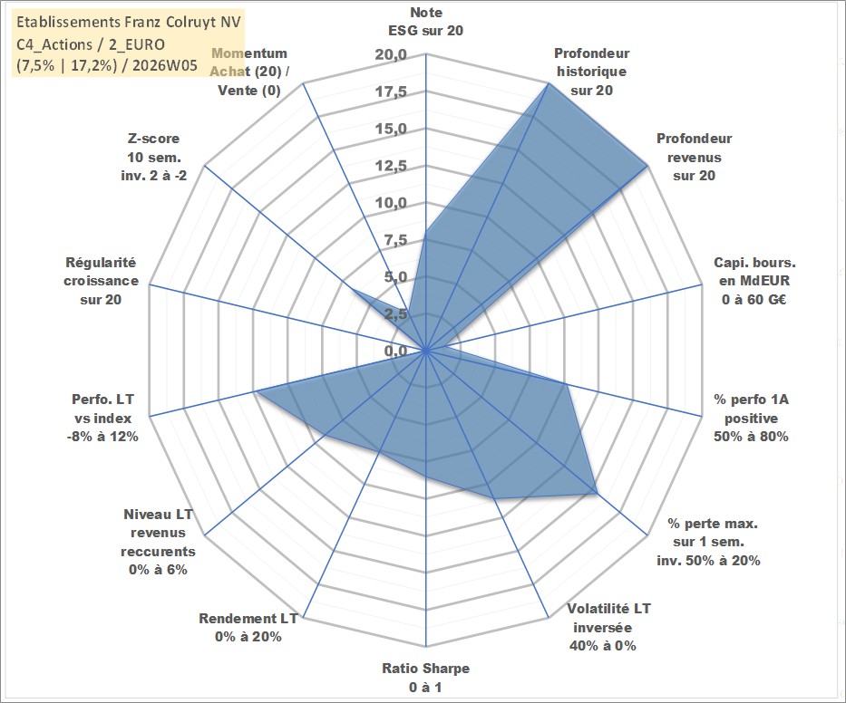 Site dédié aux investisseursPage dédiée sur site financeAnalyse des valorisations hebdomadaires de l'action Etablissements Franz Colruyt NV. Cet actif est cote en EUR. Les valorisations couvrent les semaines 1997W01 a 2026W05. Les revenus de cet actif financier sont pris en compte depuis la semaine 1997W41. La note globale ESG de cet actif est estimee a 8.0 (apres rebasage entre 0 et 20).