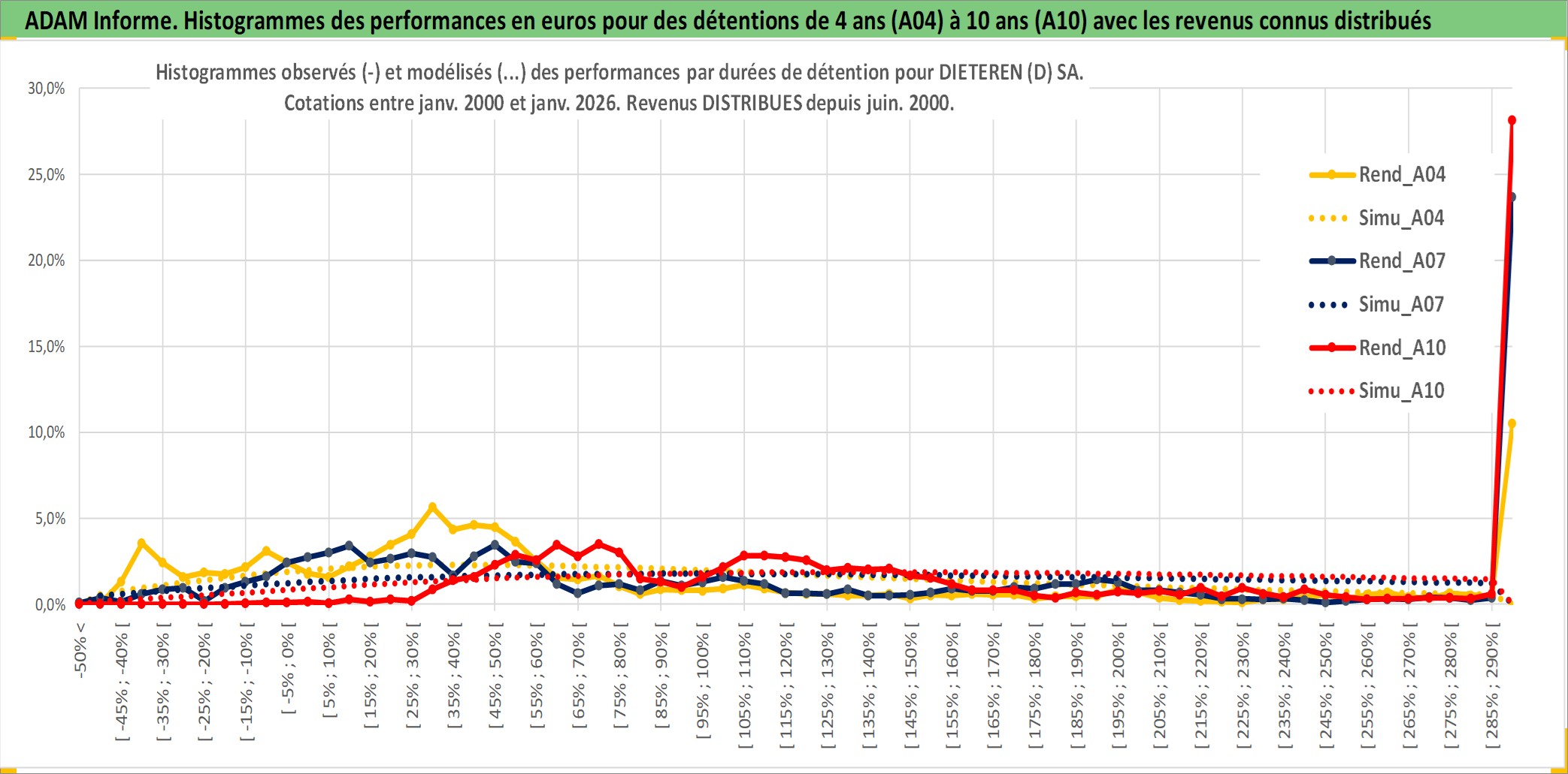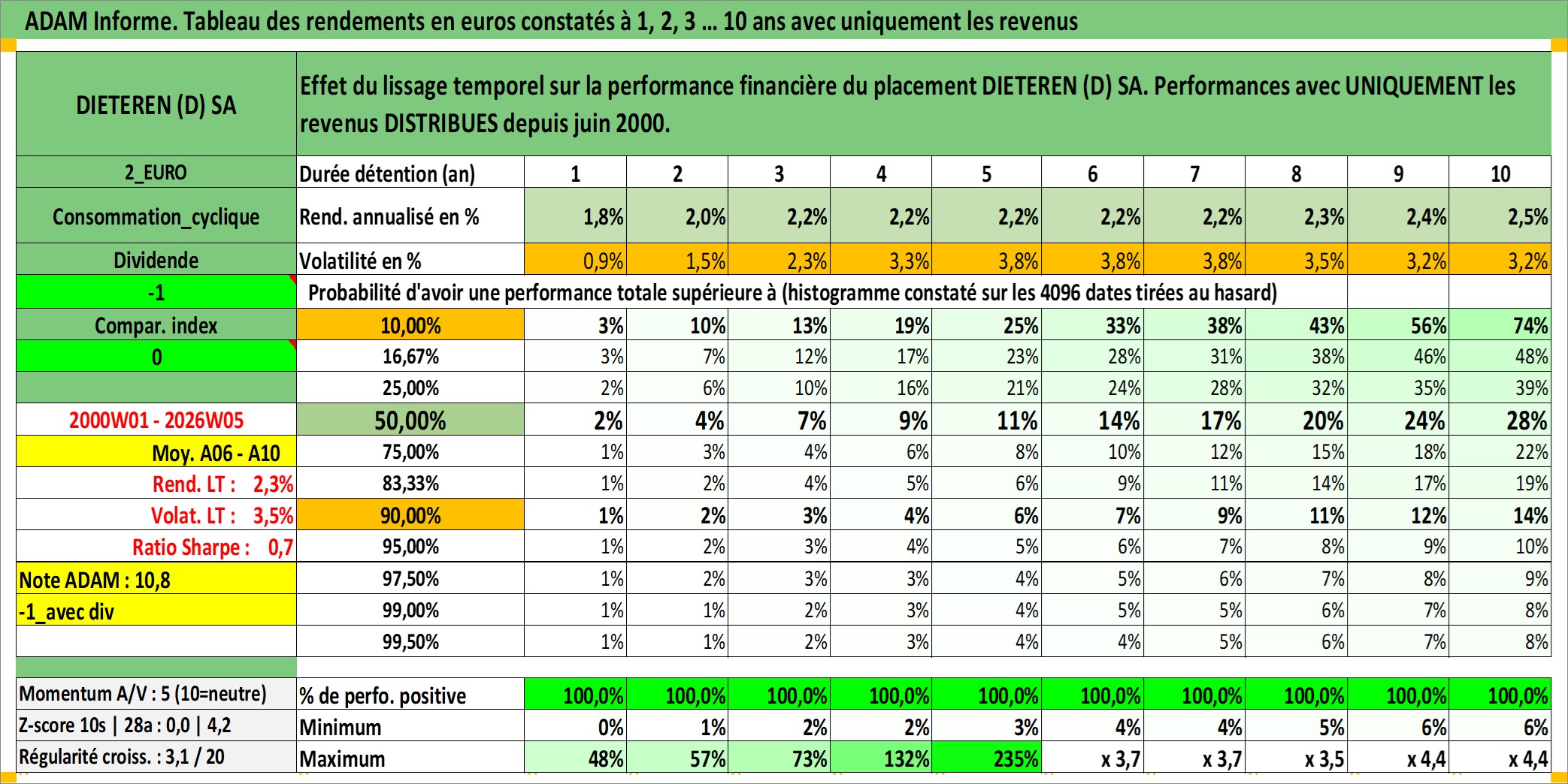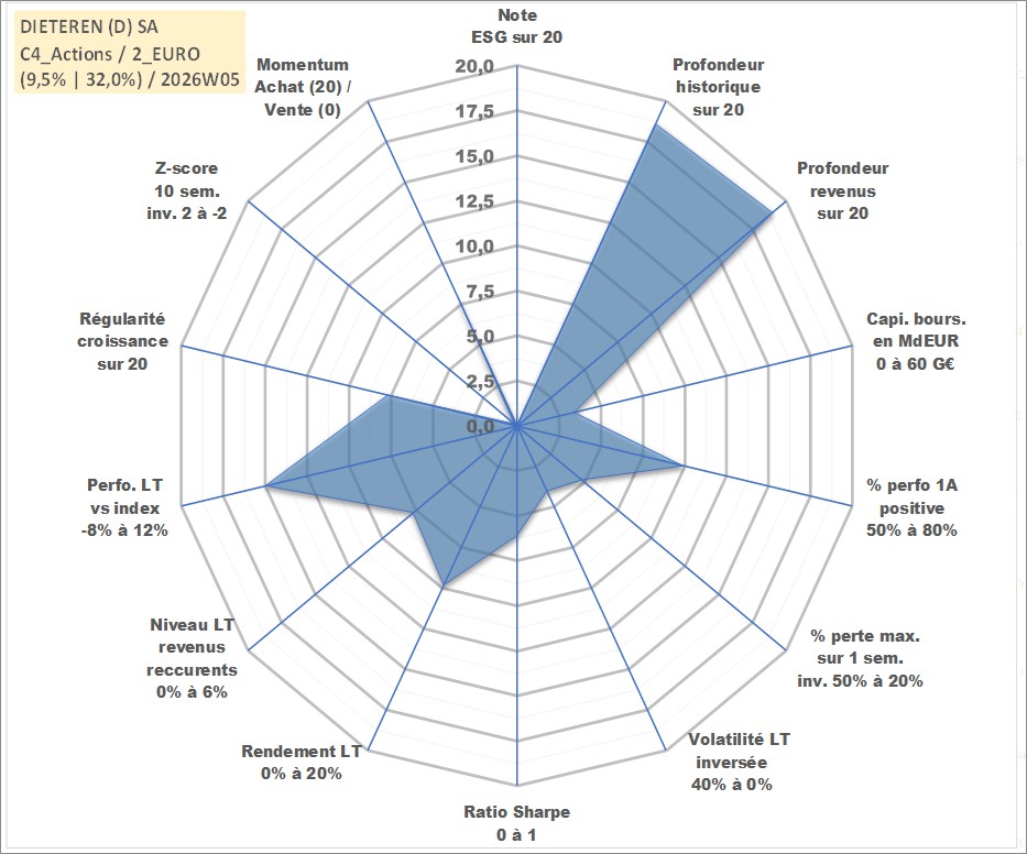 Site dédié aux investisseursPage dédiée sur site financeAnalyse des valorisations hebdomadaires de l'action DIETEREN (D) SA. Cet actif est cote en EUR. Les valorisations couvrent les semaines 2000W01 a 2026W05. Les revenus de cet actif financier sont pris en compte depuis la semaine 2000W24. La note ESG de cet actif n'est pas connue.