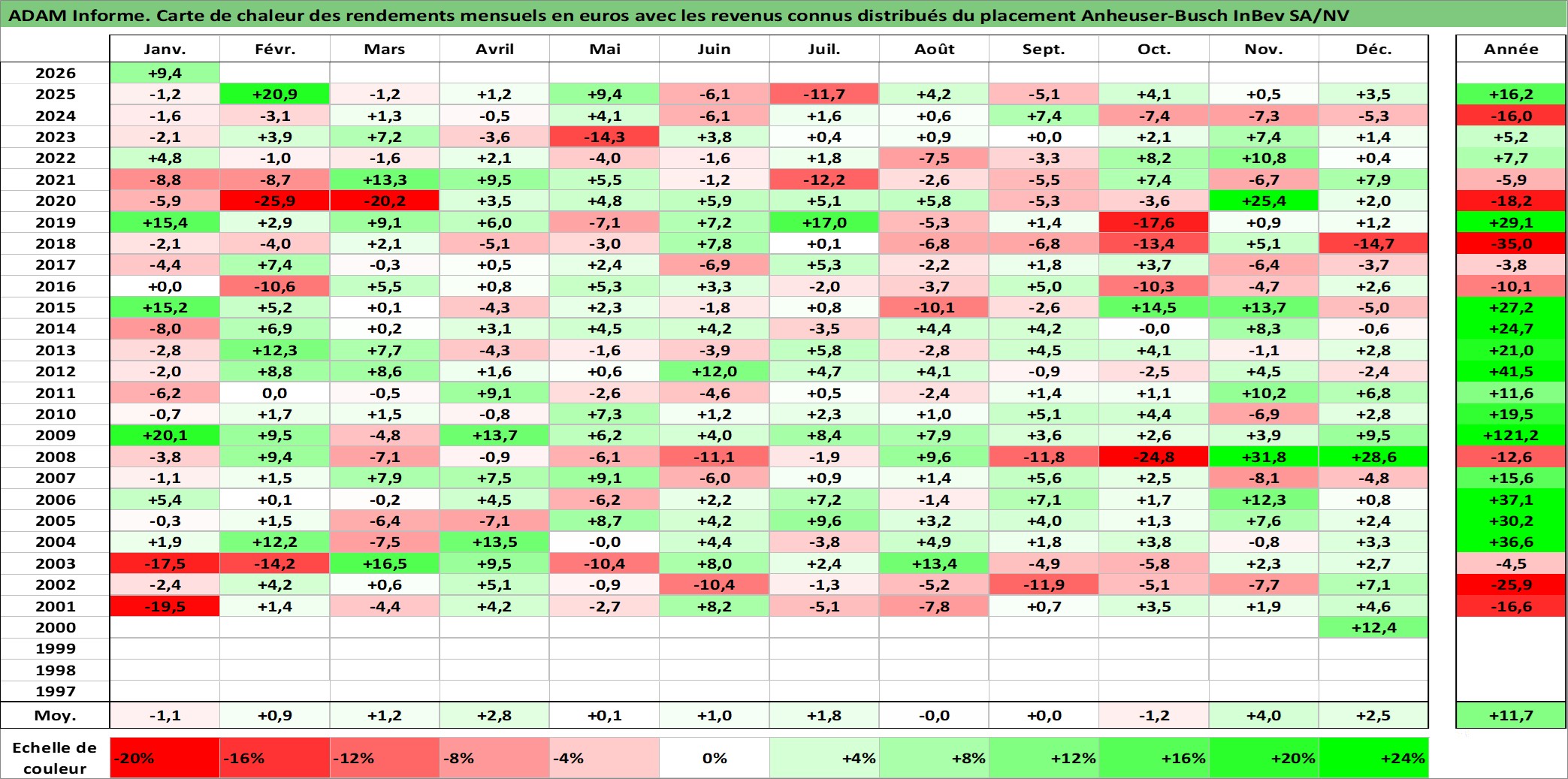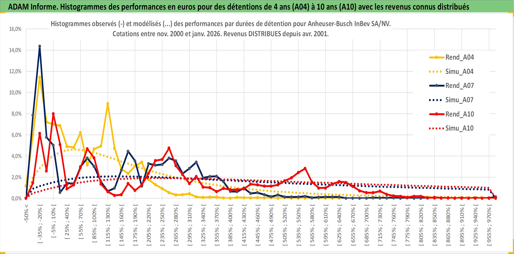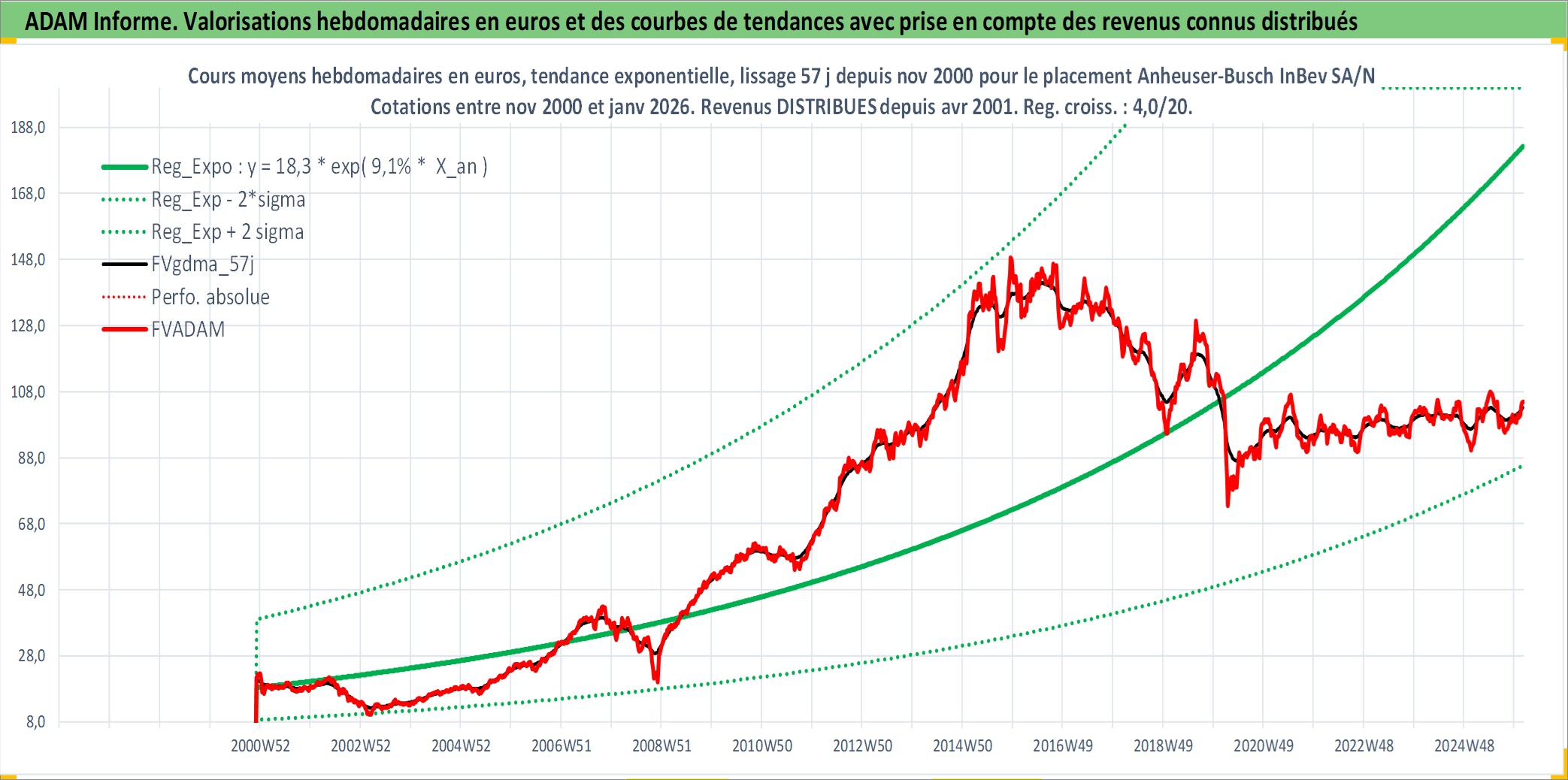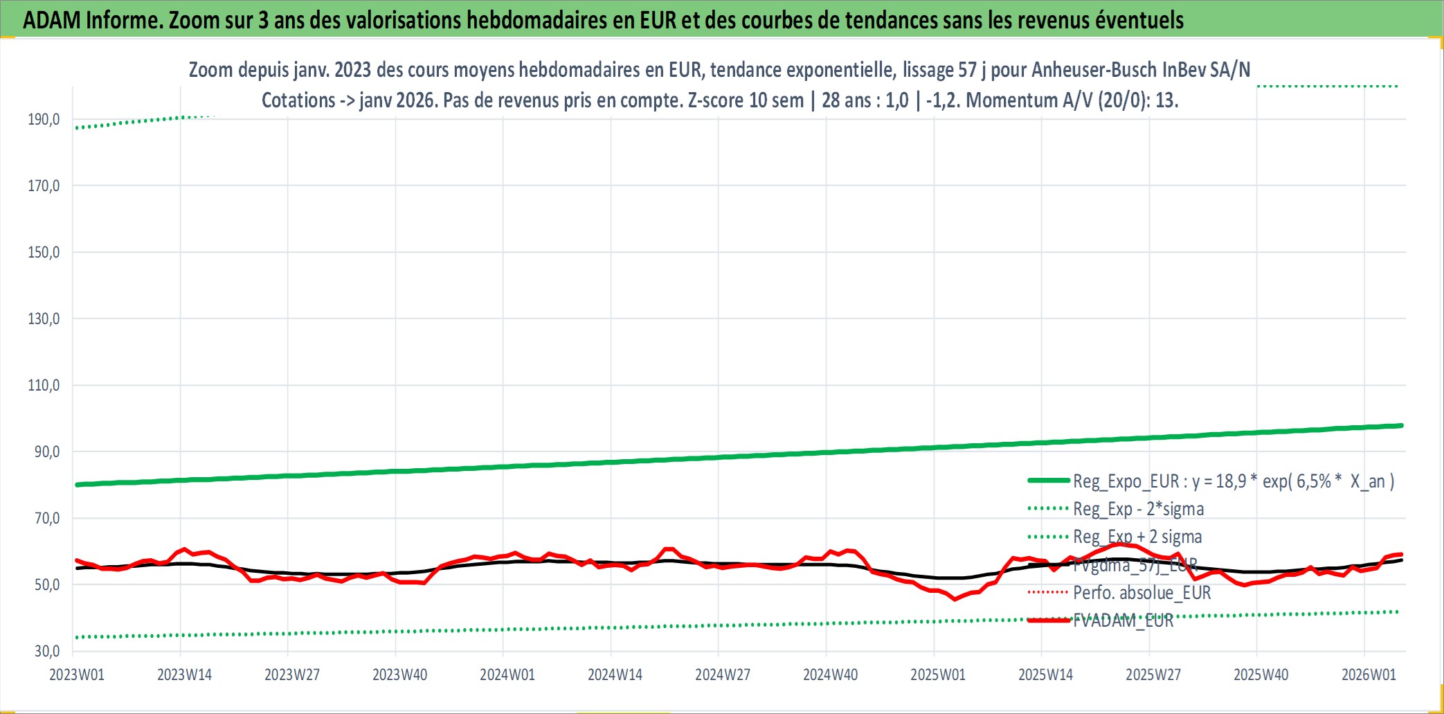 Site dédié aux investisseursPage dédiée sur site financeAnalyse des valorisations hebdomadaires de l'action Anheuser-Busch InBev SA/NV. Cet actif est cote en EUR. Les valorisations couvrent les semaines 2000W48 a 2026W05. Les revenus de cet actif financier sont pris en compte depuis la semaine 2001W17. La note globale ESG de cet actif est estimee a 10.0 (apres rebasage entre 0 et 20).