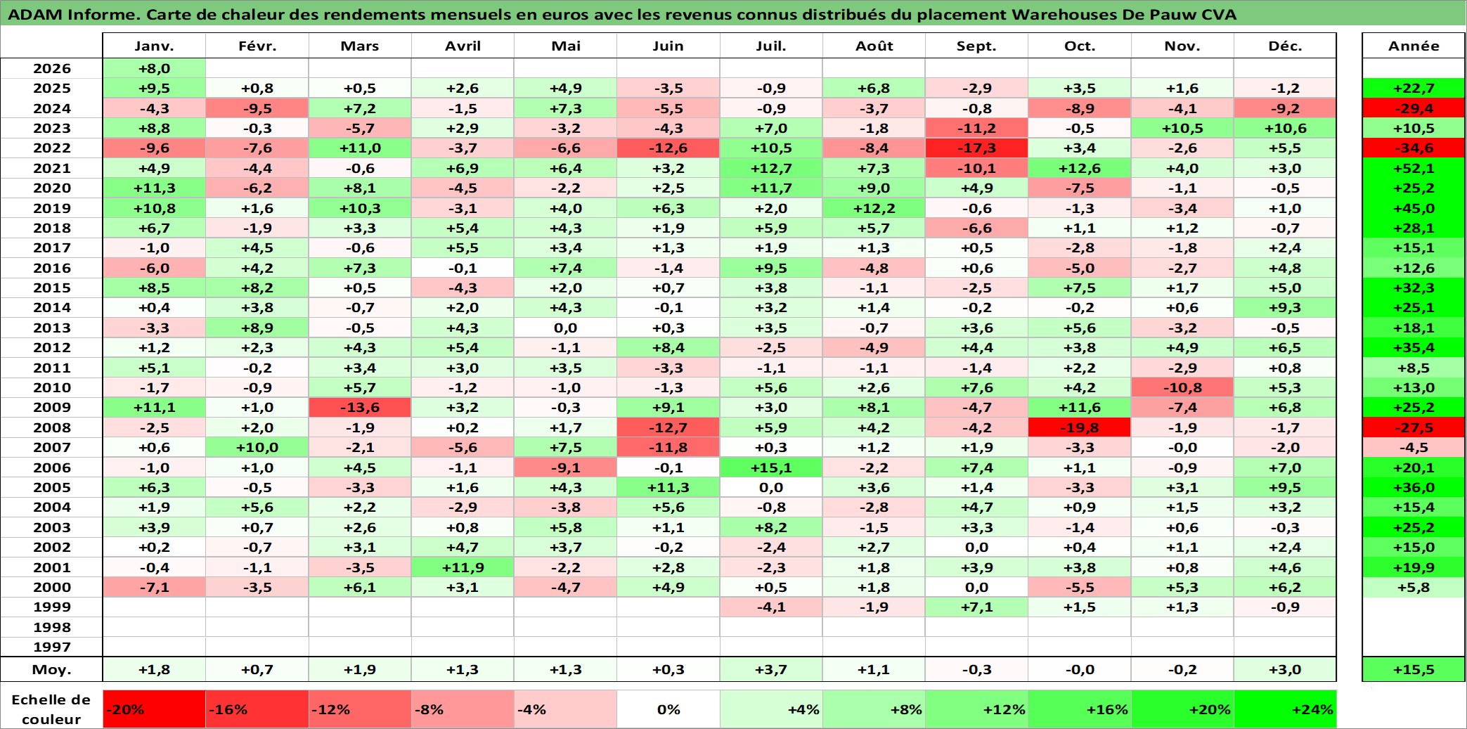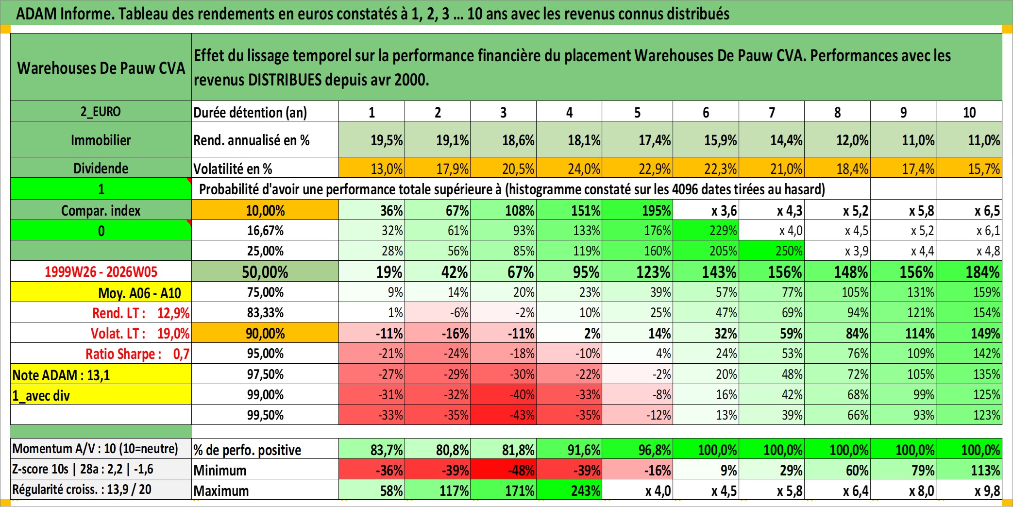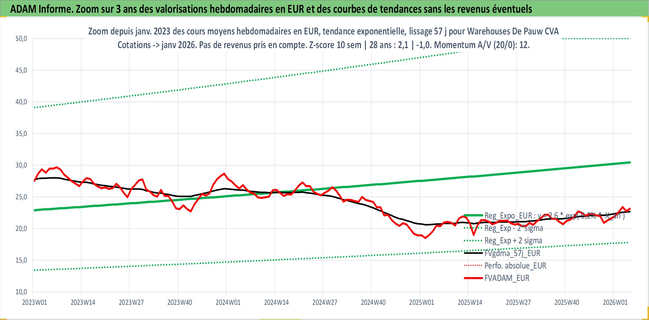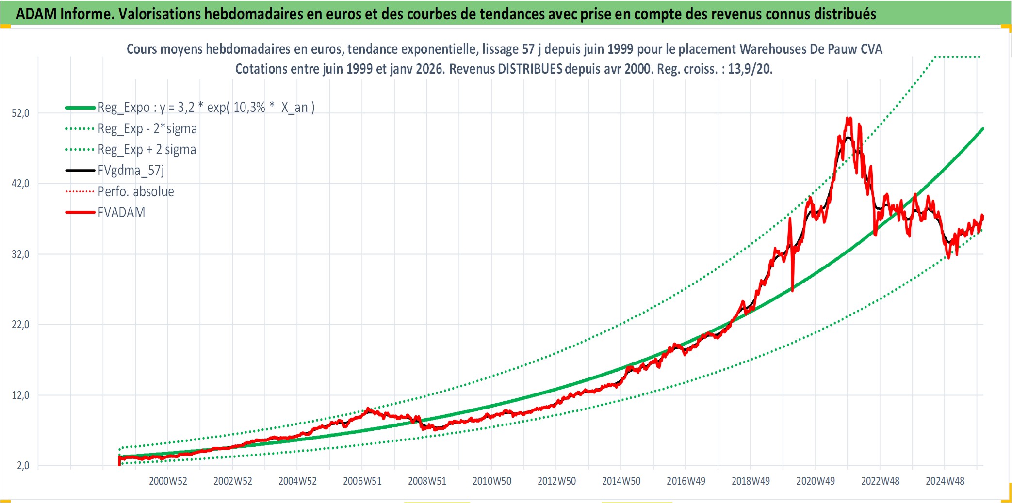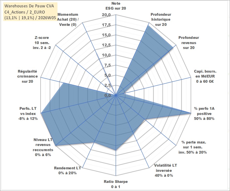 Site dédié aux investisseursPage dédiée sur site financeAnalyse des valorisations hebdomadaires de l'action Warehouses De Pauw CVA. Cet actif est cote en EUR. Les valorisations couvrent les semaines 1999W26 a 2026W05. Les revenus de cet actif financier sont pris en compte depuis la semaine 2000W15. La note ESG de cet actif n'est pas connue.