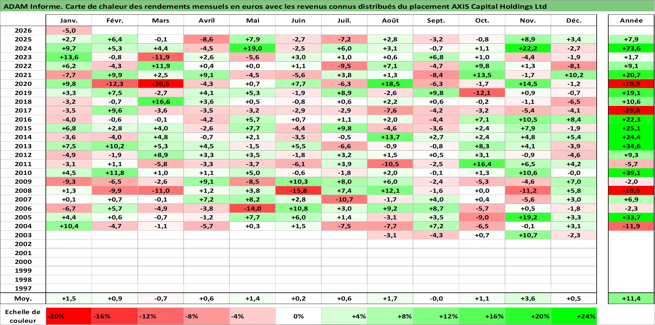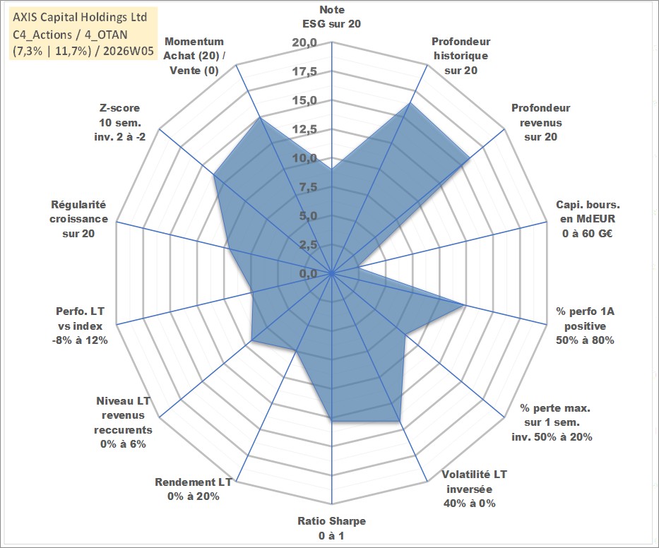 Site dédié aux investisseursPage dédiée sur site financeAnalyse des valorisations hebdomadaires de l'action AXIS Capital Holdings Ltd. Cet actif est cote en USD. Les valorisations sont en contrevaleur EURO et couvrent les semaines 2003W27 a 2026W05. Les revenus de cet actif financier sont pris en compte depuis la semaine 2003W39. La note globale ESG de cet actif est estimee a 9.0 (apres rebasage entre 0 et 20).