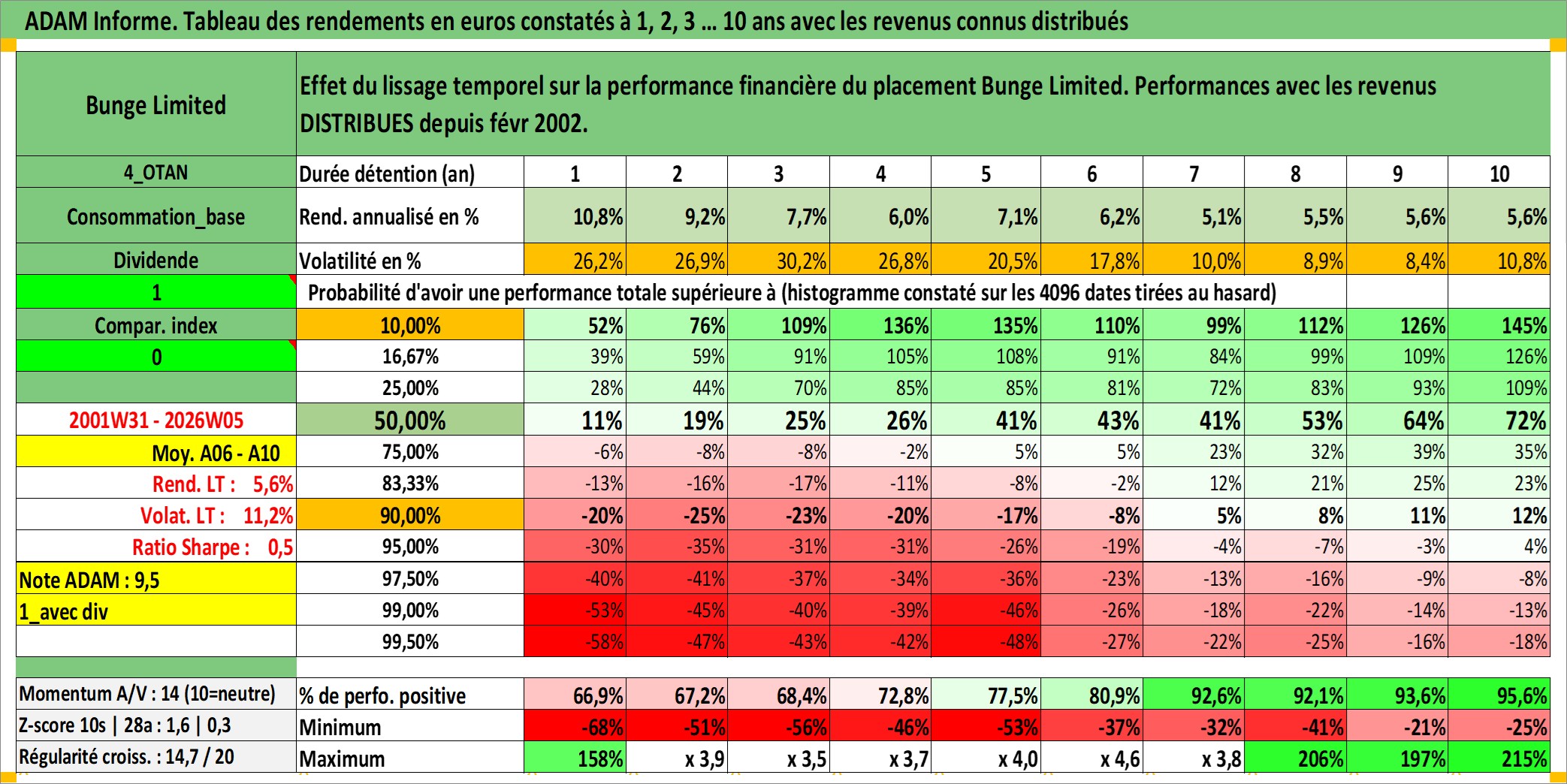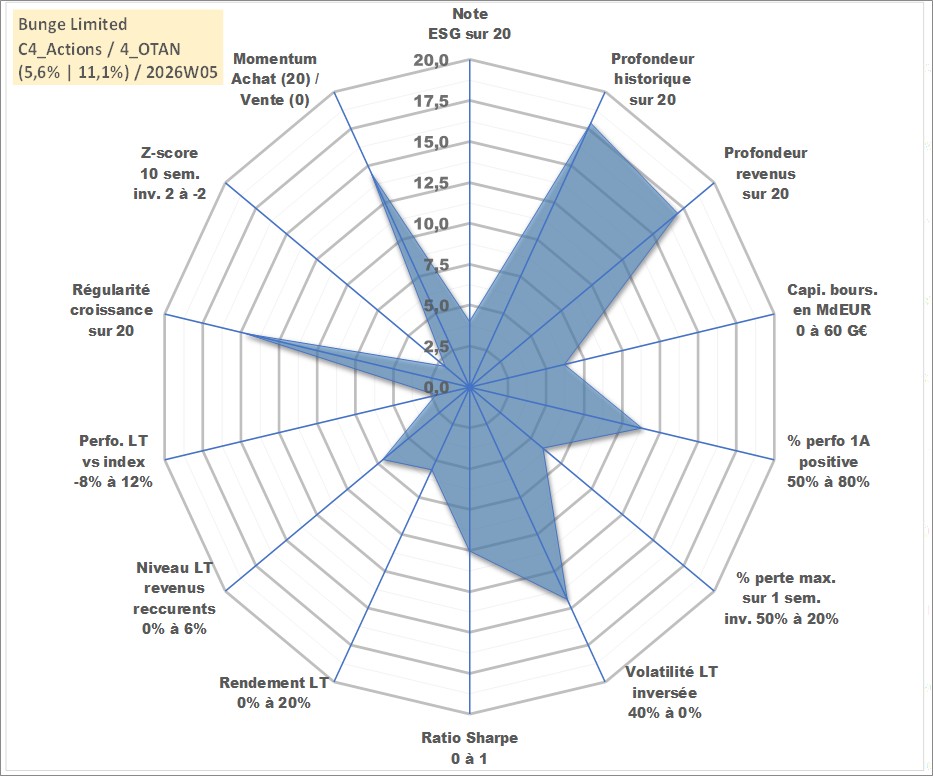 Site dédié aux investisseursPage dédiée sur site financeAnalyse des valorisations hebdomadaires de l'action Bunge Limited. Cet actif est cote en USD. Les valorisations sont en contrevaleur EURO et couvrent les semaines 2001W31 a 2026W05. Les revenus de cet actif financier sont pris en compte depuis la semaine 2002W06. La note globale ESG de cet actif est estimee a 4.0 (apres rebasage entre 0 et 20).