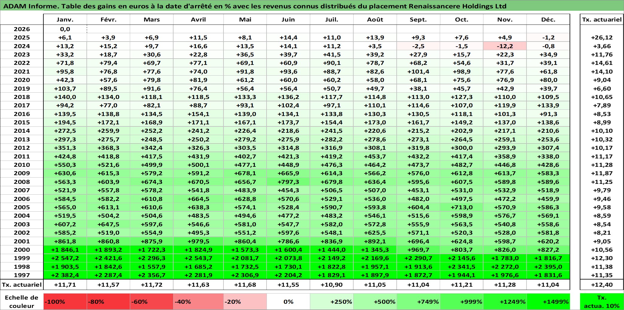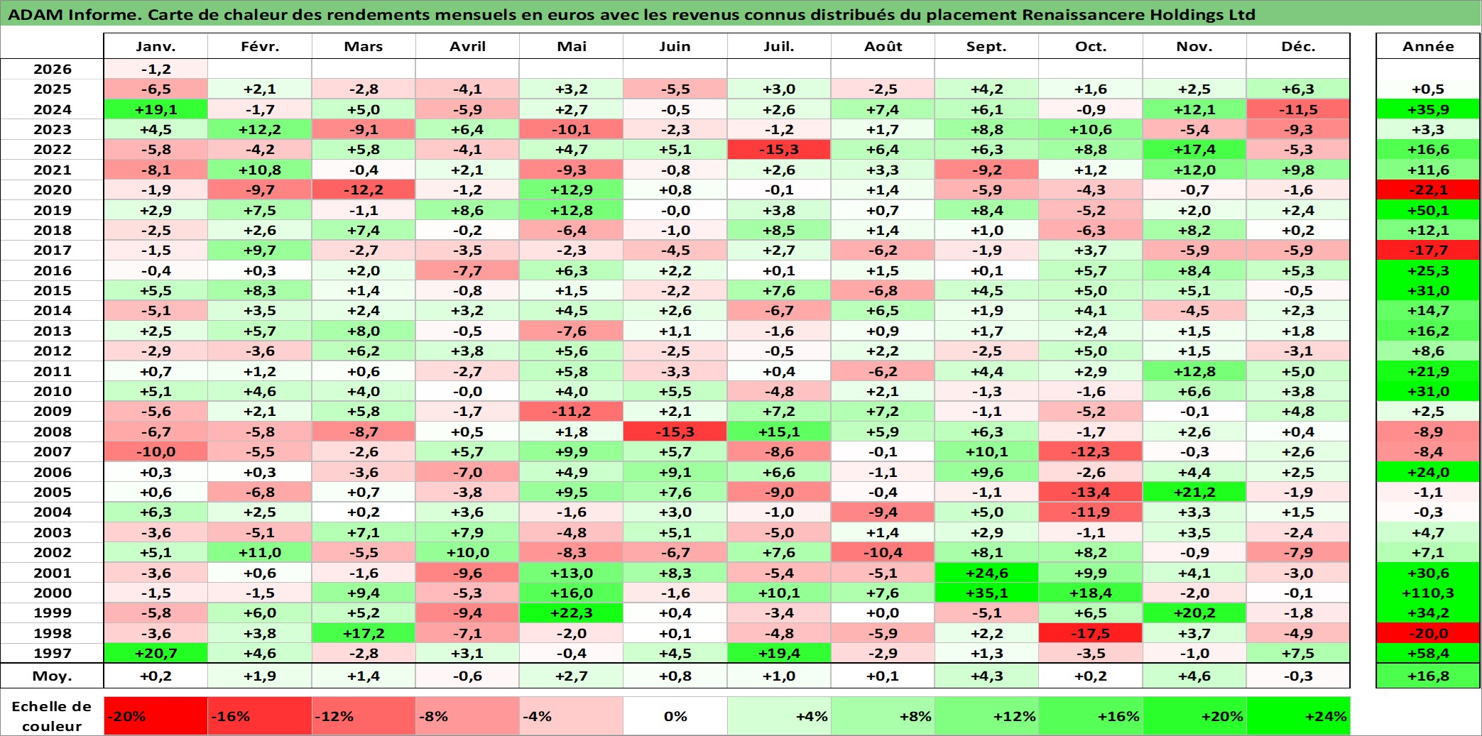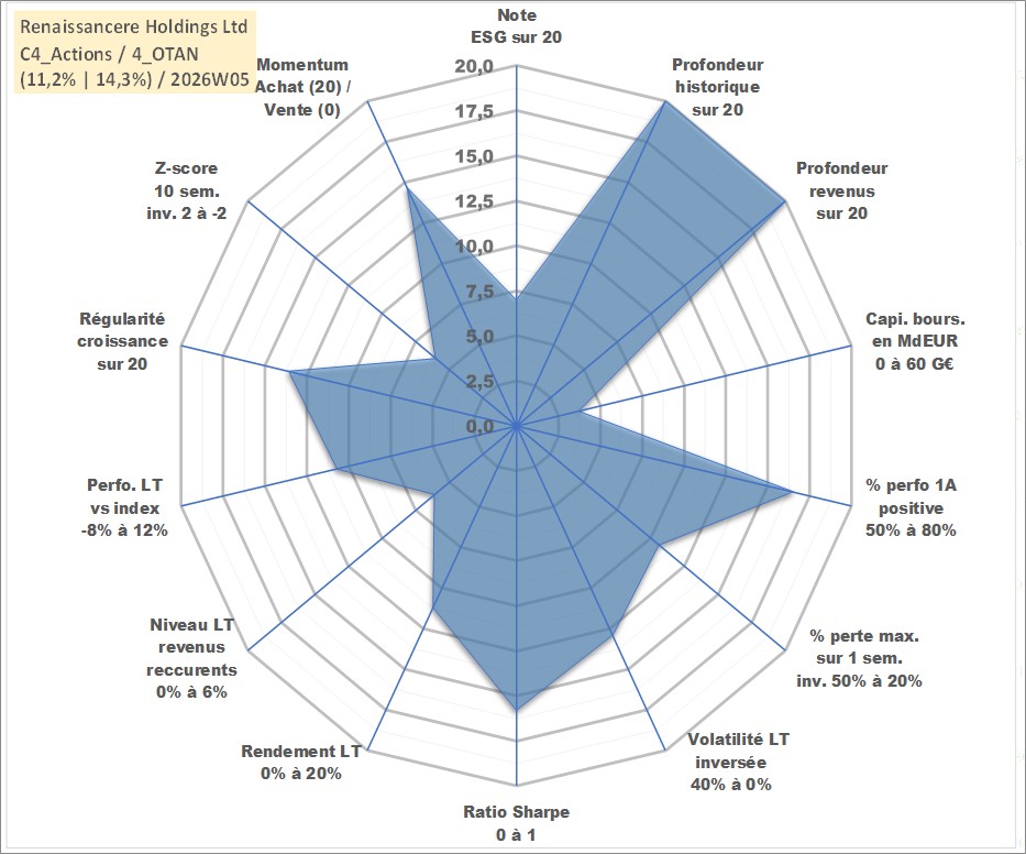Site dédié aux investisseursPage dédiée sur site financeAnalyse des valorisations hebdomadaires de l'action Renaissancere Holdings Ltd. Cet actif est cote en USD. Les valorisations sont en contrevaleur EURO et couvrent les semaines 1997W01 a 2026W05. Les revenus de cet actif financier sont pris en compte depuis la semaine 1997W07. La note globale ESG de cet actif est estimee a 7.0 (apres rebasage entre 0 et 20).