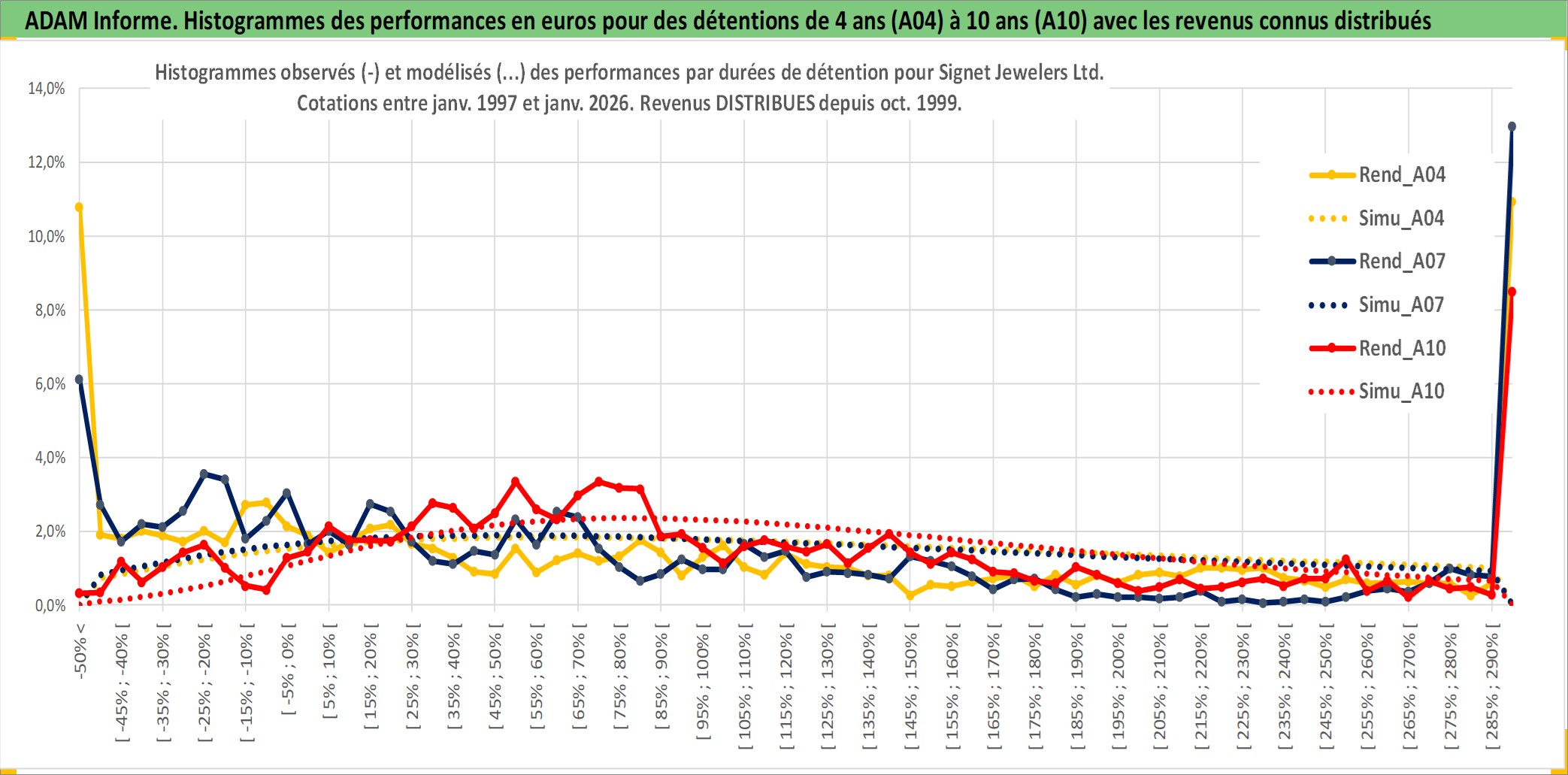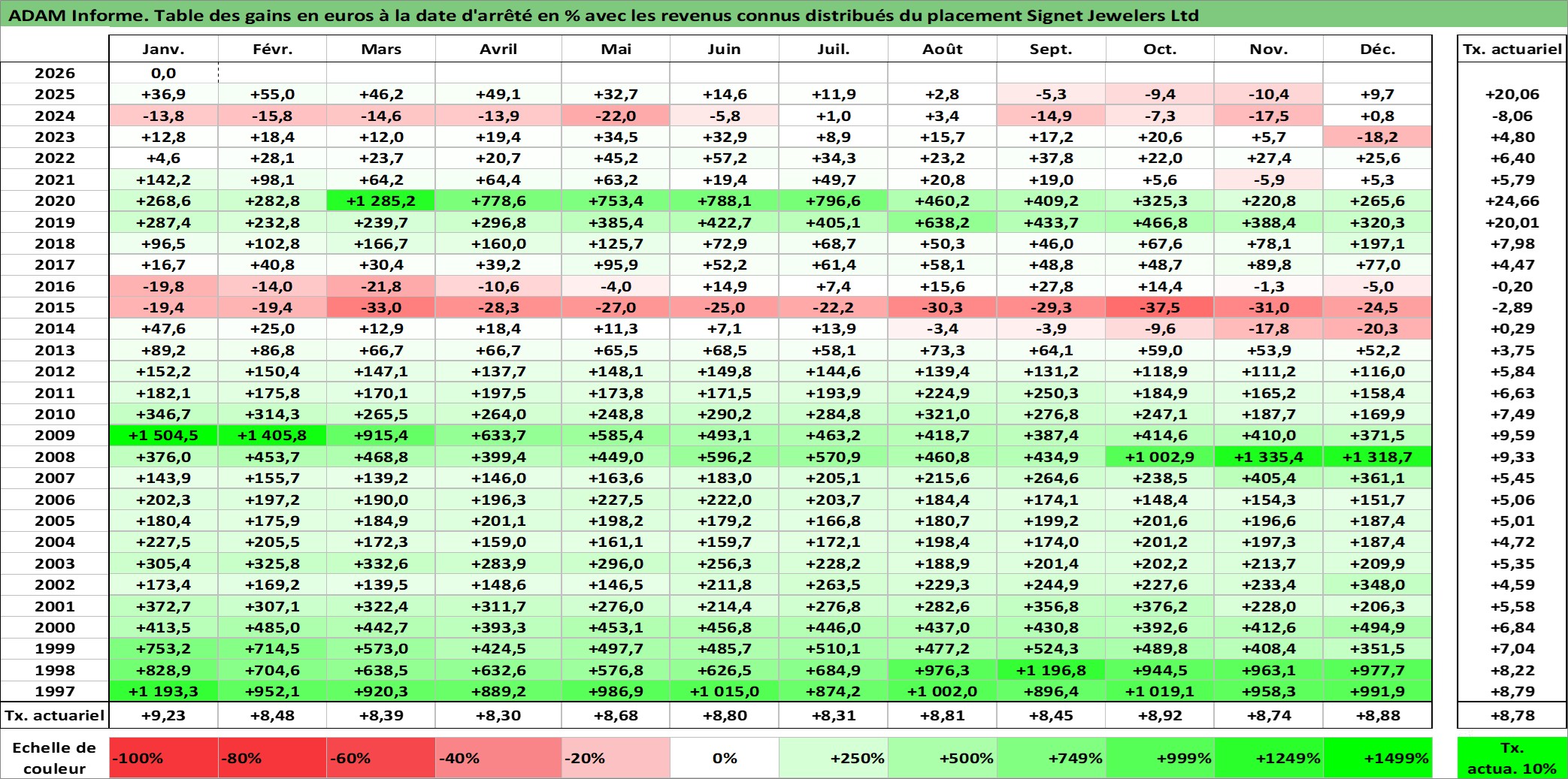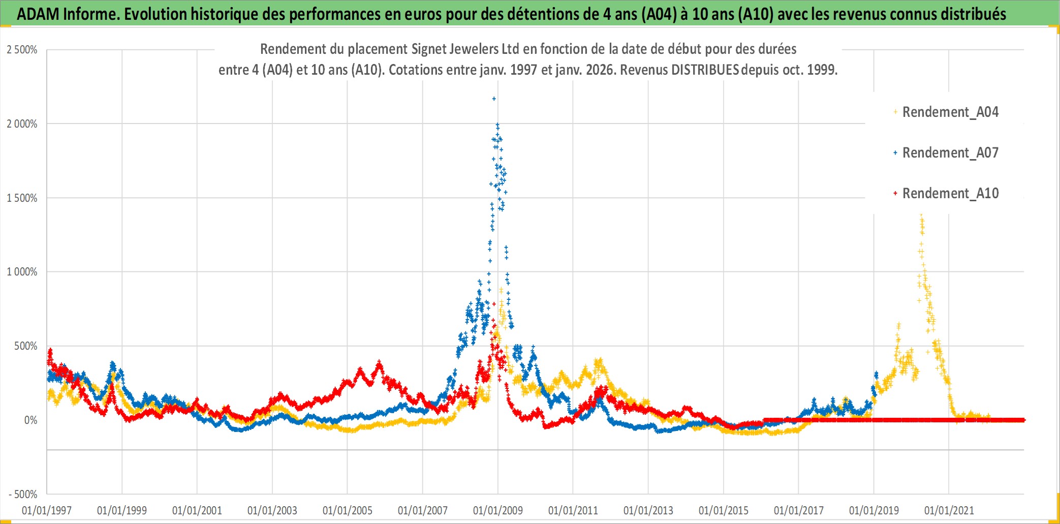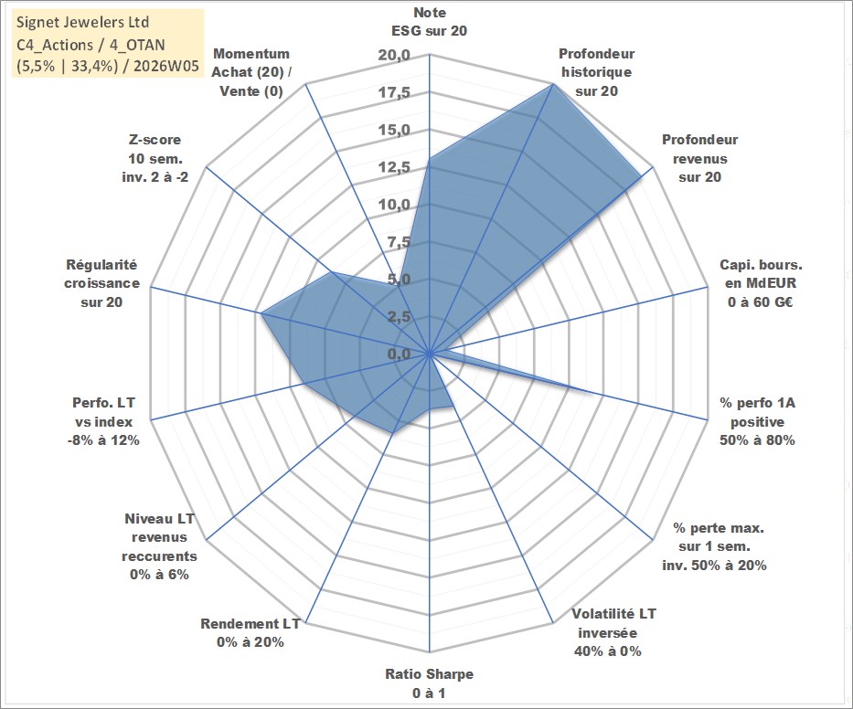 Site dédié aux investisseursPage dédiée sur site financeAnalyse des valorisations hebdomadaires de l'action Signet Jewelers Ltd. Cet actif est cote en USD. Les valorisations sont en contrevaleur EURO et couvrent les semaines 1997W01 a 2026W05. Les revenus de cet actif financier sont pris en compte depuis la semaine 1999W41. La note globale ESG de cet actif est estimee a 13.0 (apres rebasage entre 0 et 20).