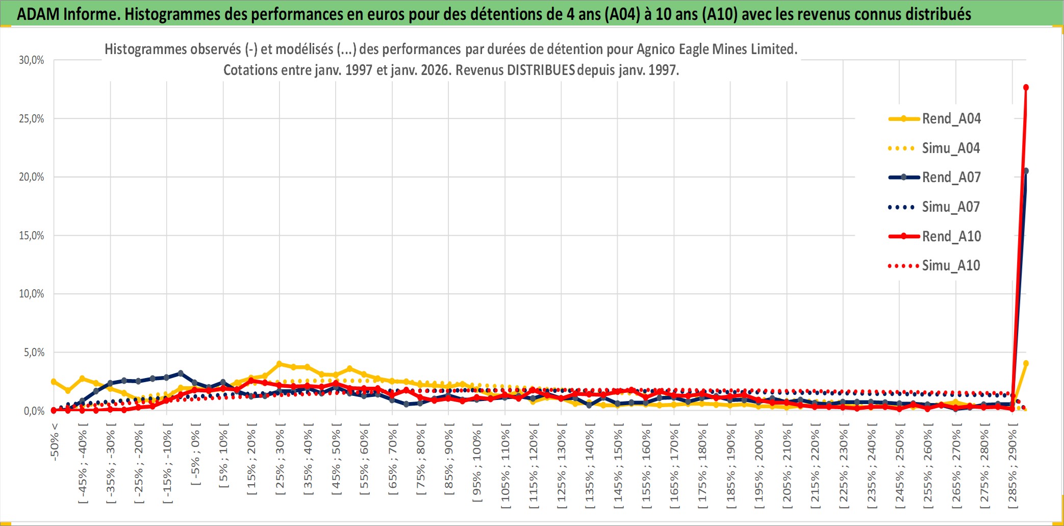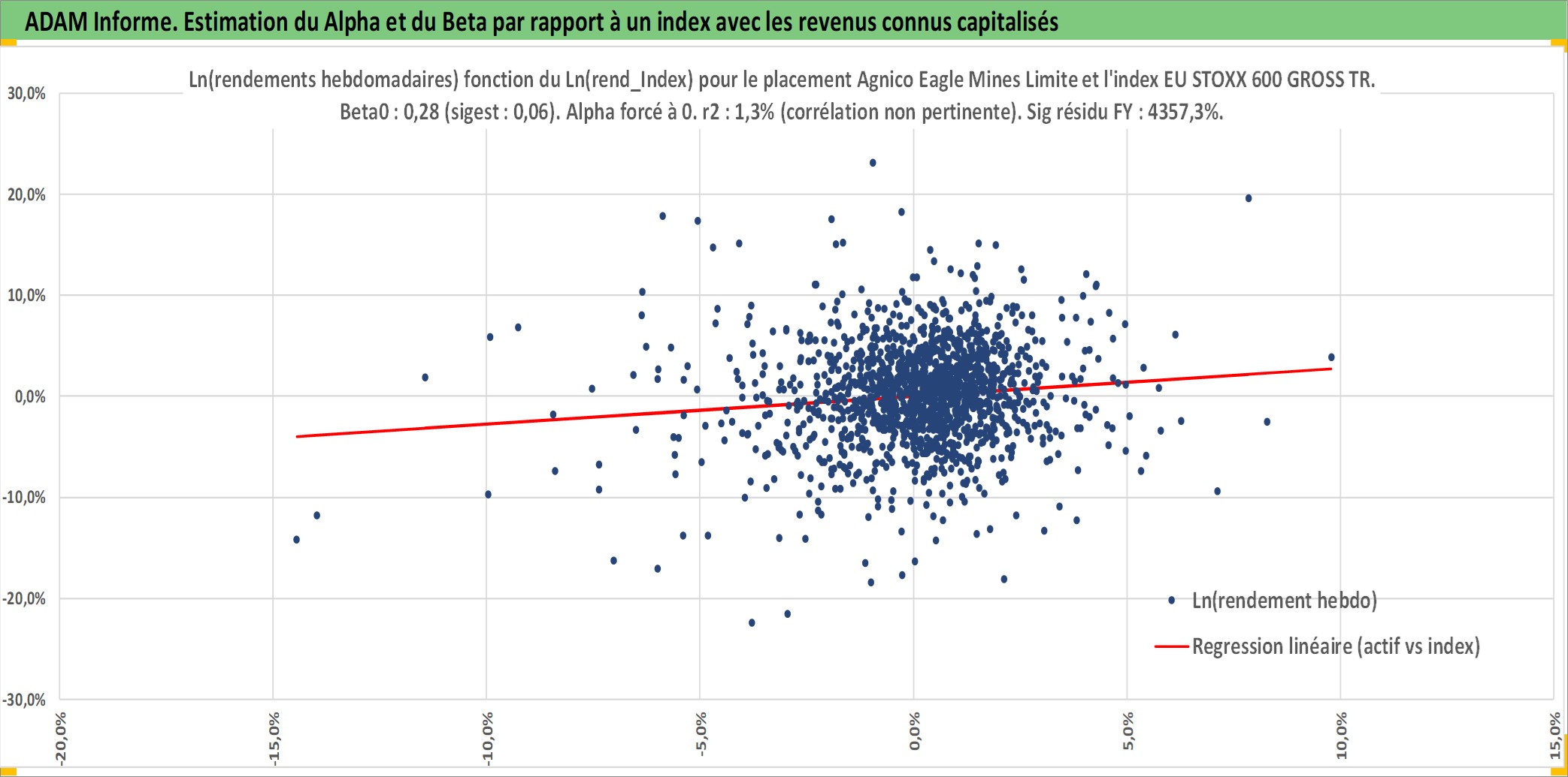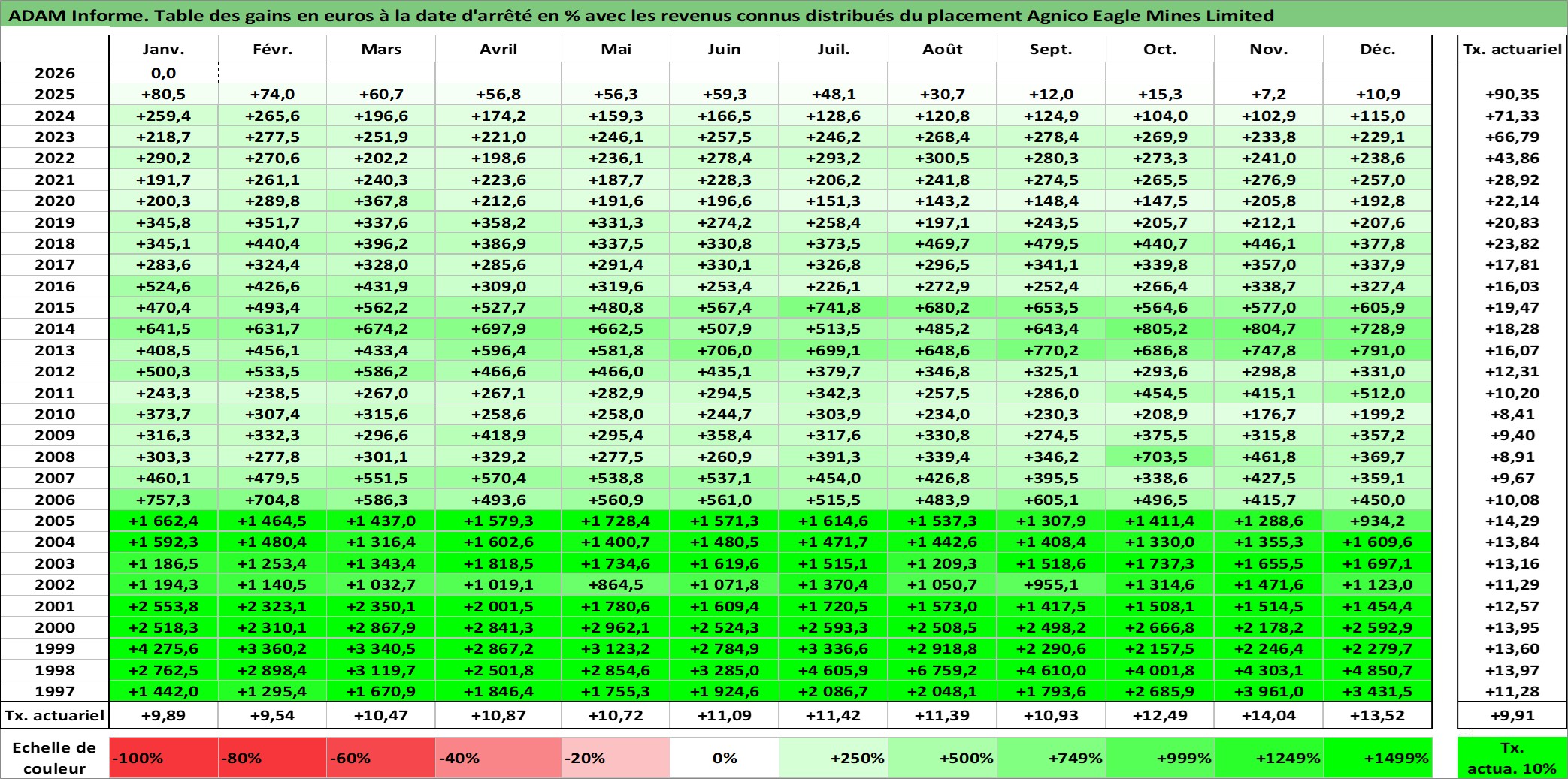 Site dédié aux investisseursPage dédiée sur site financeAnalyse des valorisations hebdomadaires de l'action Agnico Eagle Mines Limited. Cet actif est cote en CAD. Les valorisations sont en contrevaleur EURO et couvrent les semaines 1997W01 a 2026W05. Les revenus de cet actif financier sont pris en compte depuis la semaine 1997W01. La note globale ESG de cet actif est estimee a 9.0 (apres rebasage entre 0 et 20).