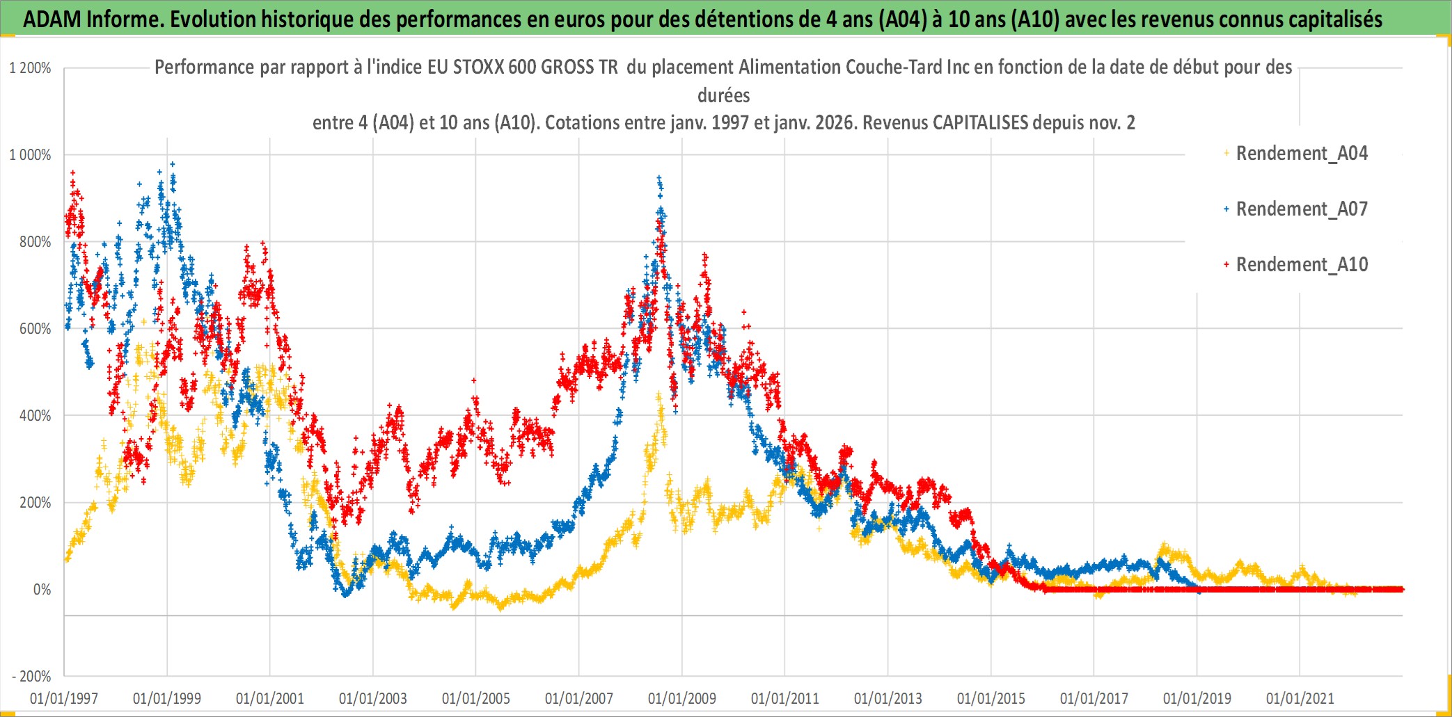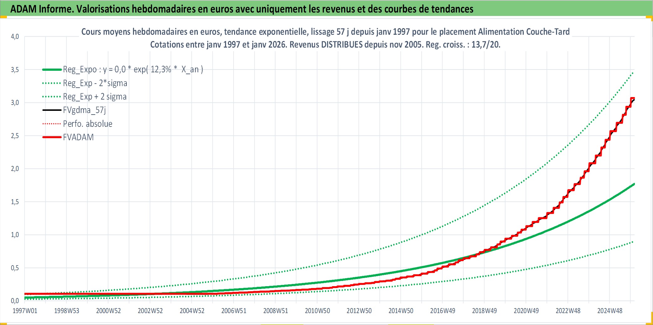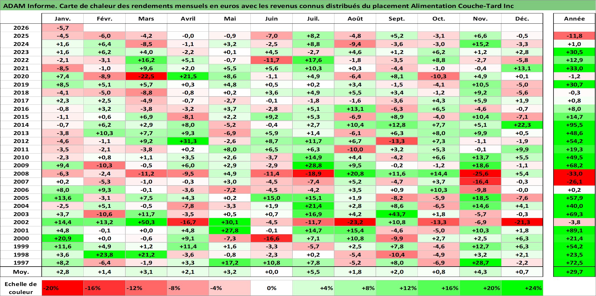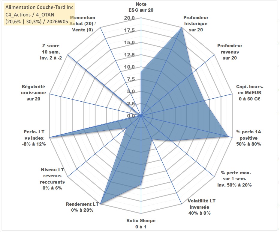 Site dédié aux investisseursPage dédiée sur site financeAnalyse des valorisations hebdomadaires de l'action Alimentation Couche-Tard Inc. Cet actif est cote en CAD. Les valorisations sont en contrevaleur EURO et couvrent les semaines 1997W01 a 2026W05. Les revenus de cet actif financier sont pris en compte depuis la semaine 2005W47. La note globale ESG de cet actif est estimee a 9.0 (apres rebasage entre 0 et 20).