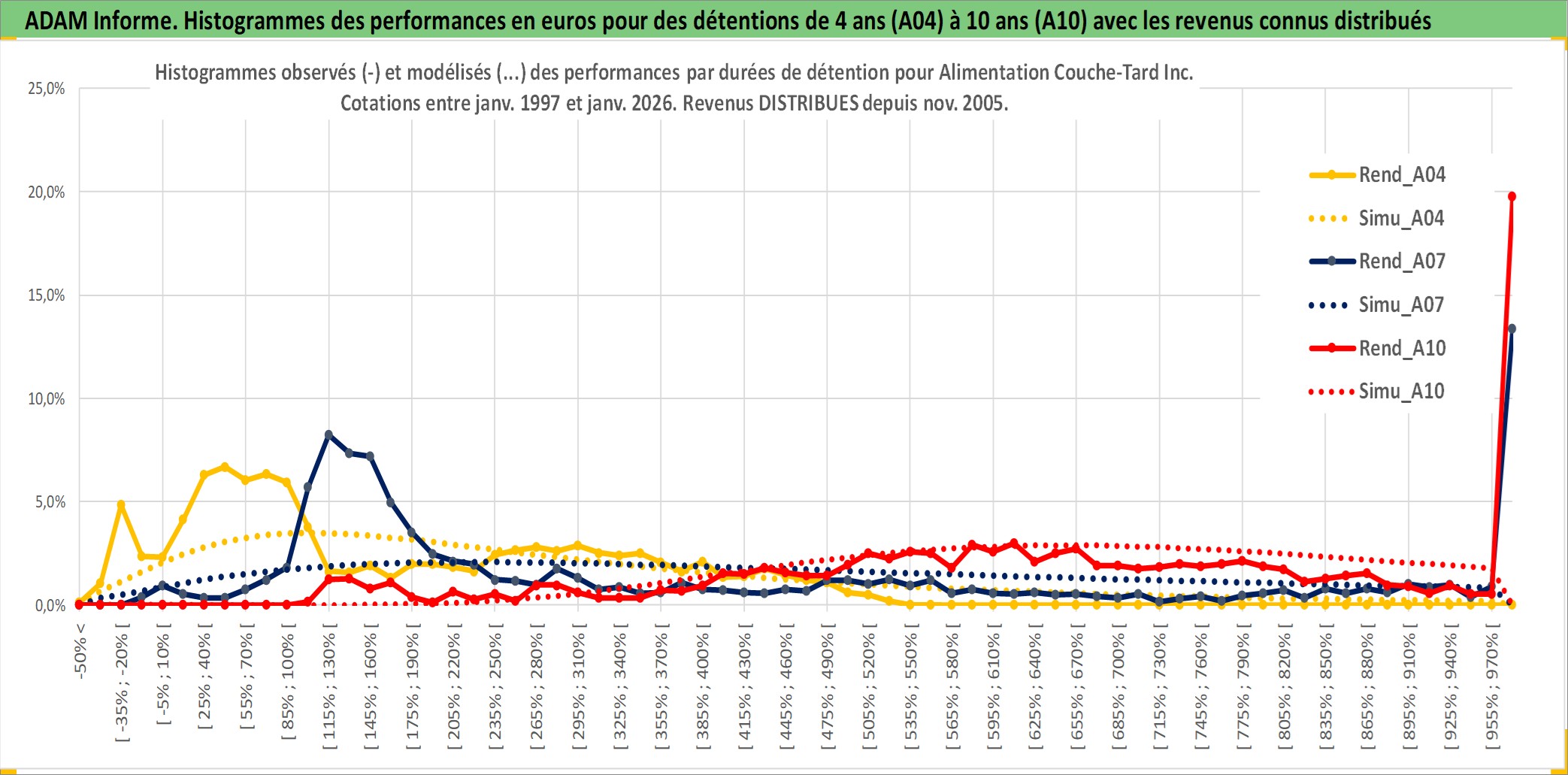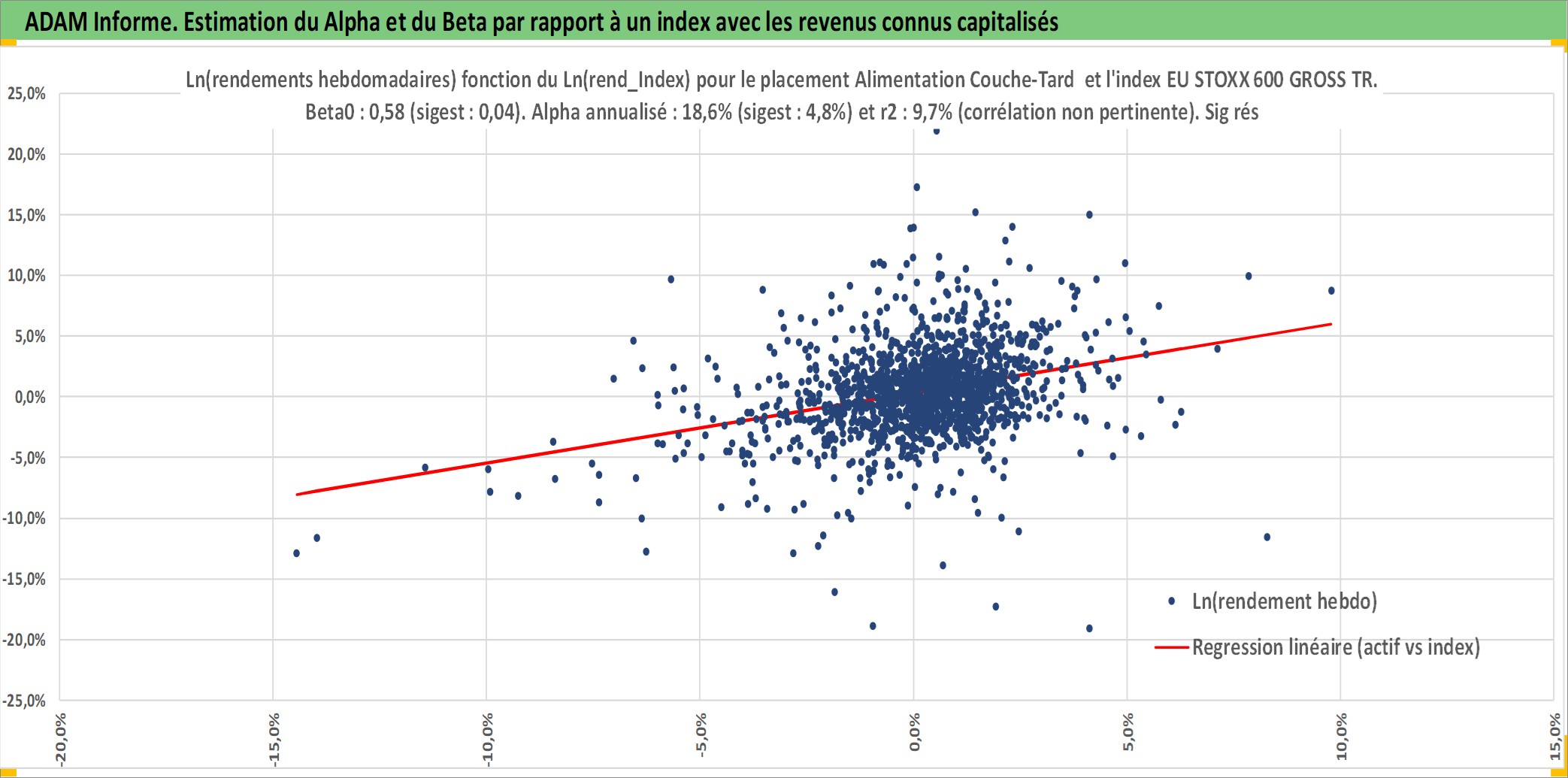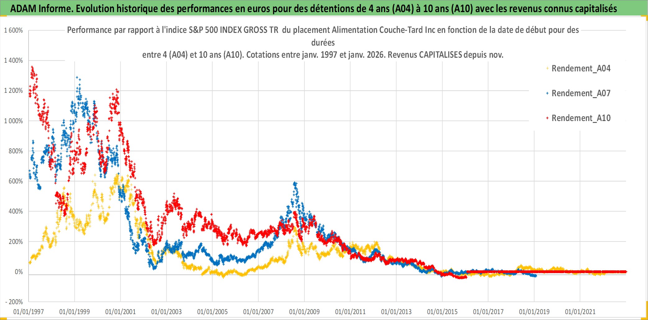 Site dédié aux investisseursPage dédiée sur site financeAnalyse des valorisations hebdomadaires de l'action Alimentation Couche-Tard Inc. Cet actif est cote en CAD. Les valorisations sont en contrevaleur EURO et couvrent les semaines 1997W01 a 2026W05. Les revenus de cet actif financier sont pris en compte depuis la semaine 2005W47. La note globale ESG de cet actif est estimee a 9.0 (apres rebasage entre 0 et 20).