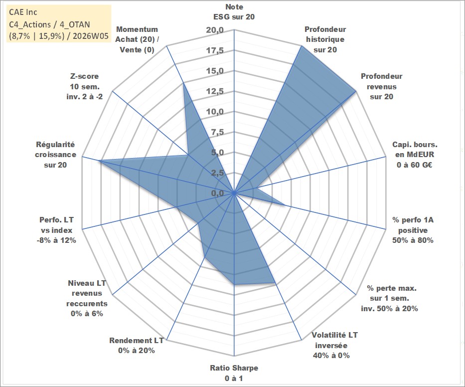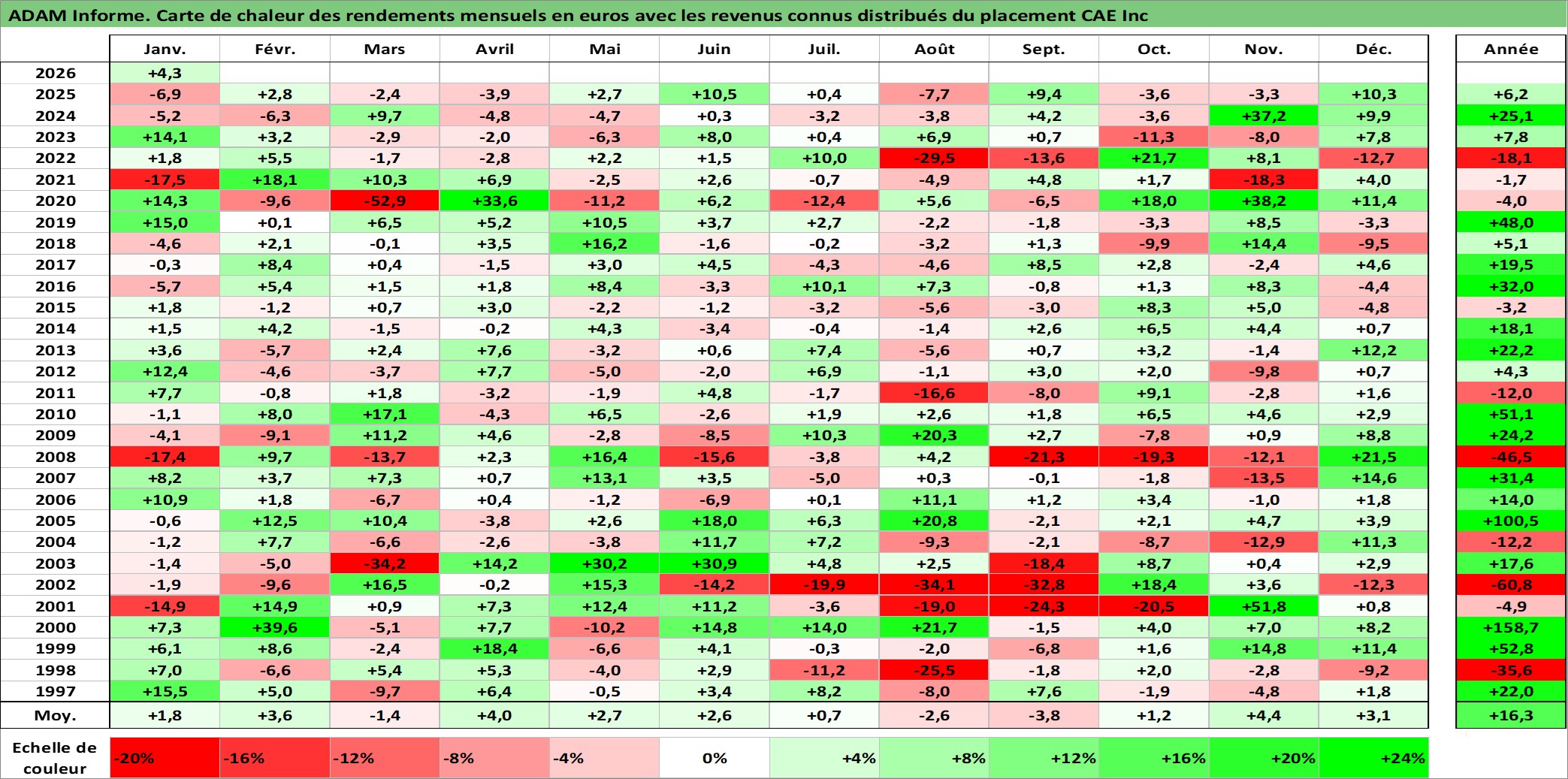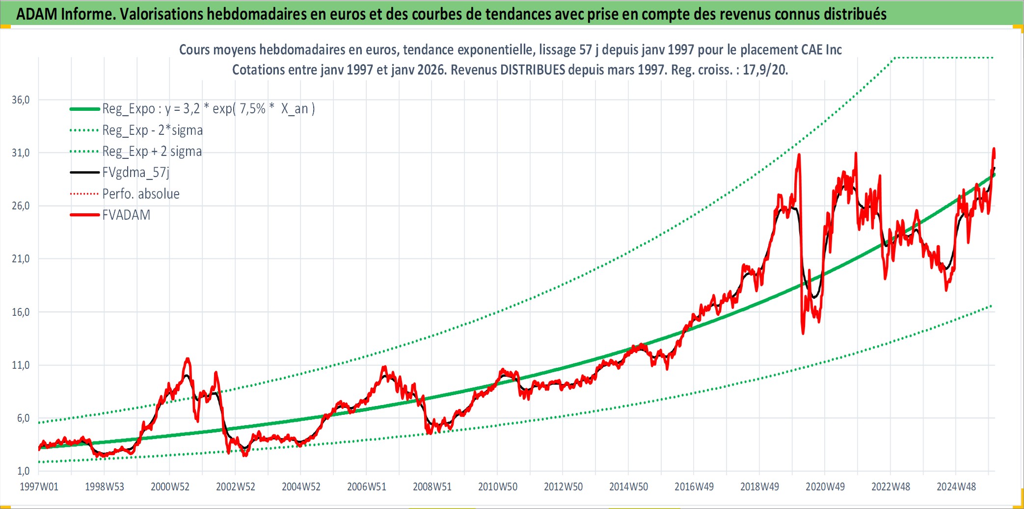 Site dédié aux investisseursPage dédiée sur site financeAnalyse des valorisations hebdomadaires de l'action CAE Inc. Cet actif est cote en CAD. Les valorisations sont en contrevaleur EURO et couvrent les semaines 1997W01 a 2026W05. Les revenus de cet actif financier sont pris en compte depuis la semaine 1997W11. La note ESG de cet actif n'est pas connue.