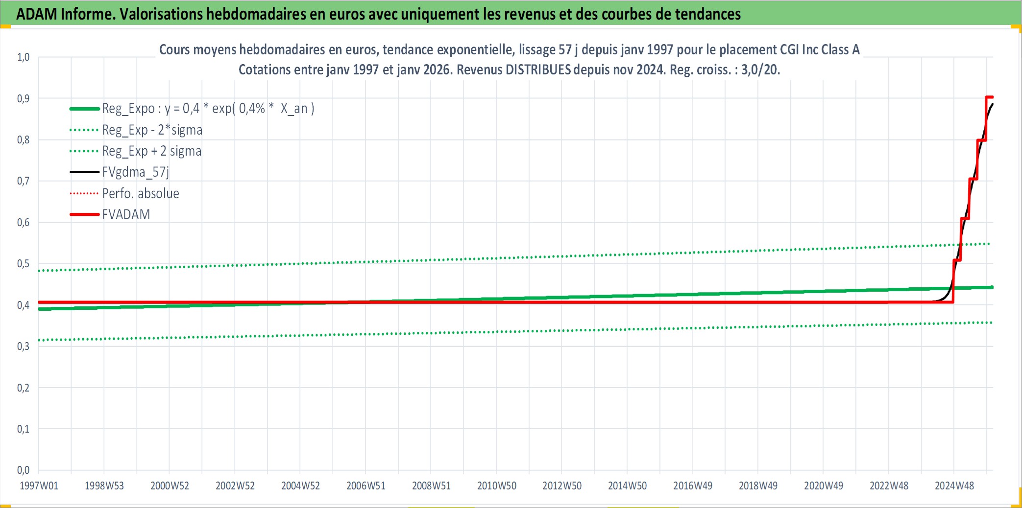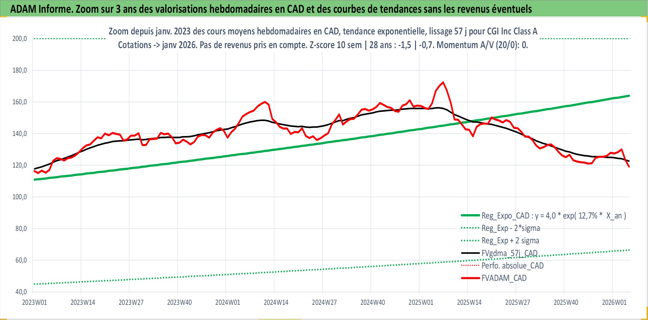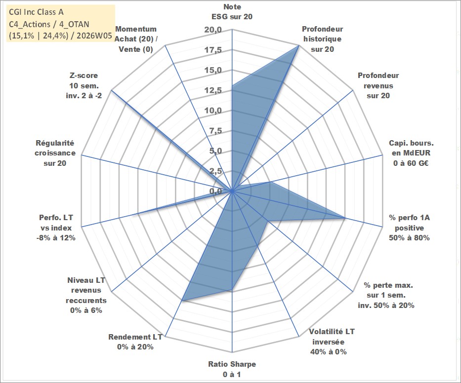Site dédié aux investisseursPage dédiée sur site financeAnalyse des valorisations hebdomadaires de l'action CGI Inc Class A. Cet actif est cote en CAD. Les valorisations sont en contrevaleur EURO et couvrent les semaines 1997W01 a 2026W05. Les revenus de cet actif financier sont pris en compte depuis la semaine 2024W47. La note globale ESG de cet actif est estimee a 13.0 (apres rebasage entre 0 et 20).
