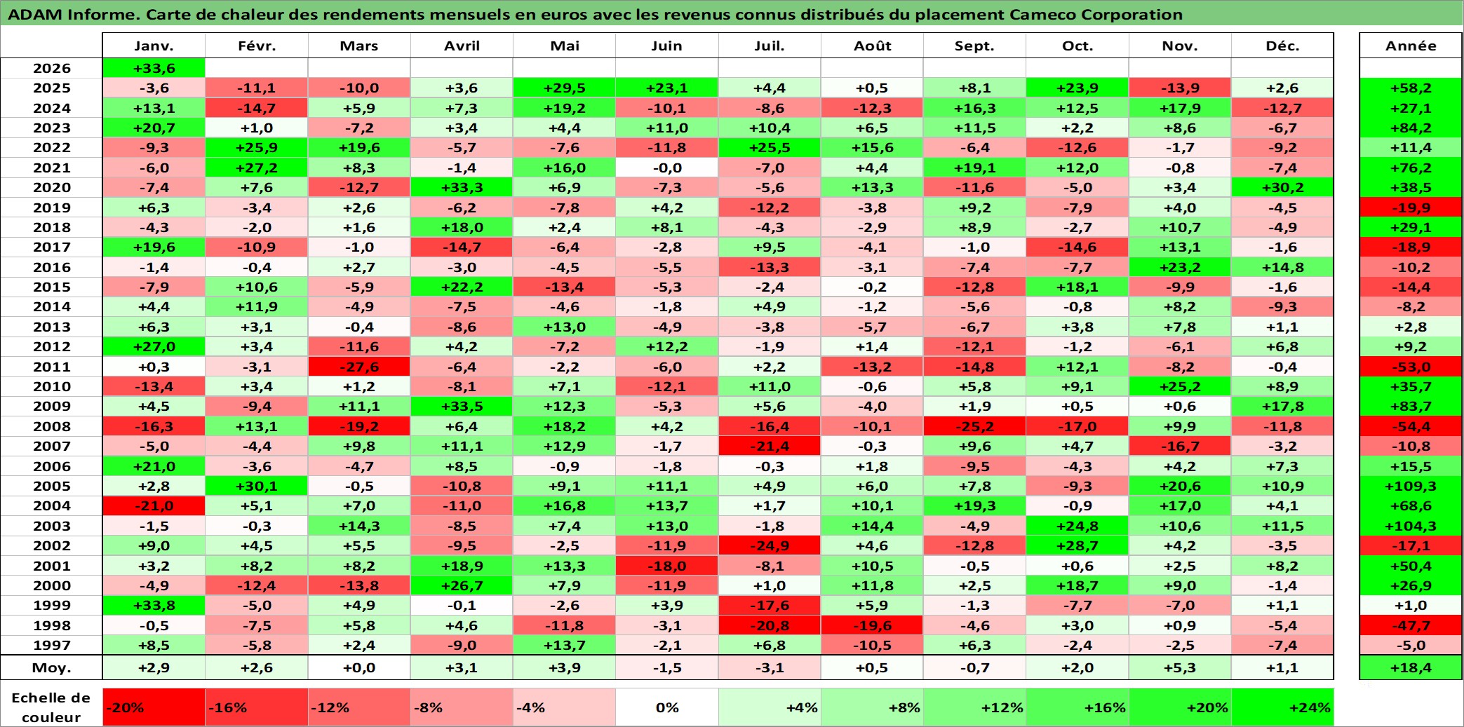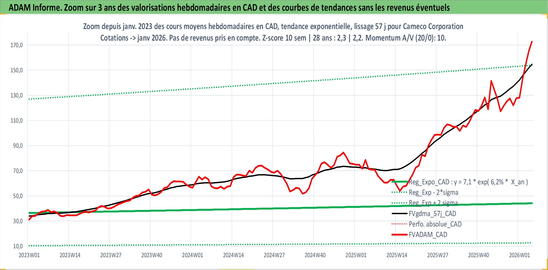 Site dédié aux investisseursPage dédiée sur site financeAnalyse des valorisations hebdomadaires de l'action Cameco Corporation. Cet actif est cote en CAD. Les valorisations sont en contrevaleur EURO et couvrent les semaines 1997W01 a 2026W05. Les revenus de cet actif financier sont pris en compte depuis la semaine 1997W13. La note ESG de cet actif n'est pas connue.
