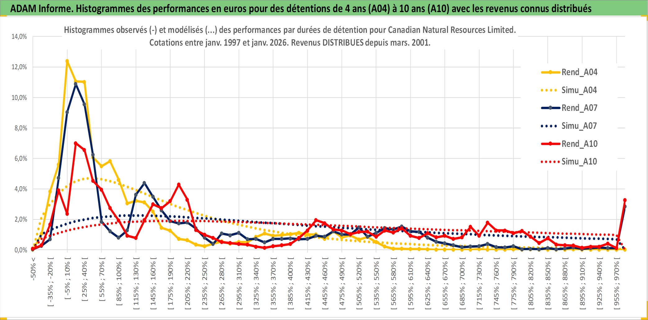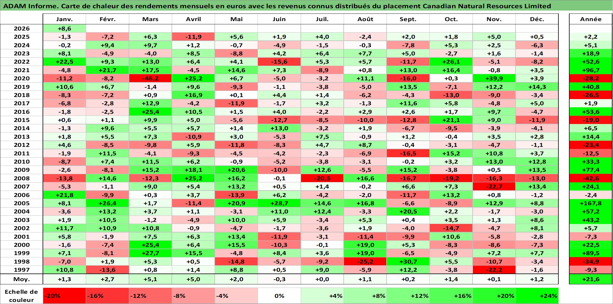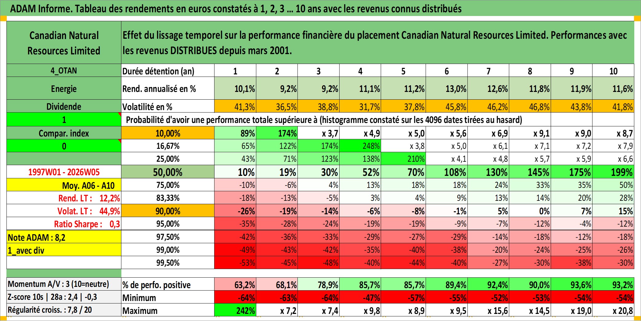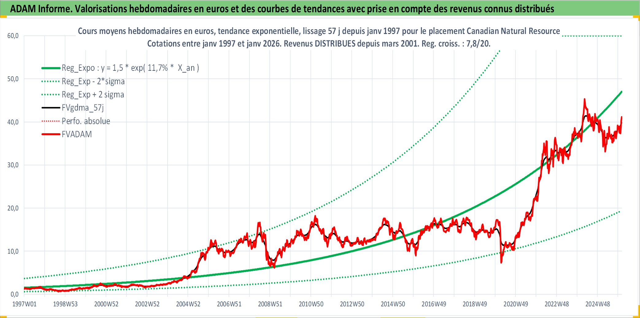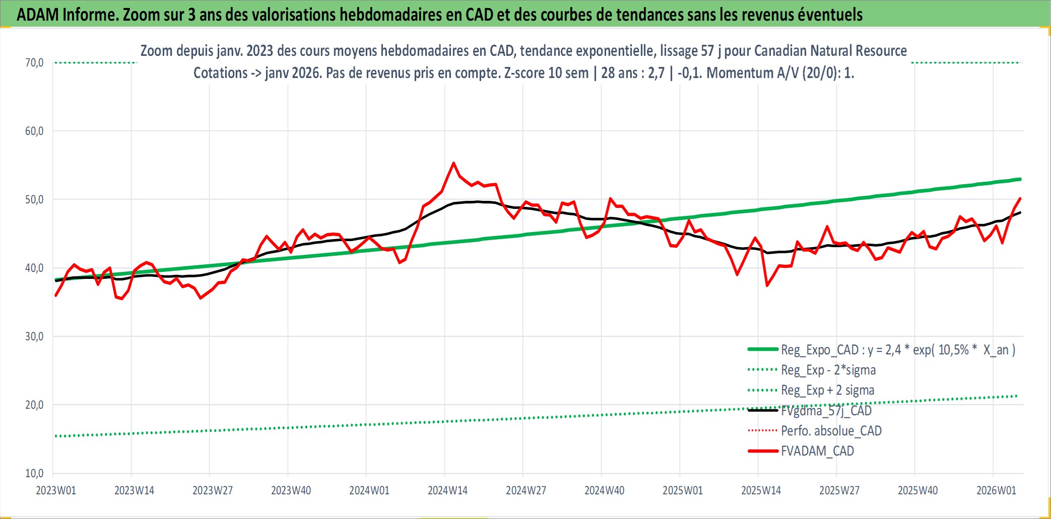 Site dédié aux investisseursPage dédiée sur site financeAnalyse des valorisations hebdomadaires de l'action Canadian Natural Resources Limited. Cet actif est cote en CAD. Les valorisations sont en contrevaleur EURO et couvrent les semaines 1997W01 a 2026W05. Les revenus de cet actif financier sont pris en compte depuis la semaine 2001W11. La note globale ESG de cet actif est estimee a 4.0 (apres rebasage entre 0 et 20).