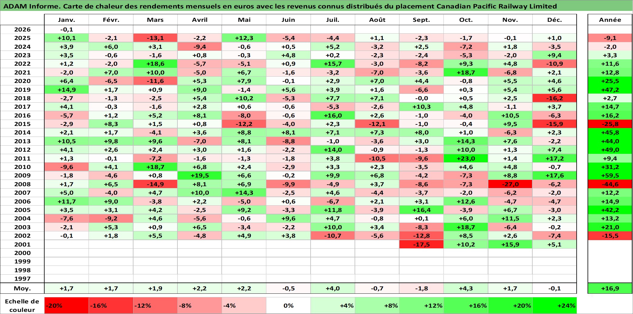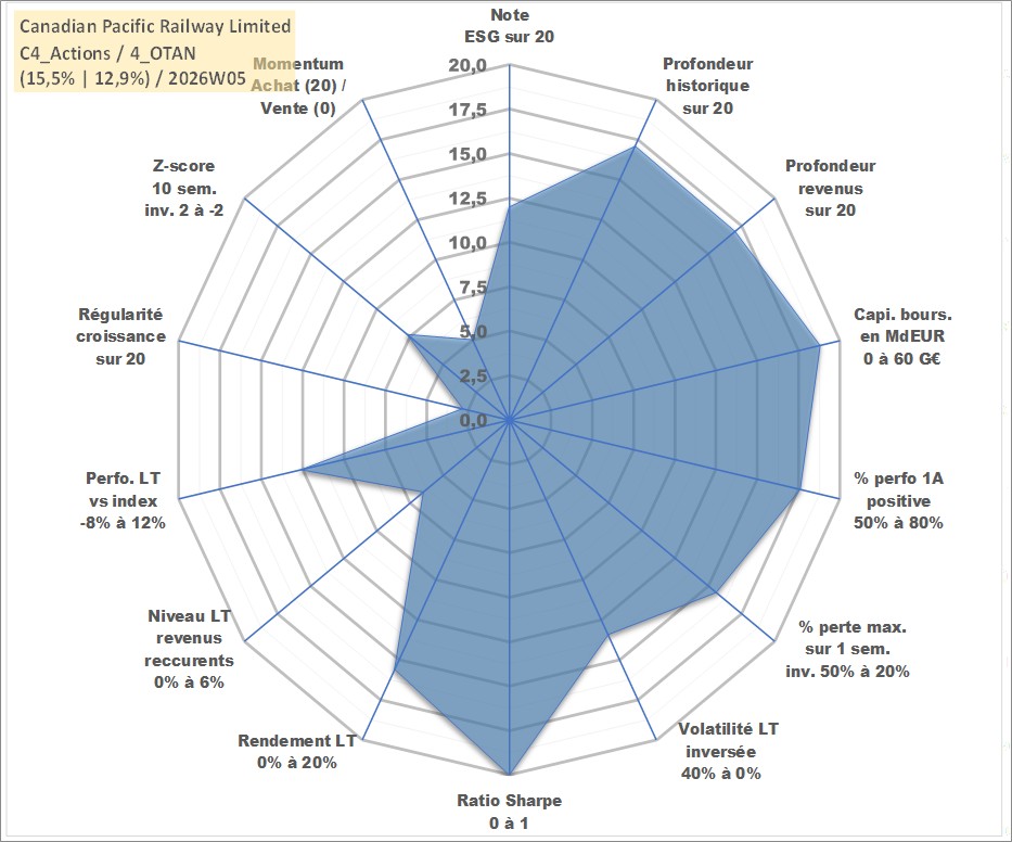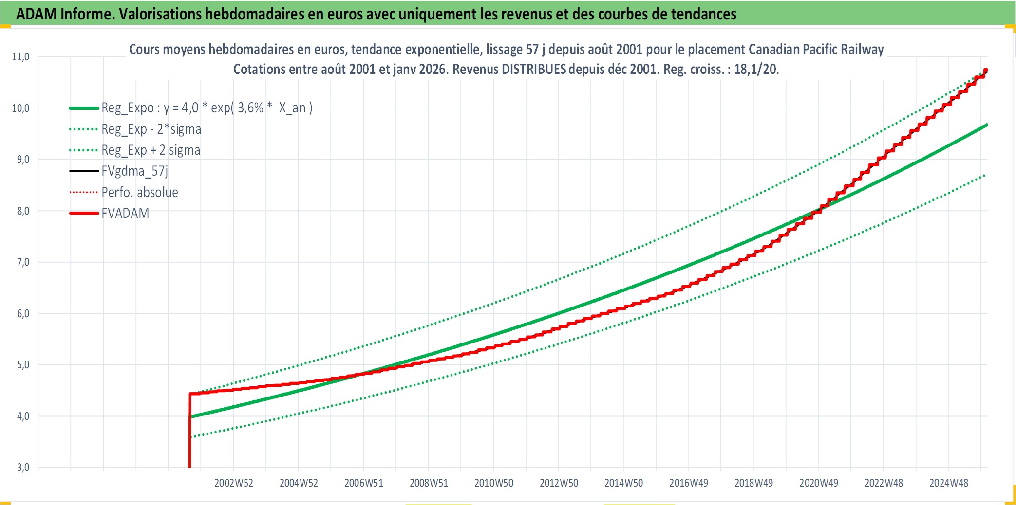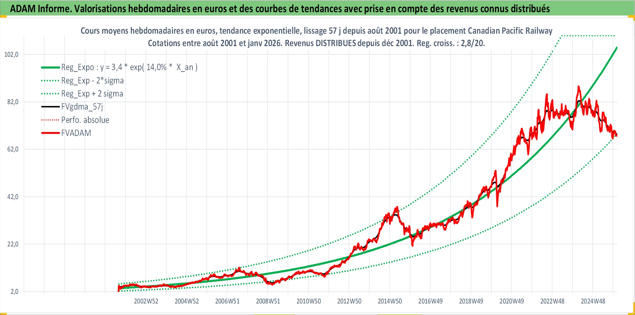Site dédié aux investisseursPage dédiée sur site financeAnalyse des valorisations hebdomadaires de l'action Canadian Pacific Railway Limited. Cet actif est cote en CAD. Les valorisations sont en contrevaleur EURO et couvrent les semaines 2001W34 a 2026W05. Les revenus de cet actif financier sont pris en compte depuis la semaine 2001W51. La note globale ESG de cet actif est estimee a 12.0 (apres rebasage entre 0 et 20).