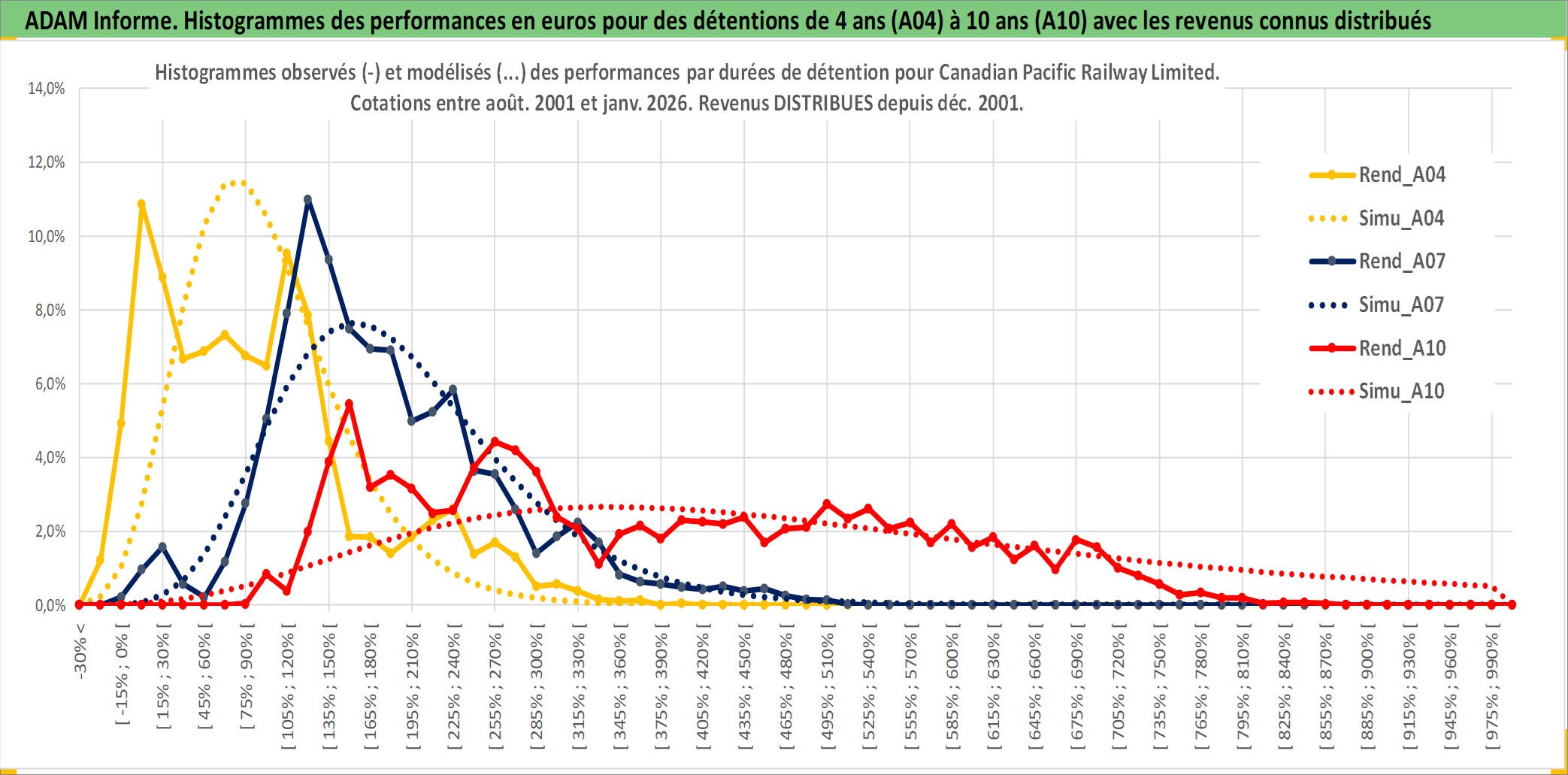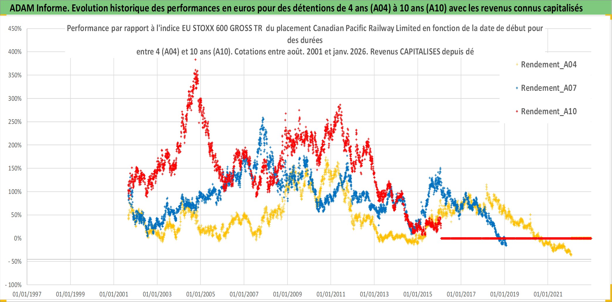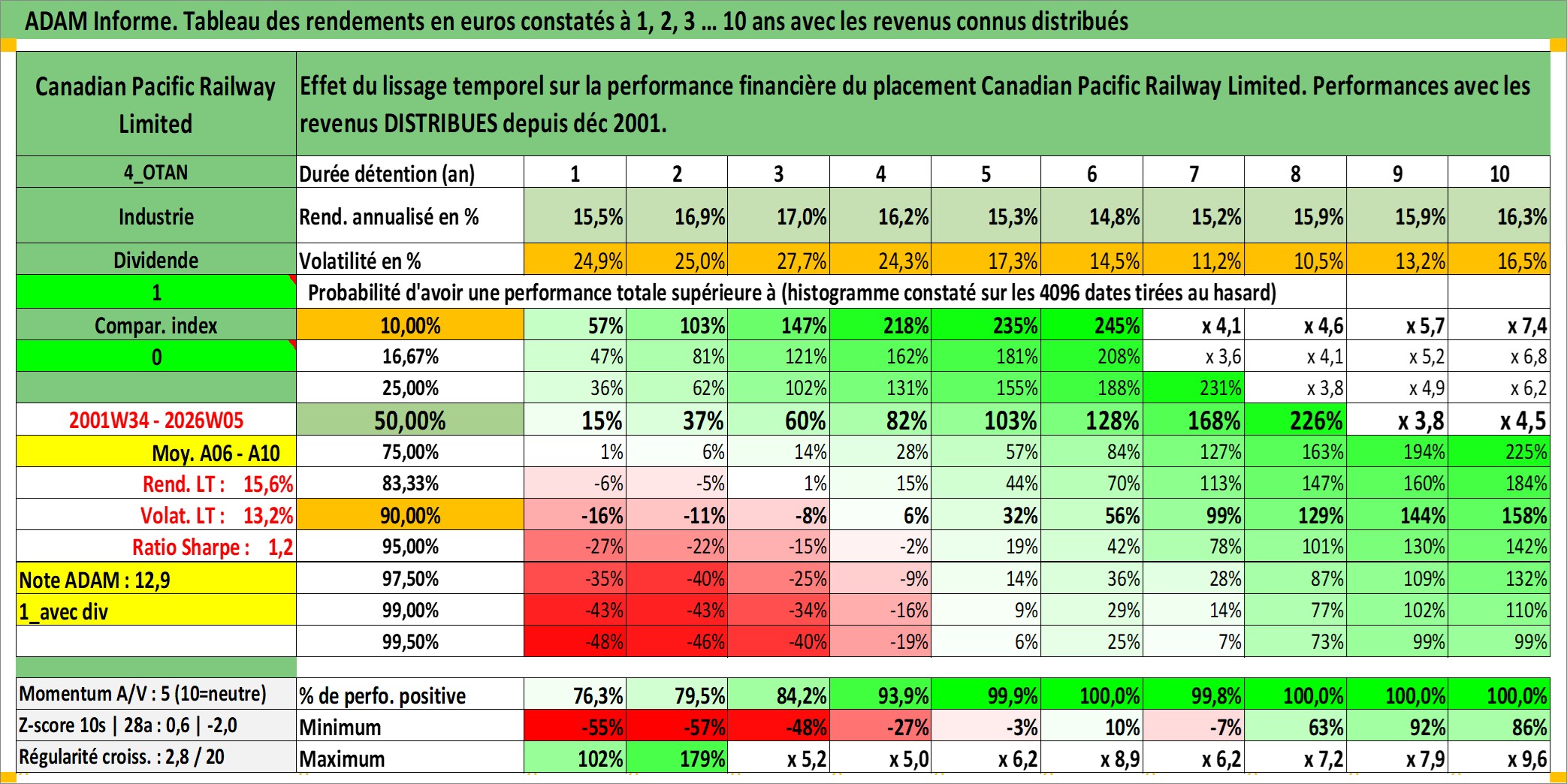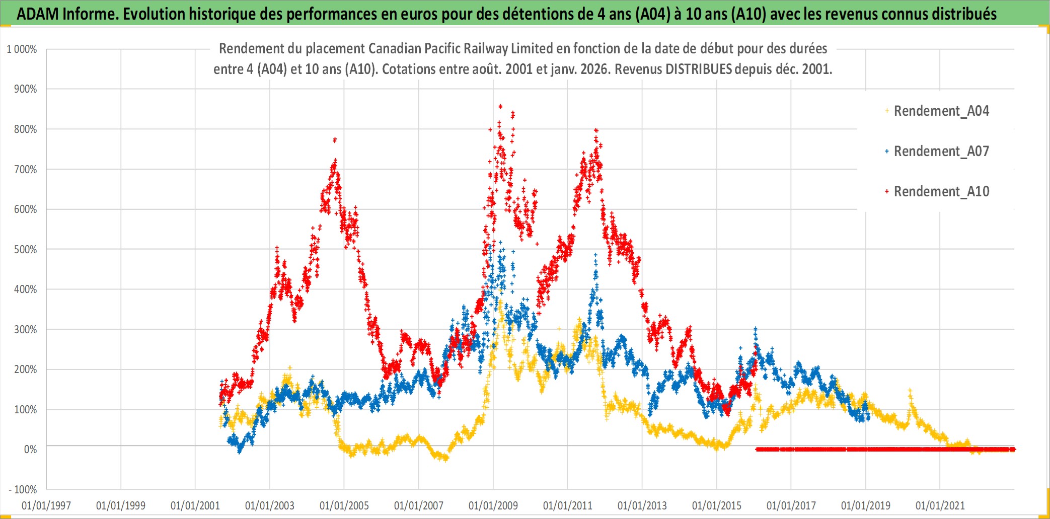 Site dédié aux investisseursPage dédiée sur site financeAnalyse des valorisations hebdomadaires de l'action Canadian Pacific Railway Limited. Cet actif est cote en CAD. Les valorisations sont en contrevaleur EURO et couvrent les semaines 2001W34 a 2026W05. Les revenus de cet actif financier sont pris en compte depuis la semaine 2001W51. La note globale ESG de cet actif est estimee a 12.0 (apres rebasage entre 0 et 20).