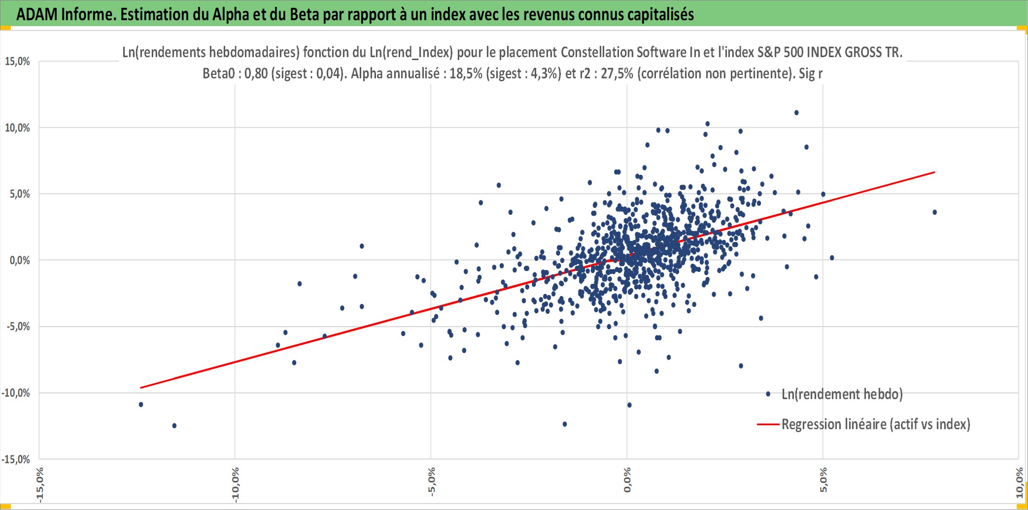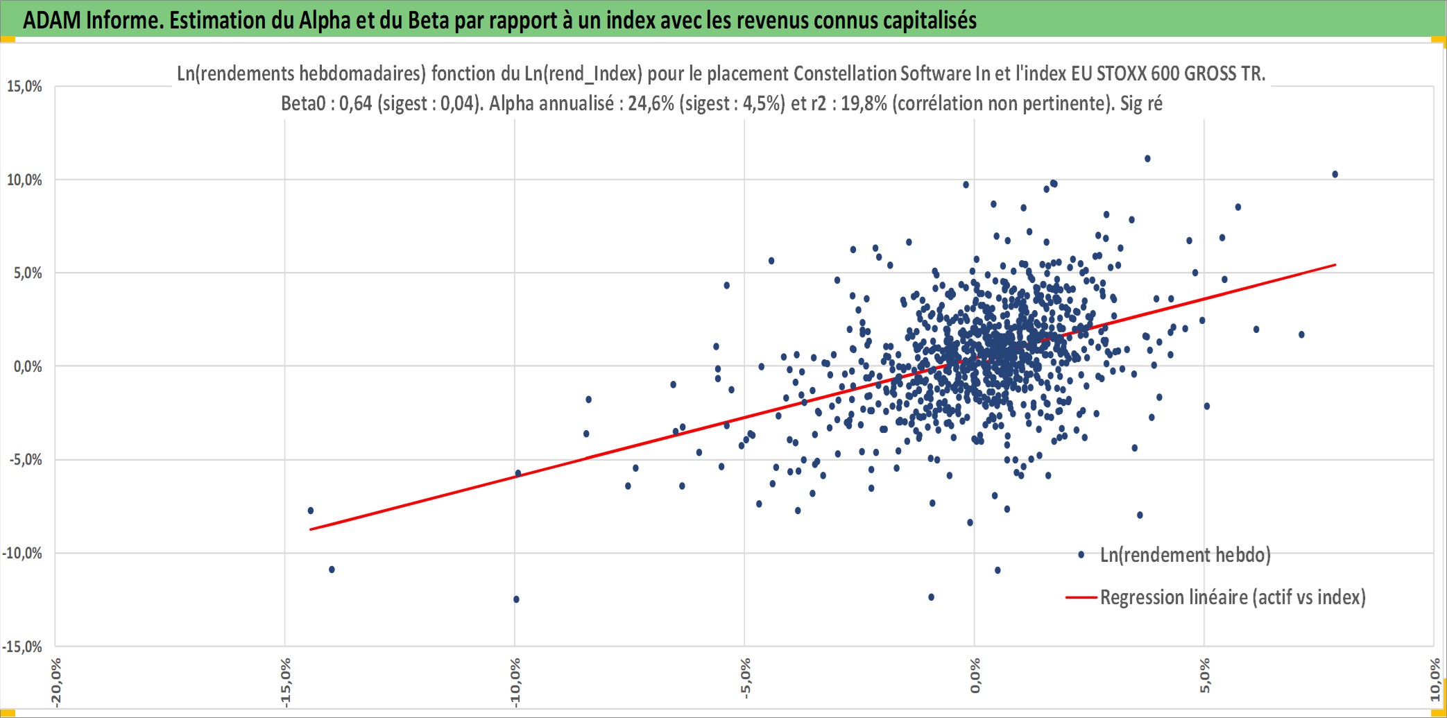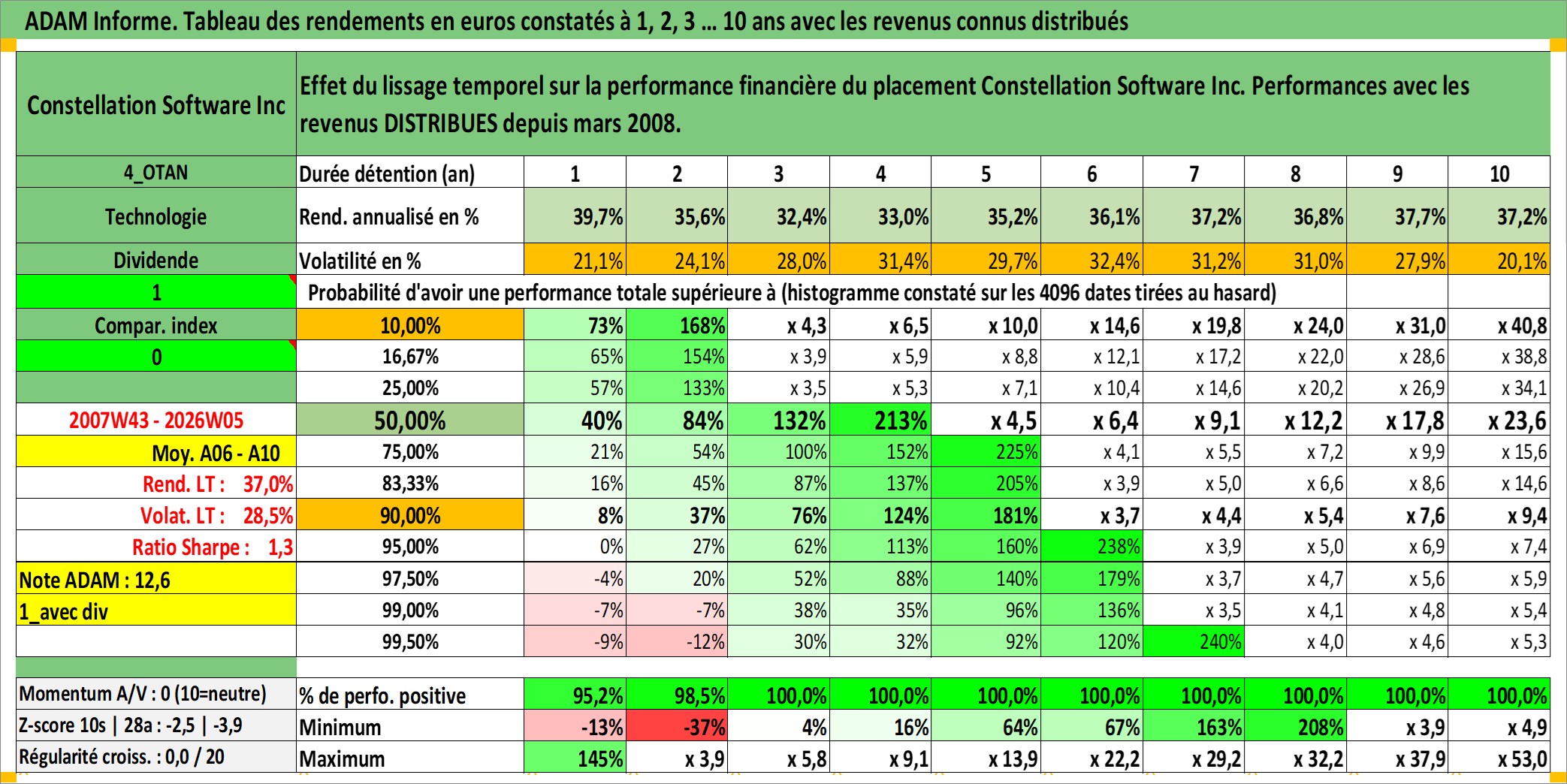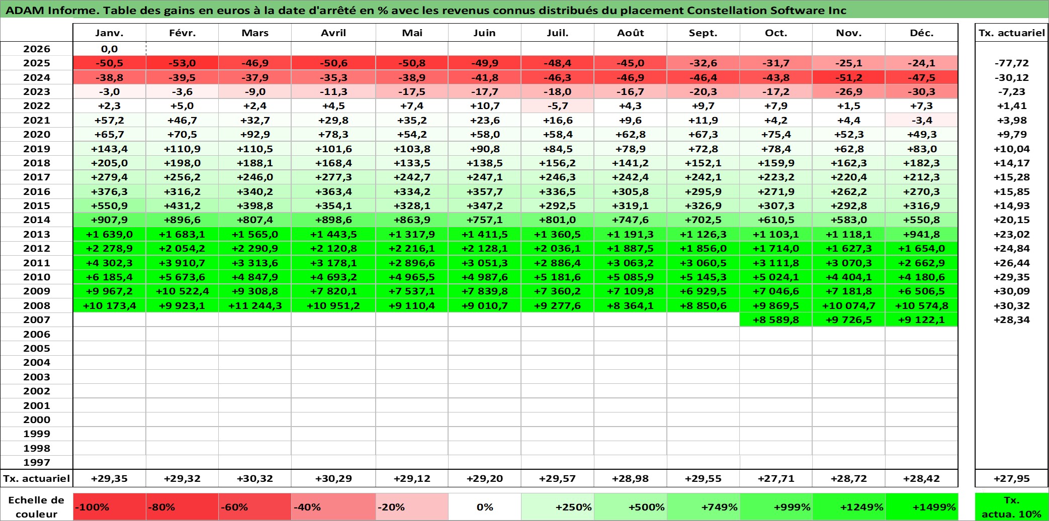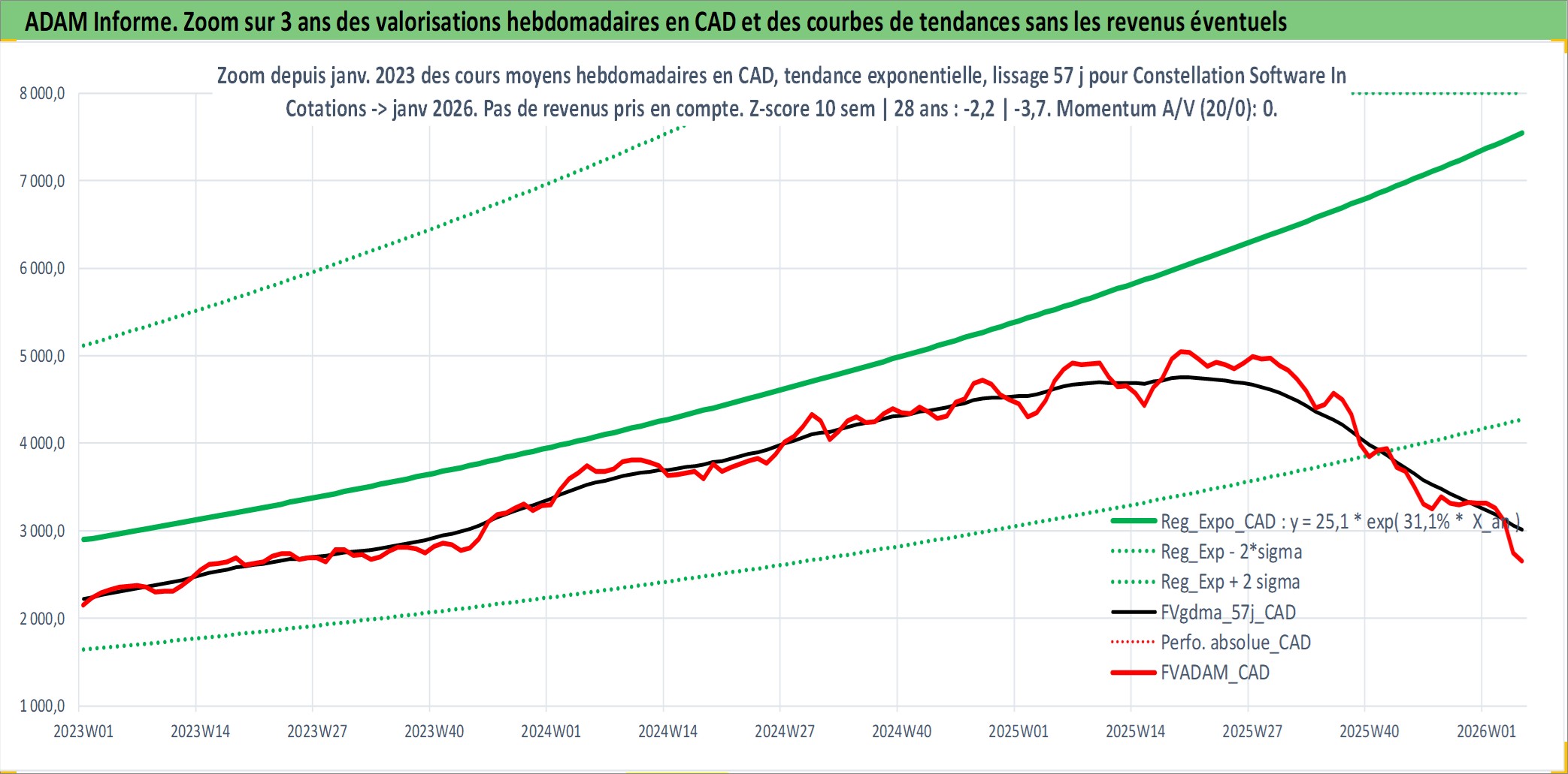 Site dédié aux investisseursPage dédiée sur site financeAnalyse des valorisations hebdomadaires de l'action Constellation Software Inc. Cet actif est cote en CAD. Les valorisations sont en contrevaleur EURO et couvrent les semaines 2007W43 a 2026W05. Les revenus de cet actif financier sont pris en compte depuis la semaine 2008W12. La note globale ESG de cet actif est estimee a 6.0 (apres rebasage entre 0 et 20).
