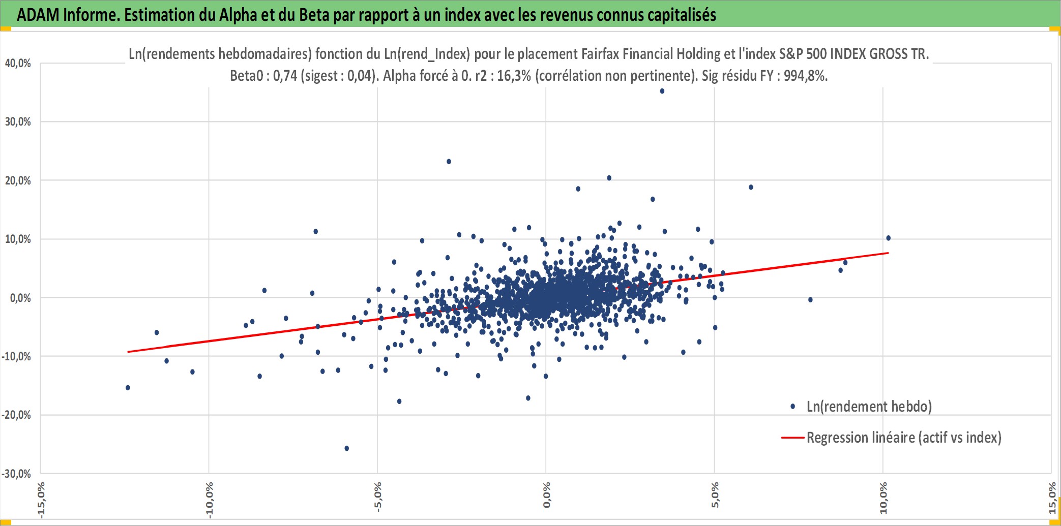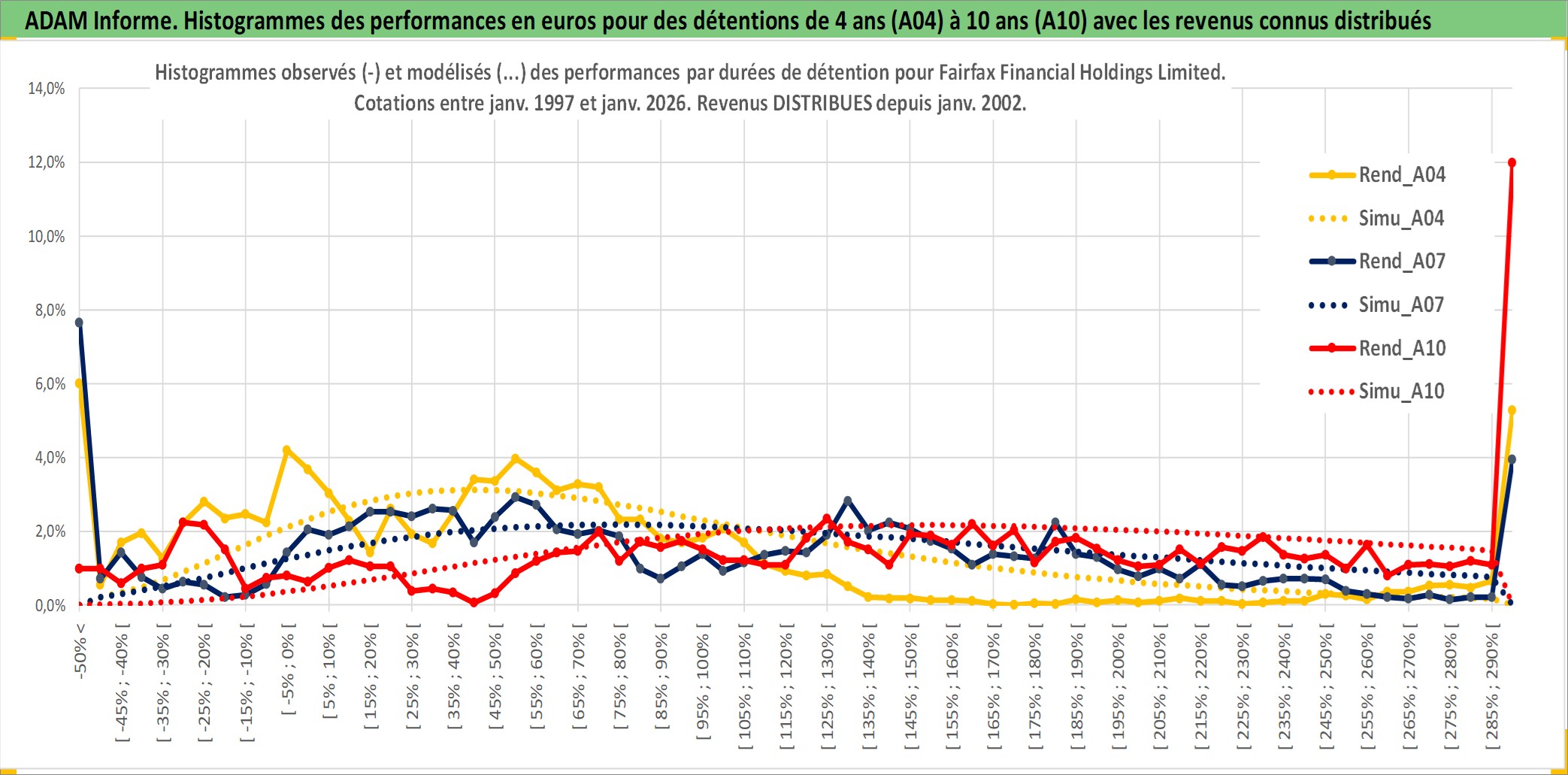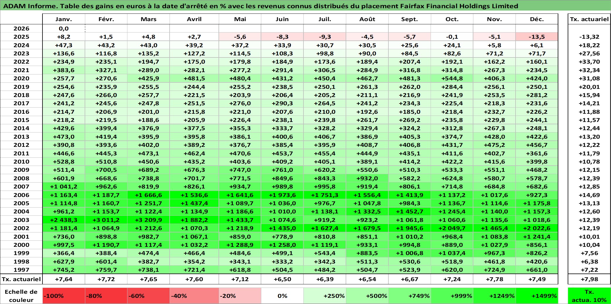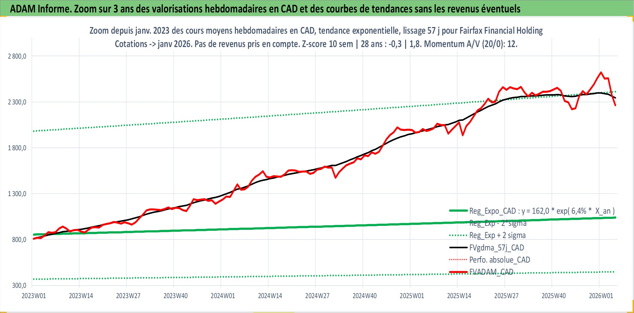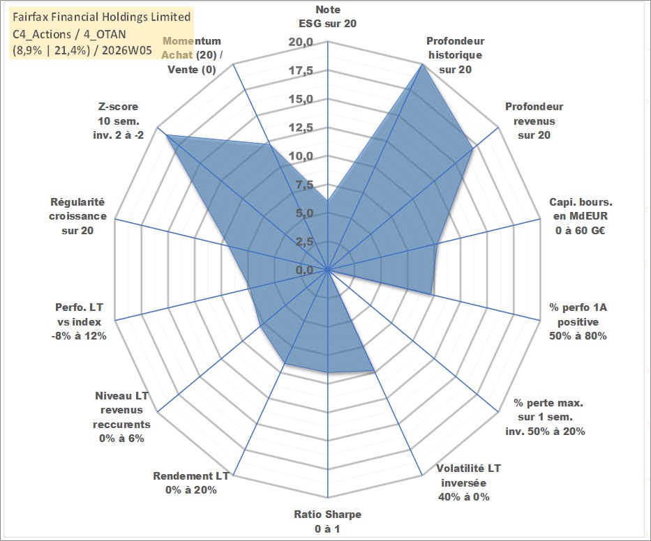 Site dédié aux investisseursPage dédiée sur site financeAnalyse des valorisations hebdomadaires de l'action Fairfax Financial Holdings Limited. Cet actif est cote en CAD. Les valorisations sont en contrevaleur EURO et couvrent les semaines 1997W01 a 2026W05. Les revenus de cet actif financier sont pris en compte depuis la semaine 2002W02. La note globale ESG de cet actif est estimee a 6.0 (apres rebasage entre 0 et 20).
