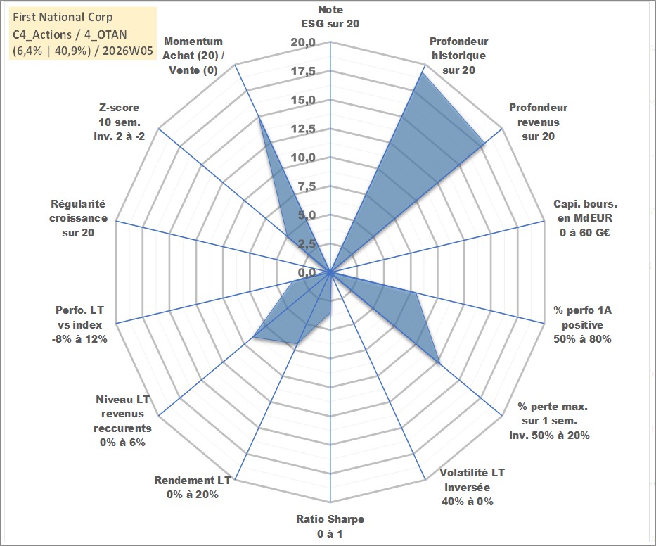 Site dédié aux investisseursPage dédiée sur site financeAnalyse des valorisations hebdomadaires de l'action First National Corp. Cet actif est cote en USD. Les valorisations sont en contrevaleur EURO et couvrent les semaines 1999W02 a 2026W05. Les revenus de cet actif financier sont pris en compte depuis la semaine 2001W11. La note ESG de cet actif n'est pas connue.