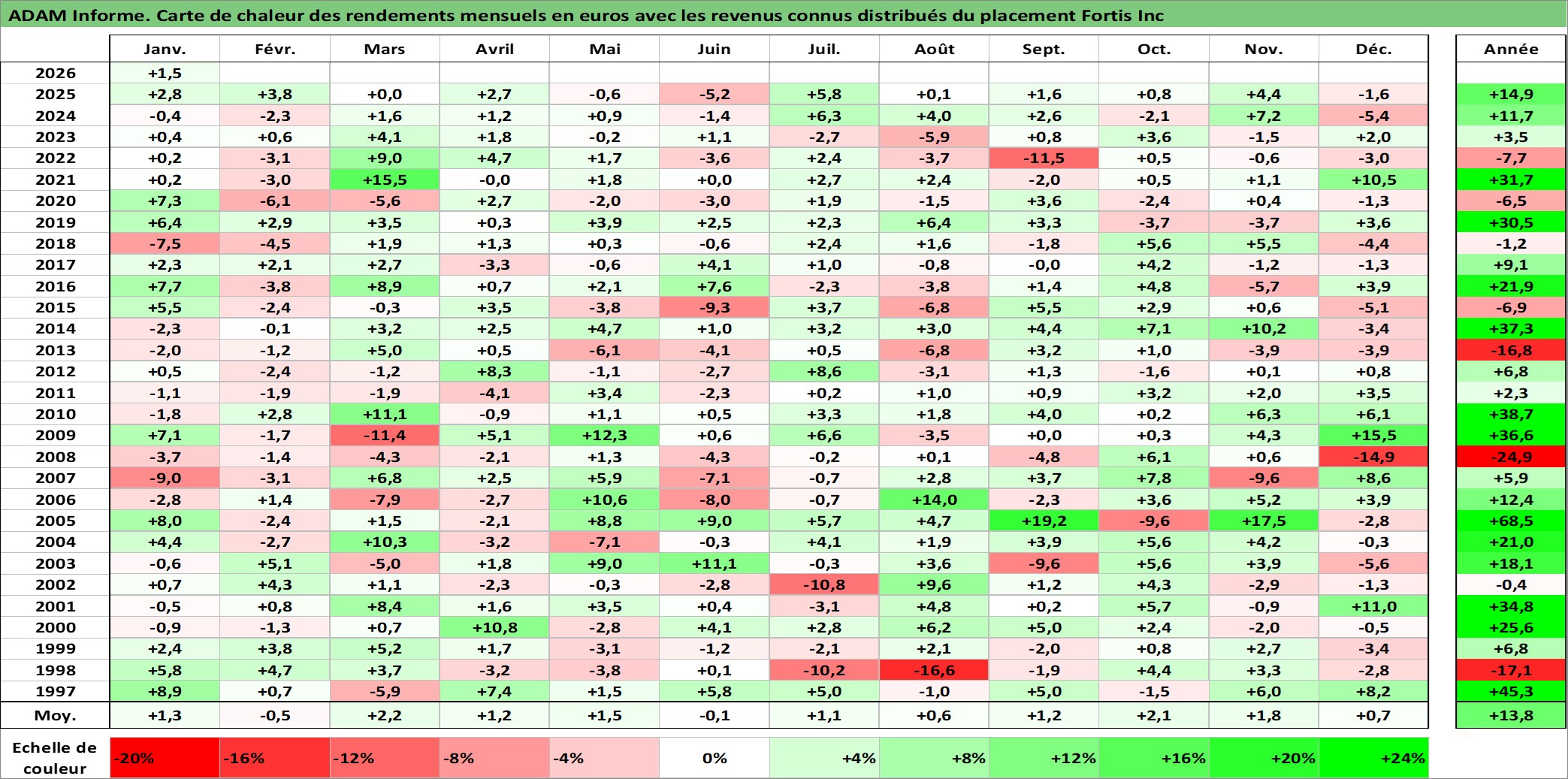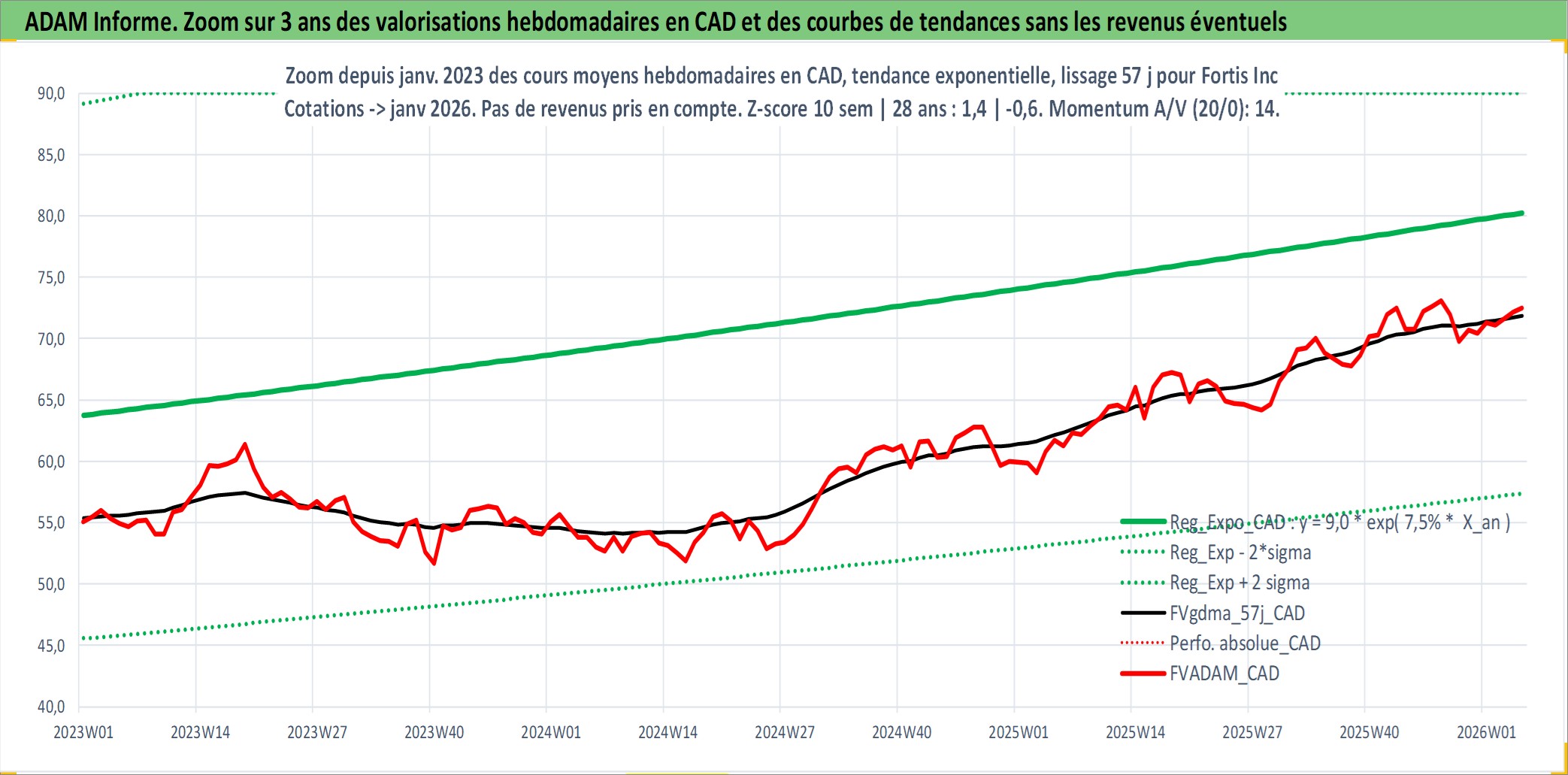 Site dédié aux investisseursPage dédiée sur site financeAnalyse des valorisations hebdomadaires de l'action Fortis Inc. Cet actif est cote en CAD. Les valorisations sont en contrevaleur EURO et couvrent les semaines 1997W01 a 2026W05. Les revenus de cet actif financier sont pris en compte depuis la semaine 1997W07. La note globale ESG de cet actif est estimee a 7.0 (apres rebasage entre 0 et 20).