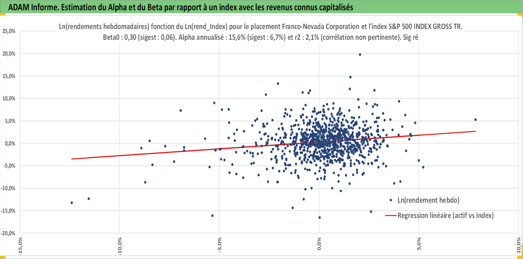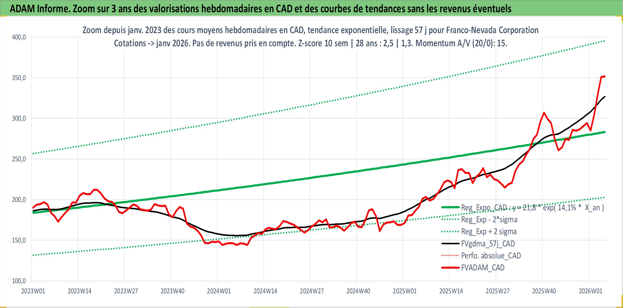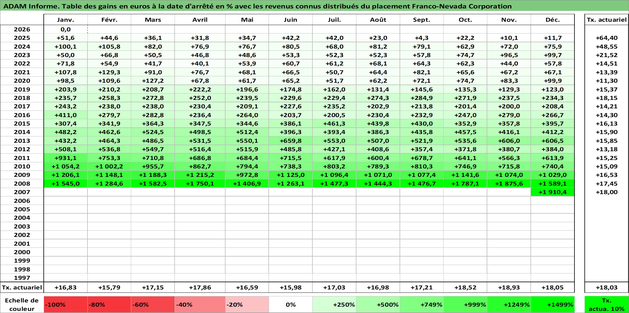 Site dédié aux investisseursPage dédiée sur site financeAnalyse des valorisations hebdomadaires de l'action Franco-Nevada Corporation. Cet actif est cote en CAD. Les valorisations sont en contrevaleur EURO et couvrent les semaines 2007W49 a 2026W05. Les revenus de cet actif financier sont pris en compte depuis la semaine 2008W23. La note globale ESG de cet actif est estimee a 18.0 (apres rebasage entre 0 et 20).