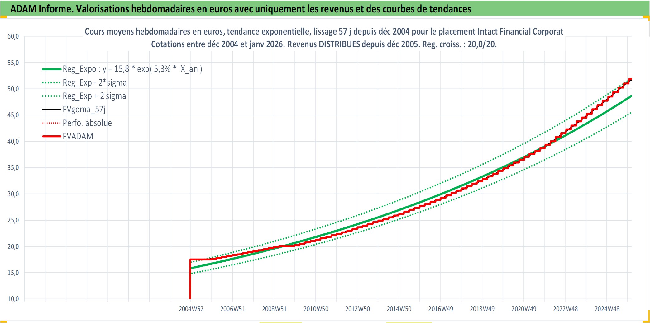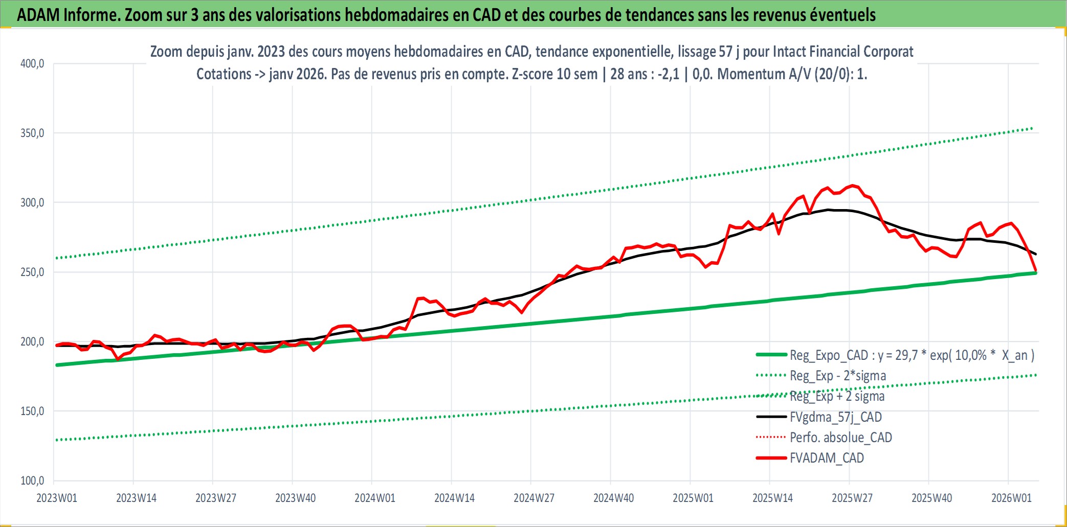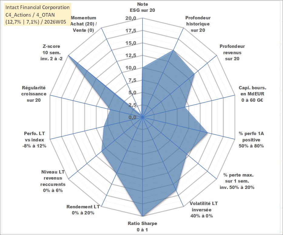 Site dédié aux investisseursPage dédiée sur site financeAnalyse des valorisations hebdomadaires de l'action Intact Financial Corporation. Cet actif est cote en CAD. Les valorisations sont en contrevaleur EURO et couvrent les semaines 2004W50 a 2026W05. Les revenus de cet actif financier sont pris en compte depuis la semaine 2005W50. La note globale ESG de cet actif est estimee a 10.0 (apres rebasage entre 0 et 20).
