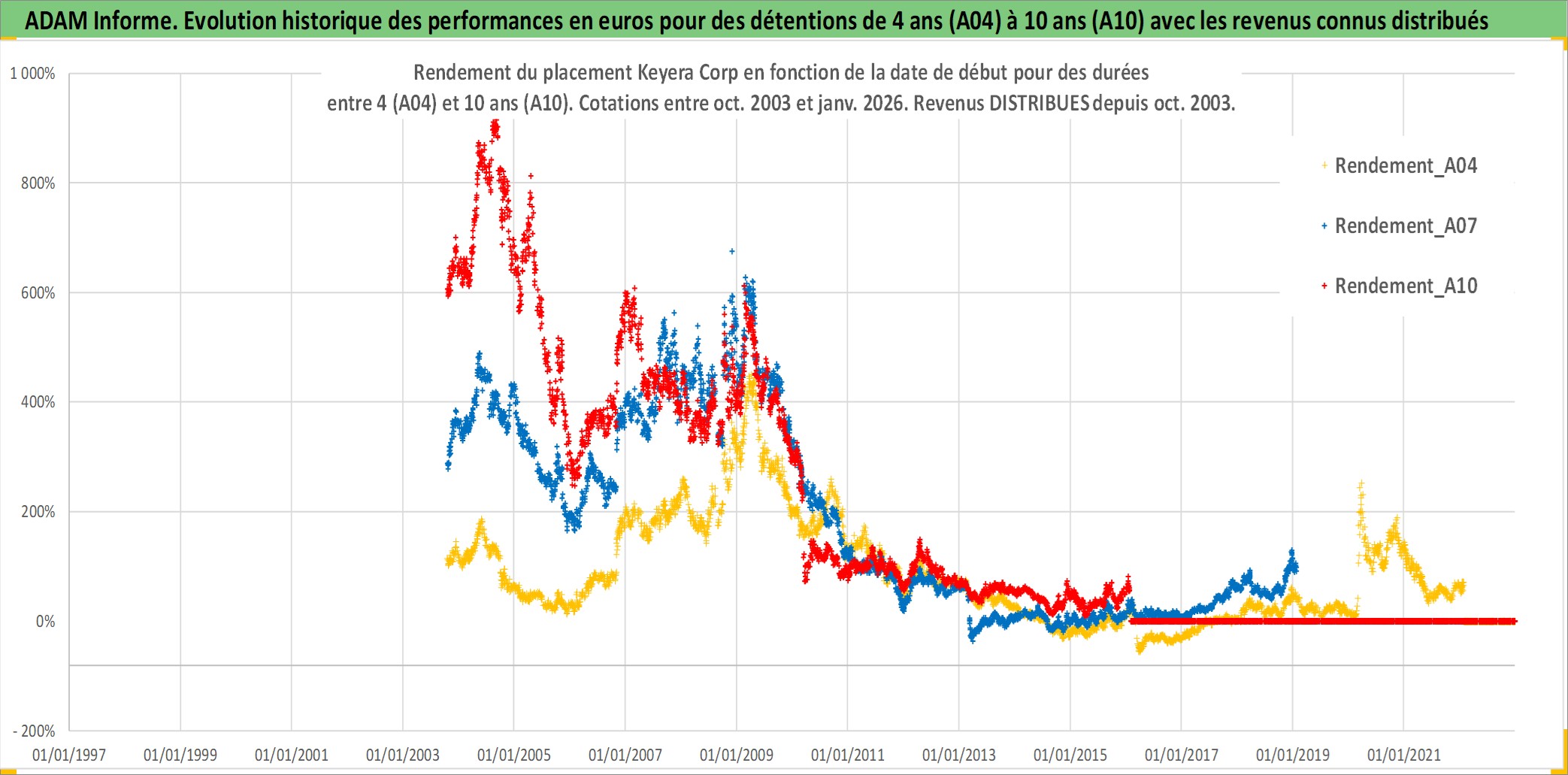 Site dédié aux investisseursPage dédiée sur site financeAnalyse des valorisations hebdomadaires de l'action Keyera Corp. Cet actif est cote en CAD. Les valorisations sont en contrevaleur EURO et couvrent les semaines 2003W41 a 2026W05. Les revenus de cet actif financier sont pris en compte depuis la semaine 2003W44. La note globale ESG de cet actif est estimee a 9.0 (apres rebasage entre 0 et 20).