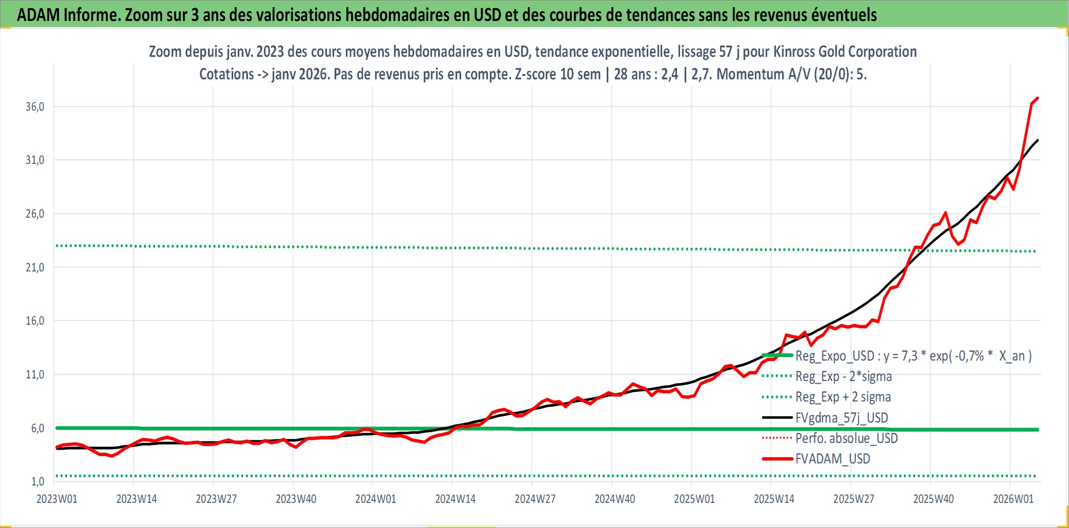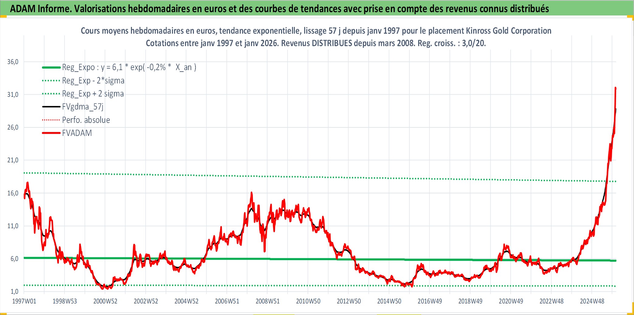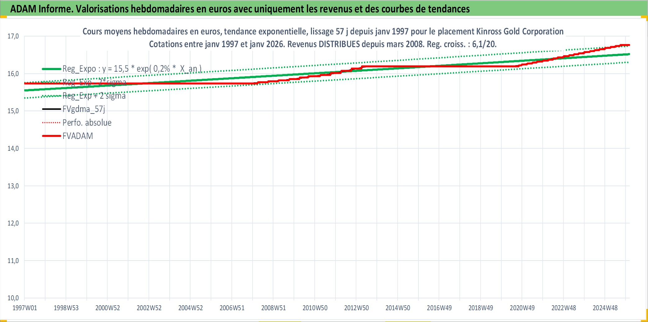 Site dédié aux investisseursPage dédiée sur site financeAnalyse des valorisations hebdomadaires de l'action Kinross Gold Corporation. Cet actif est cote en USD. Les valorisations sont en contrevaleur EURO et couvrent les semaines 1997W01 a 2026W05. Les revenus de cet actif financier sont pris en compte depuis la semaine 2008W12. La note ESG de cet actif n'est pas connue.