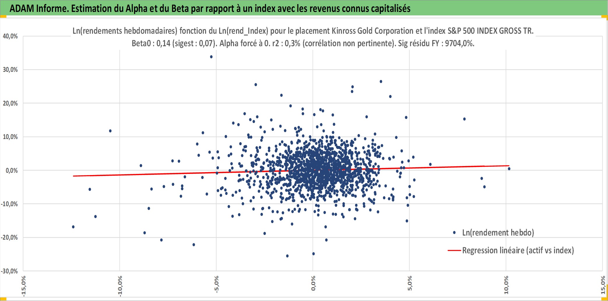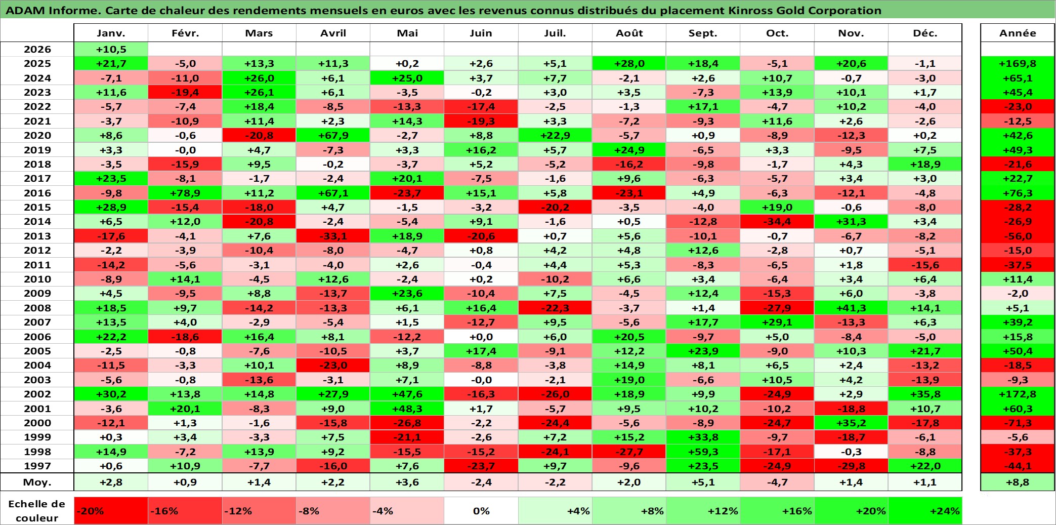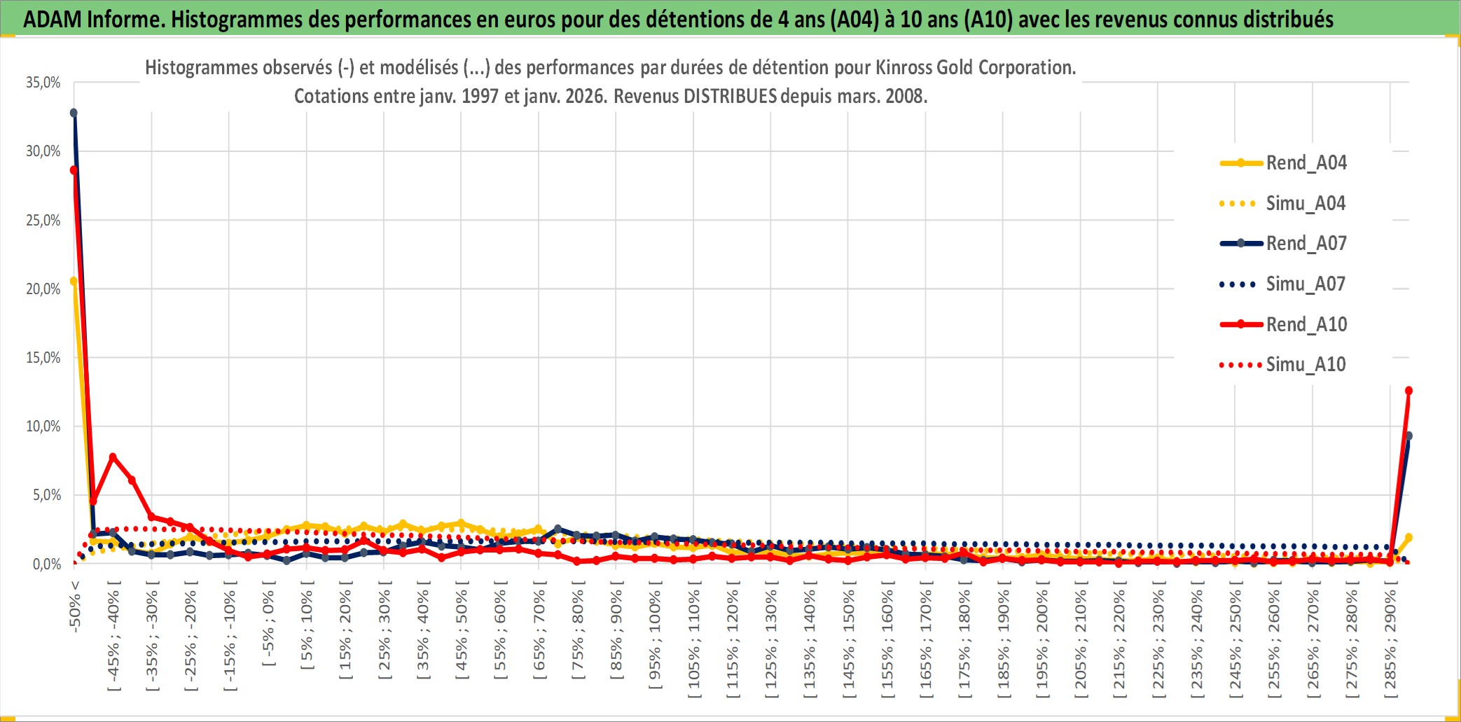 Site dédié aux investisseursPage dédiée sur site financeAnalyse des valorisations hebdomadaires de l'action Kinross Gold Corporation. Cet actif est cote en USD. Les valorisations sont en contrevaleur EURO et couvrent les semaines 1997W01 a 2026W05. Les revenus de cet actif financier sont pris en compte depuis la semaine 2008W12. La note ESG de cet actif n'est pas connue.
