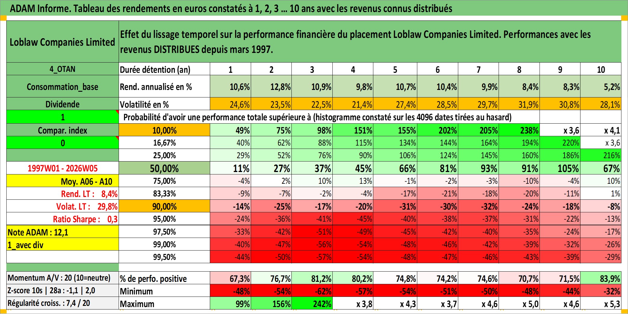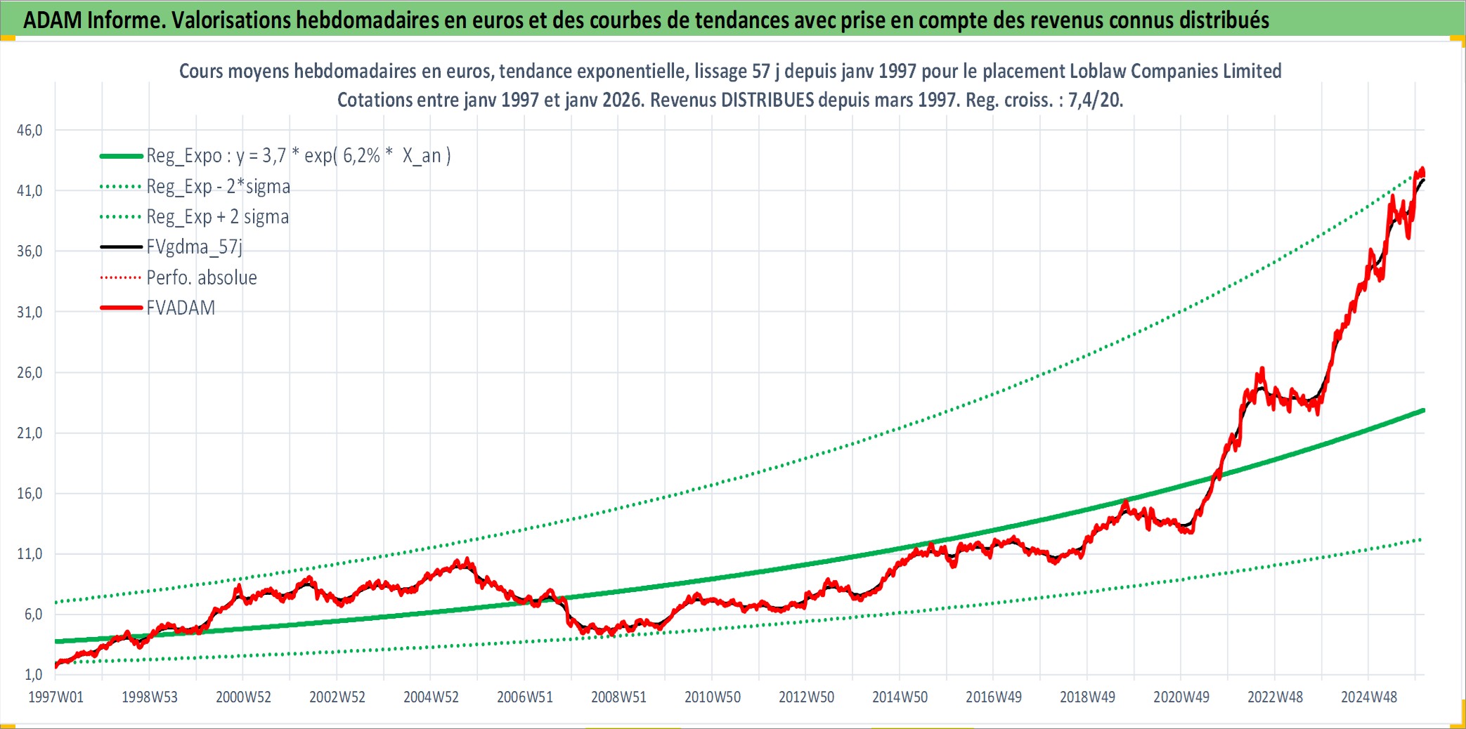Site dédié aux investisseursPage dédiée sur site financeAnalyse des valorisations hebdomadaires de l'action Loblaw Companies Limited. Cet actif est cote en CAD. Les valorisations sont en contrevaleur EURO et couvrent les semaines 1997W01 a 2026W05. Les revenus de cet actif financier sont pris en compte depuis la semaine 1997W11. La note globale ESG de cet actif est estimee a 10.0 (apres rebasage entre 0 et 20).