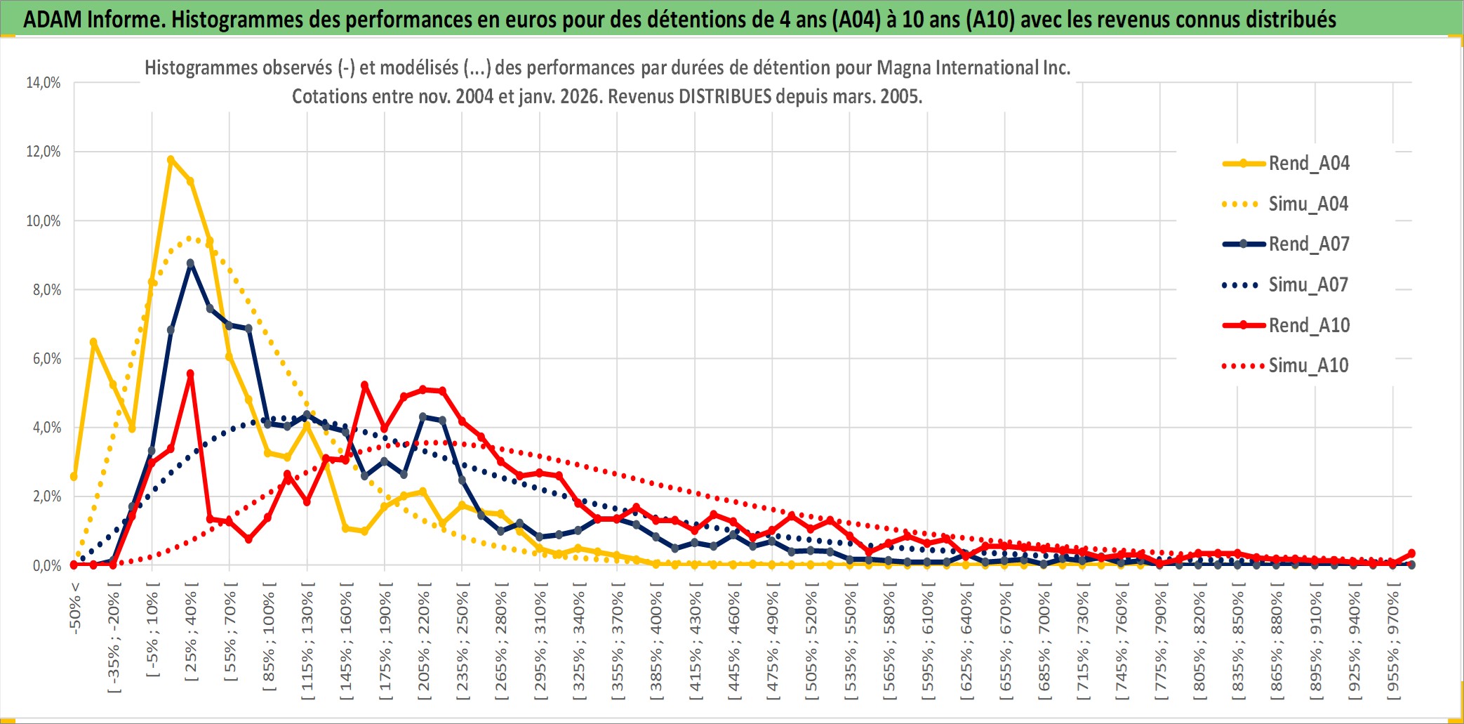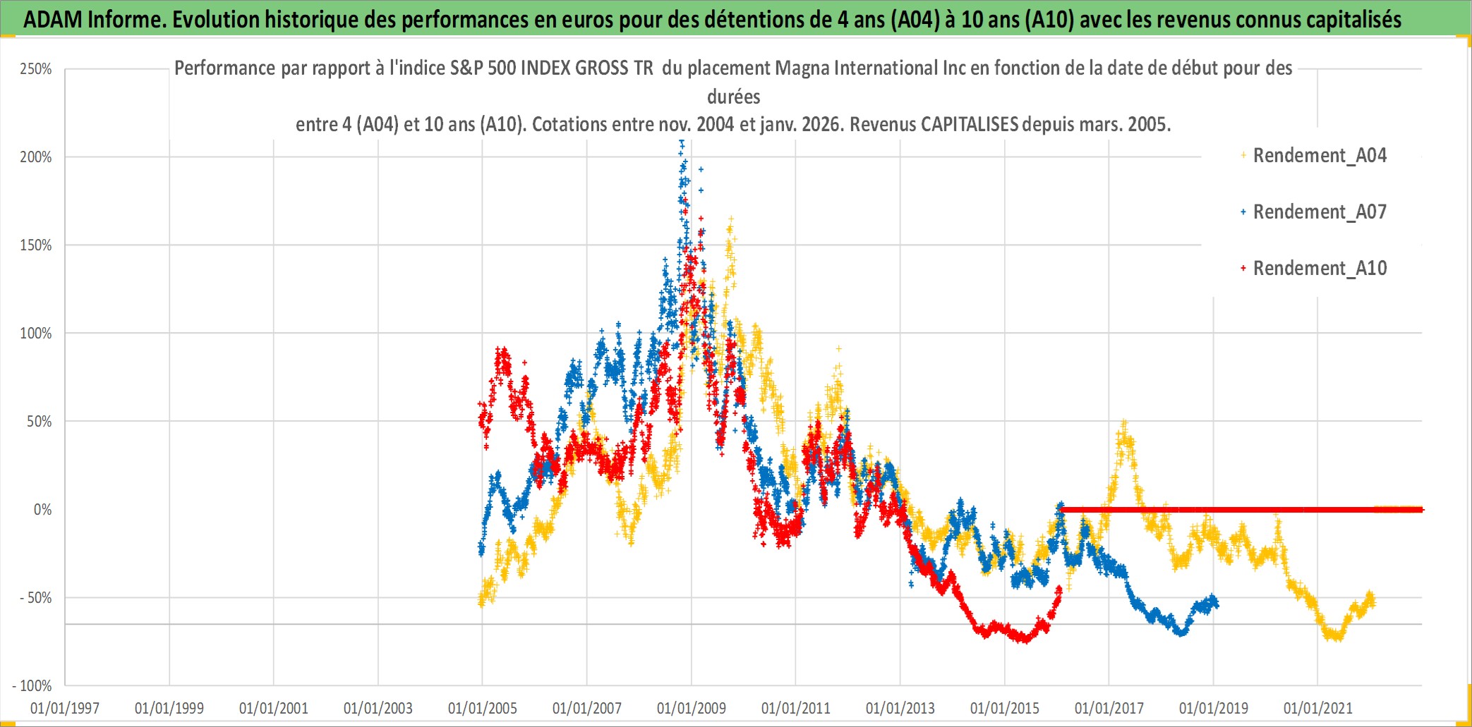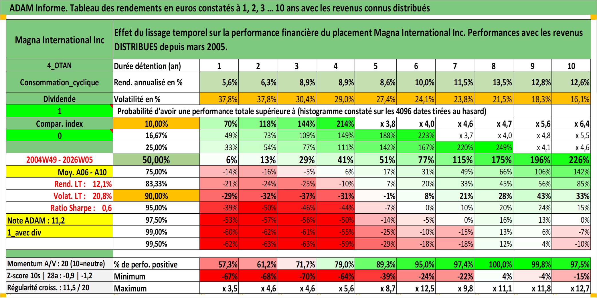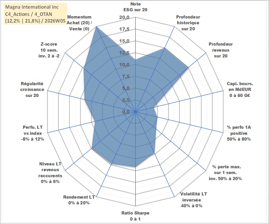 Site dédié aux investisseursPage dédiée sur site financeAnalyse des valorisations hebdomadaires de l'action Magna International Inc. Cet actif est cote en CAD. Les valorisations sont en contrevaleur EURO et couvrent les semaines 2004W49 a 2026W05. Les revenus de cet actif financier sont pris en compte depuis la semaine 2005W10. La note globale ESG de cet actif est estimee a 11.0 (apres rebasage entre 0 et 20).