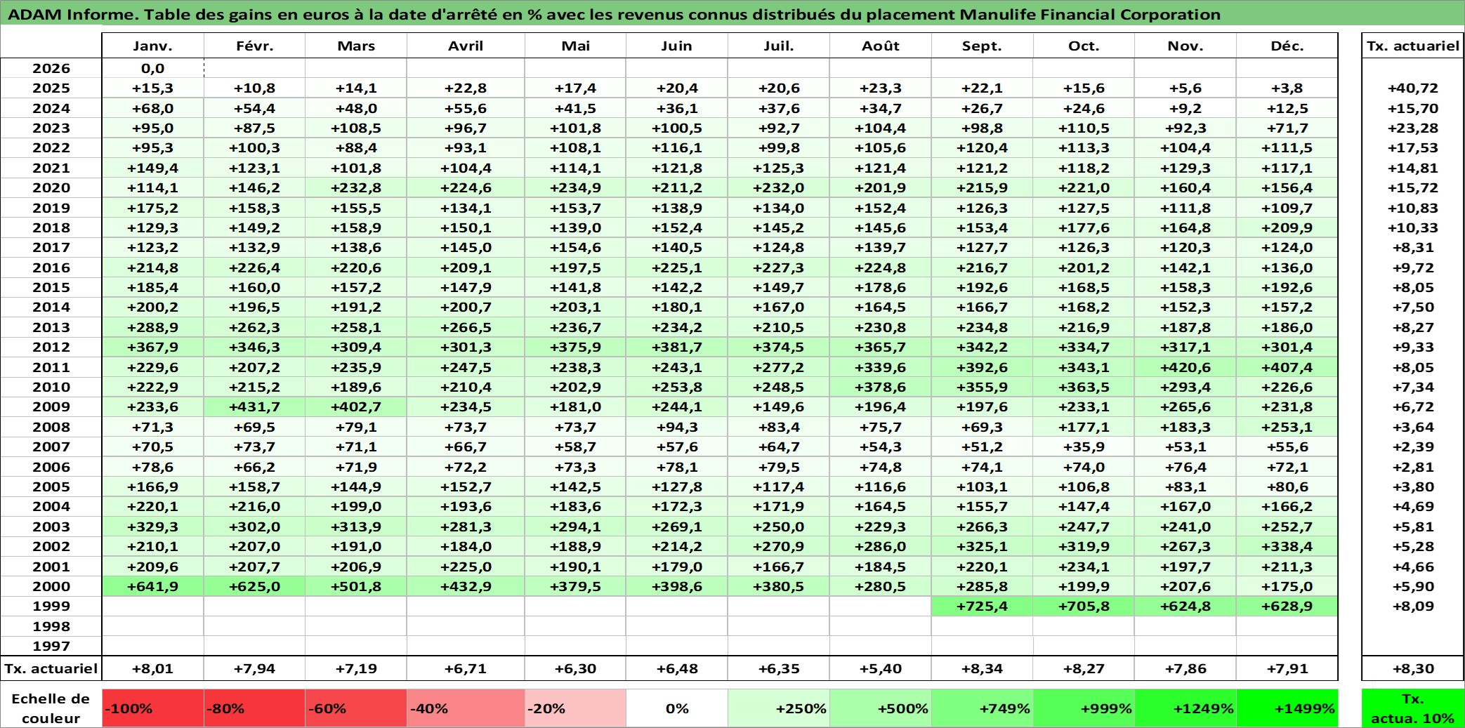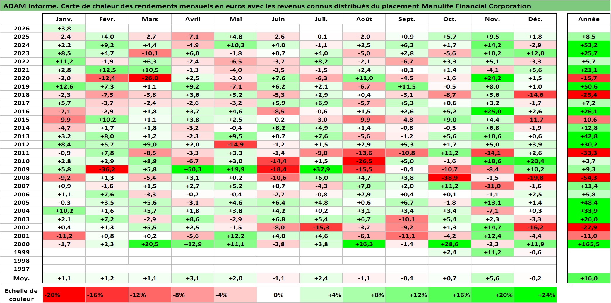 Site dédié aux investisseursPage dédiée sur site financeAnalyse des valorisations hebdomadaires de l'action Manulife Financial Corporation. Cet actif est cote en CAD. Les valorisations sont en contrevaleur EURO et couvrent les semaines 1999W39 a 2026W05. Les revenus de cet actif financier sont pris en compte depuis la semaine 2000W46. La note globale ESG de cet actif est estimee a 12.0 (apres rebasage entre 0 et 20).