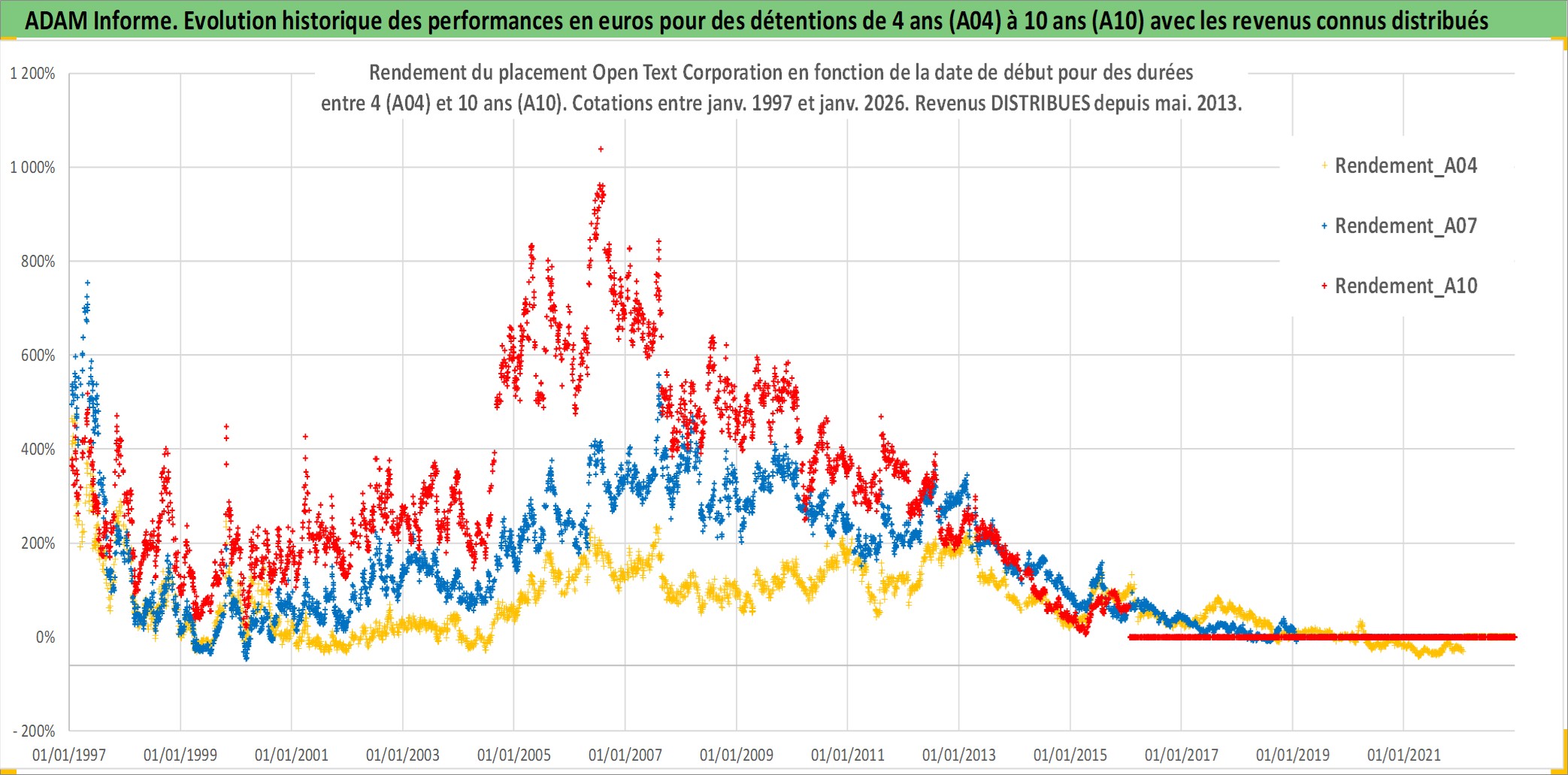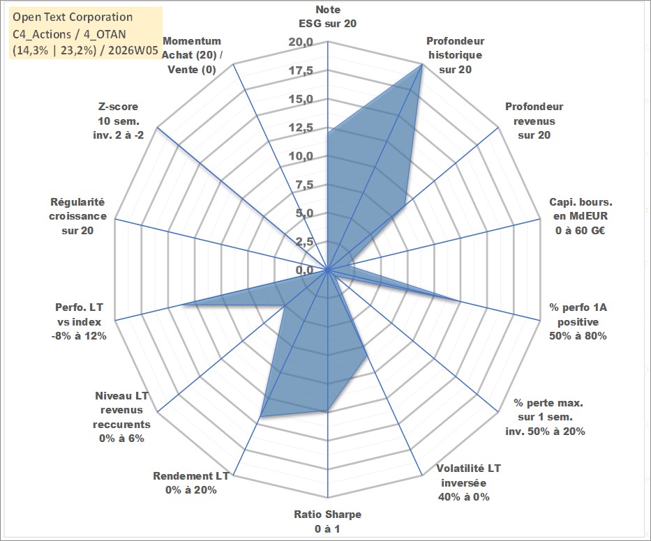 Site dédié aux investisseursPage dédiée sur site financeAnalyse des valorisations hebdomadaires de l'action Open Text Corporation. Cet actif est cote en USD. Les valorisations sont en contrevaleur EURO et couvrent les semaines 1997W01 a 2026W05. Les revenus de cet actif financier sont pris en compte depuis la semaine 2013W22. La note globale ESG de cet actif est estimee a 12.0 (apres rebasage entre 0 et 20).