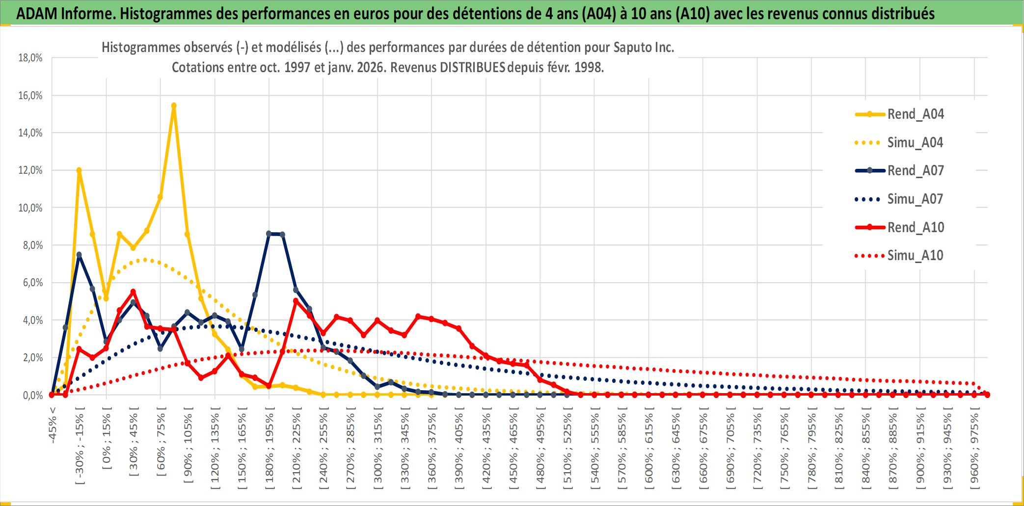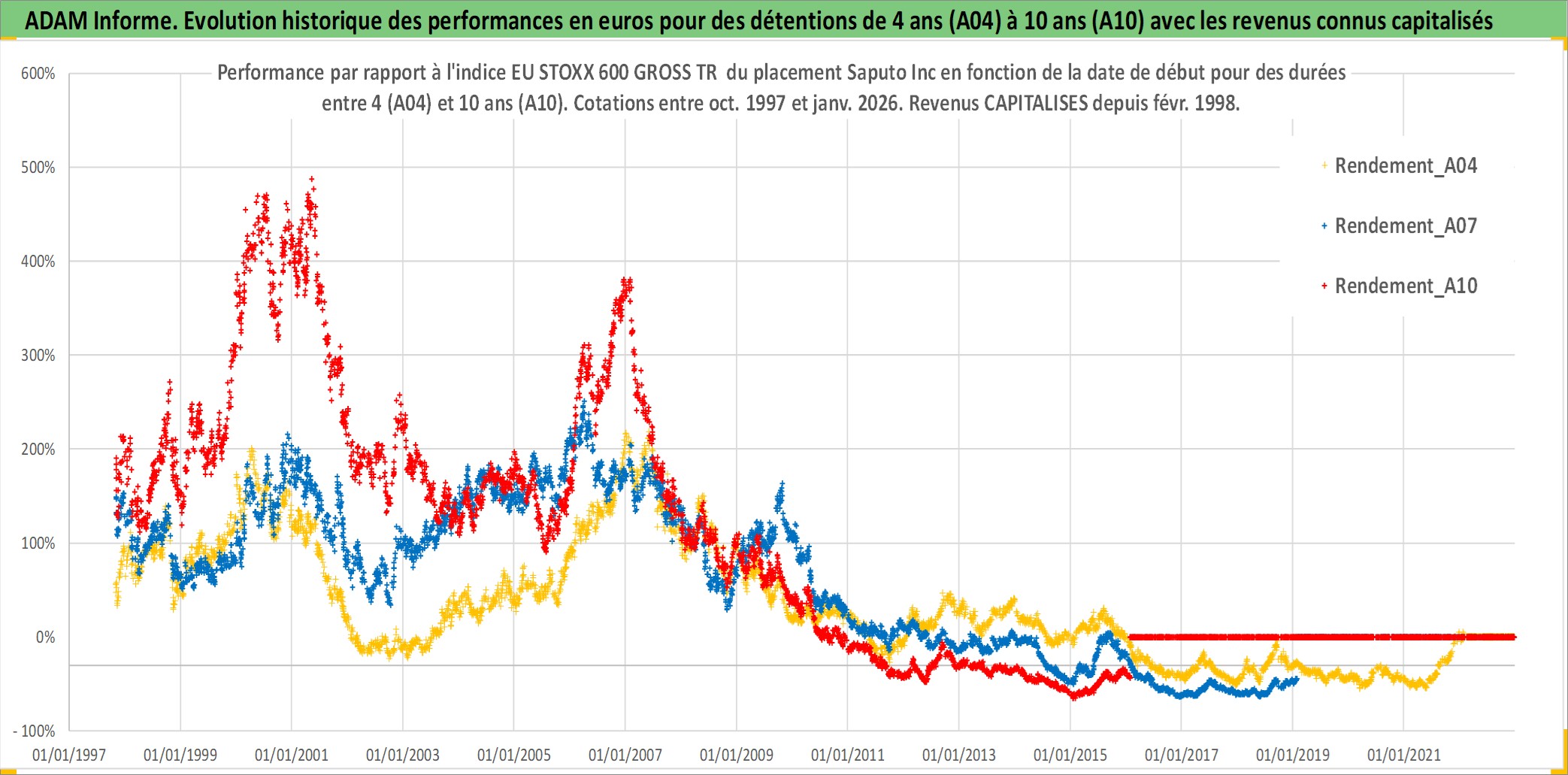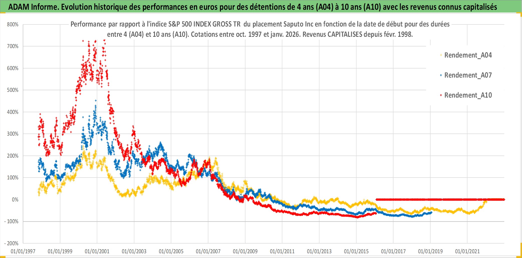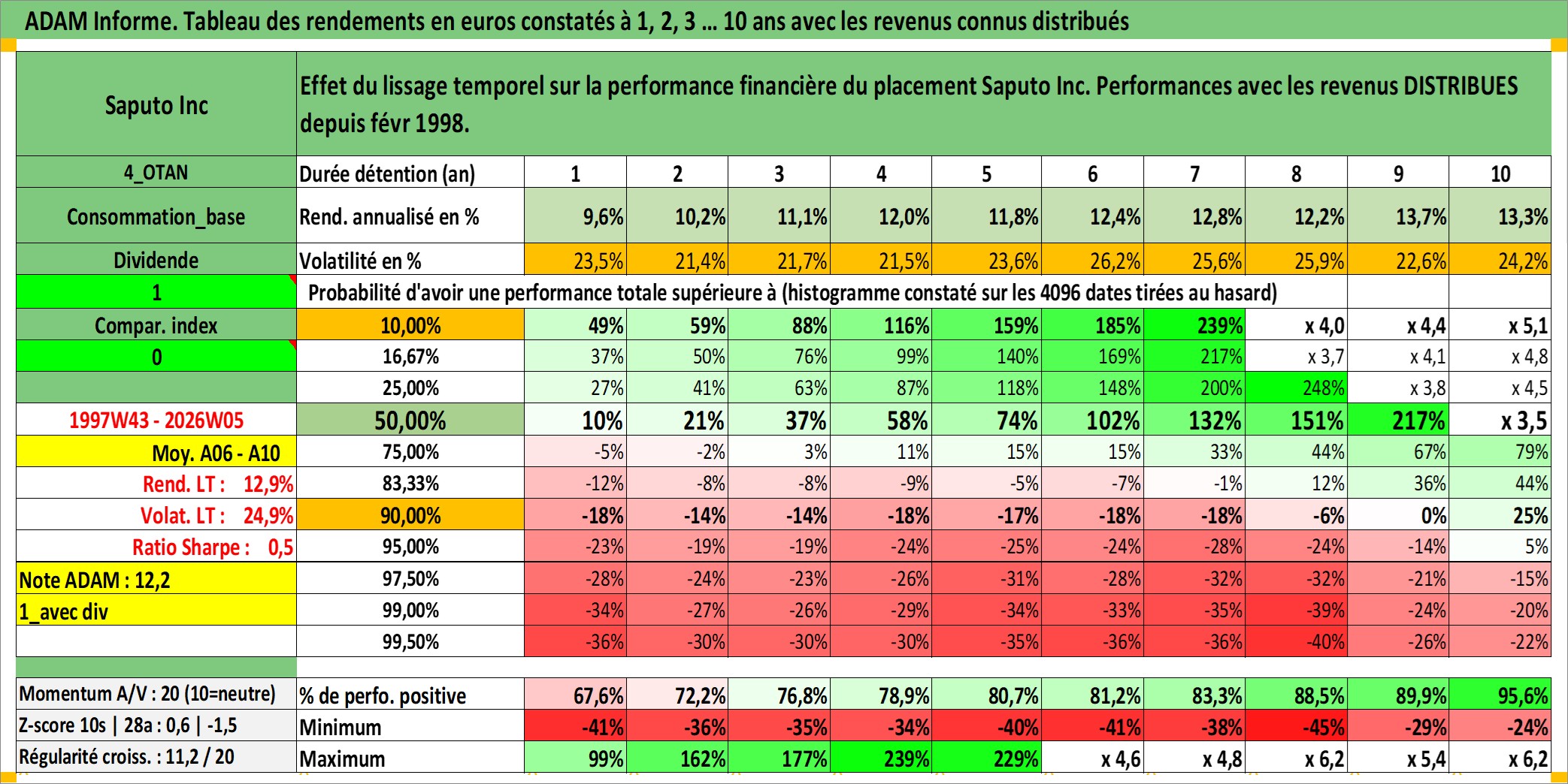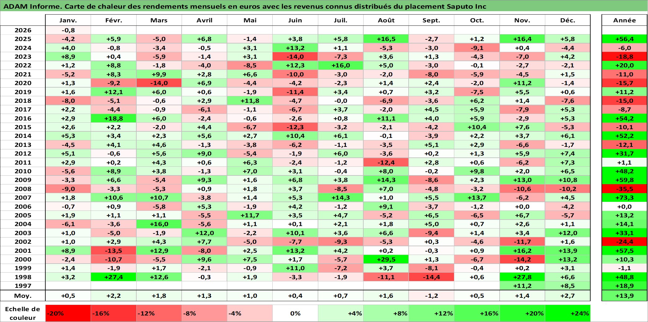 Site dédié aux investisseursPage dédiée sur site financeAnalyse des valorisations hebdomadaires de l'action Saputo Inc. Cet actif est cote en CAD. Les valorisations sont en contrevaleur EURO et couvrent les semaines 1997W43 a 2026W05. Les revenus de cet actif financier sont pris en compte depuis la semaine 1998W08. La note globale ESG de cet actif est estimee a 5.0 (apres rebasage entre 0 et 20).