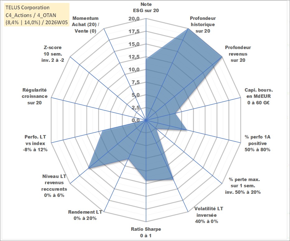Site dédié aux investisseursPage dédiée sur site financeAnalyse des valorisations hebdomadaires de l'action TELUS Corporation. Cet actif est cote en CAD. Les valorisations sont en contrevaleur EURO et couvrent les semaines 1997W01 a 2026W05. Les revenus de cet actif financier sont pris en compte depuis la semaine 1997W10. La note globale ESG de cet actif est estimee a 12.0 (apres rebasage entre 0 et 20).
