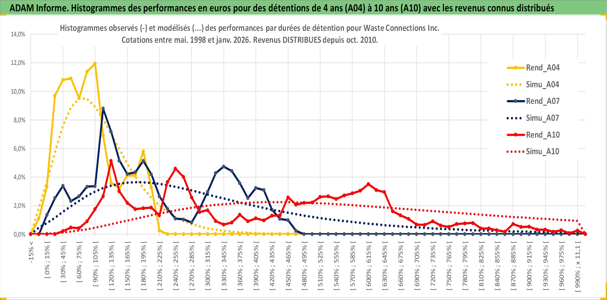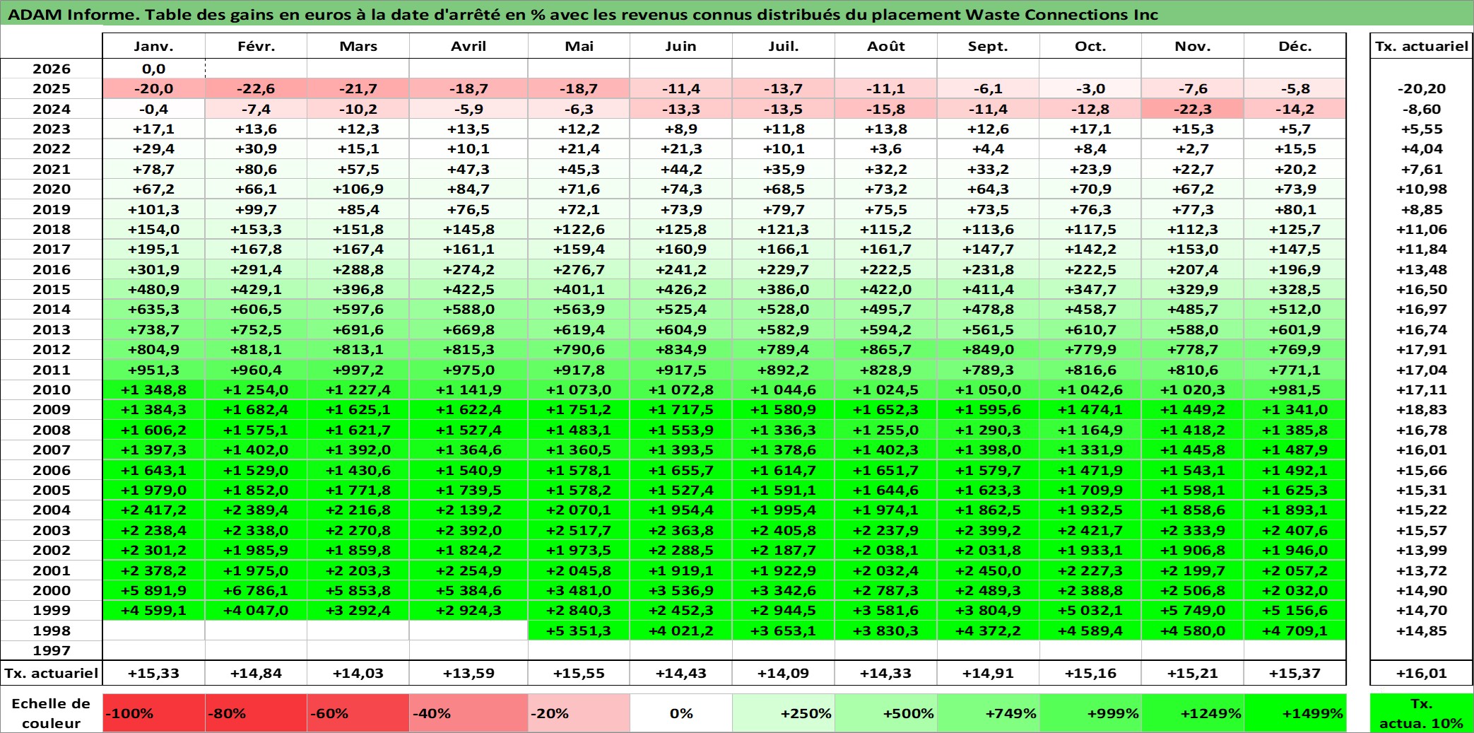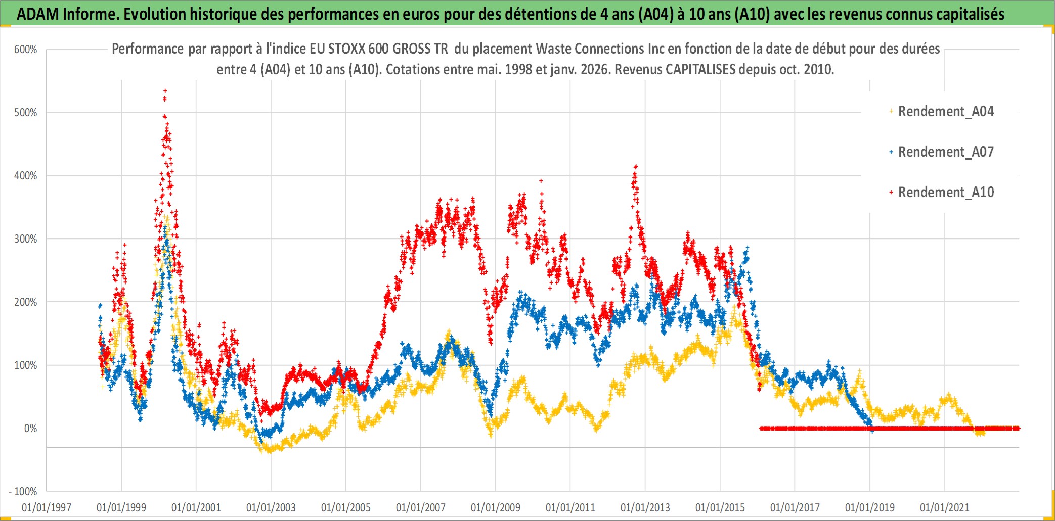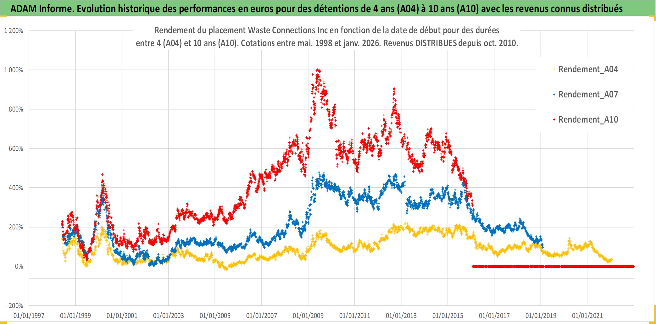 Site dédié aux investisseursPage dédiée sur site financeAnalyse des valorisations hebdomadaires de l'action Waste Connections Inc. Cet actif est cote en USD. Les valorisations sont en contrevaleur EURO et couvrent les semaines 1998W21 a 2026W05. Les revenus de cet actif financier sont pris en compte depuis la semaine 2010W43. La note globale ESG de cet actif est estimee a 11.0 (apres rebasage entre 0 et 20).