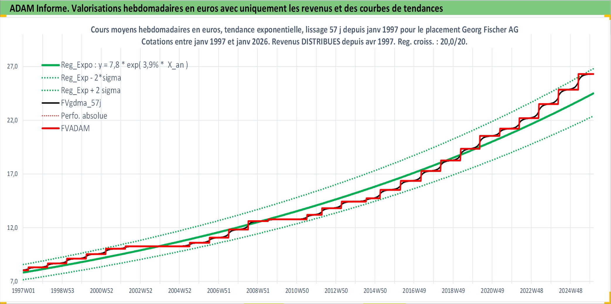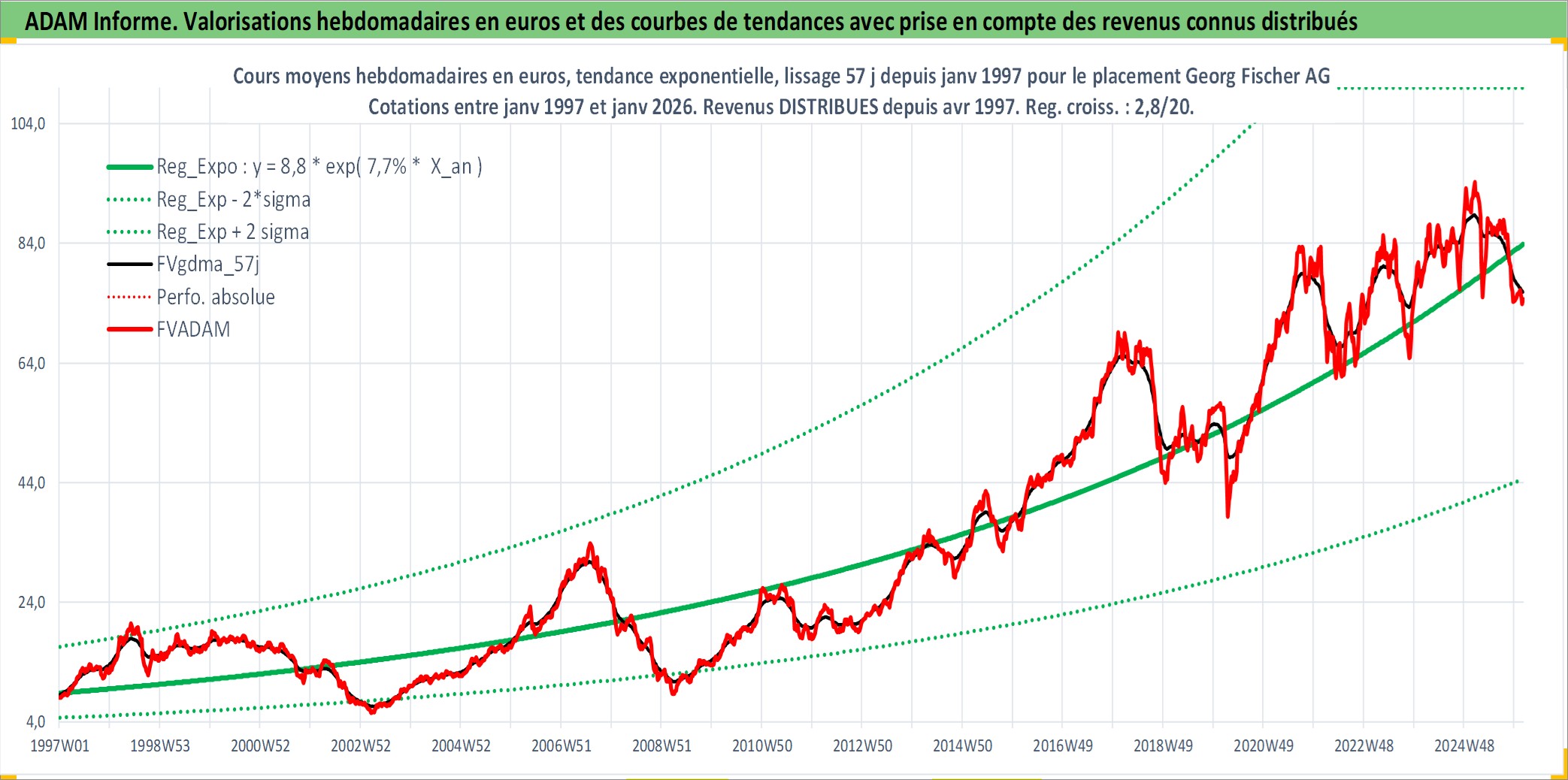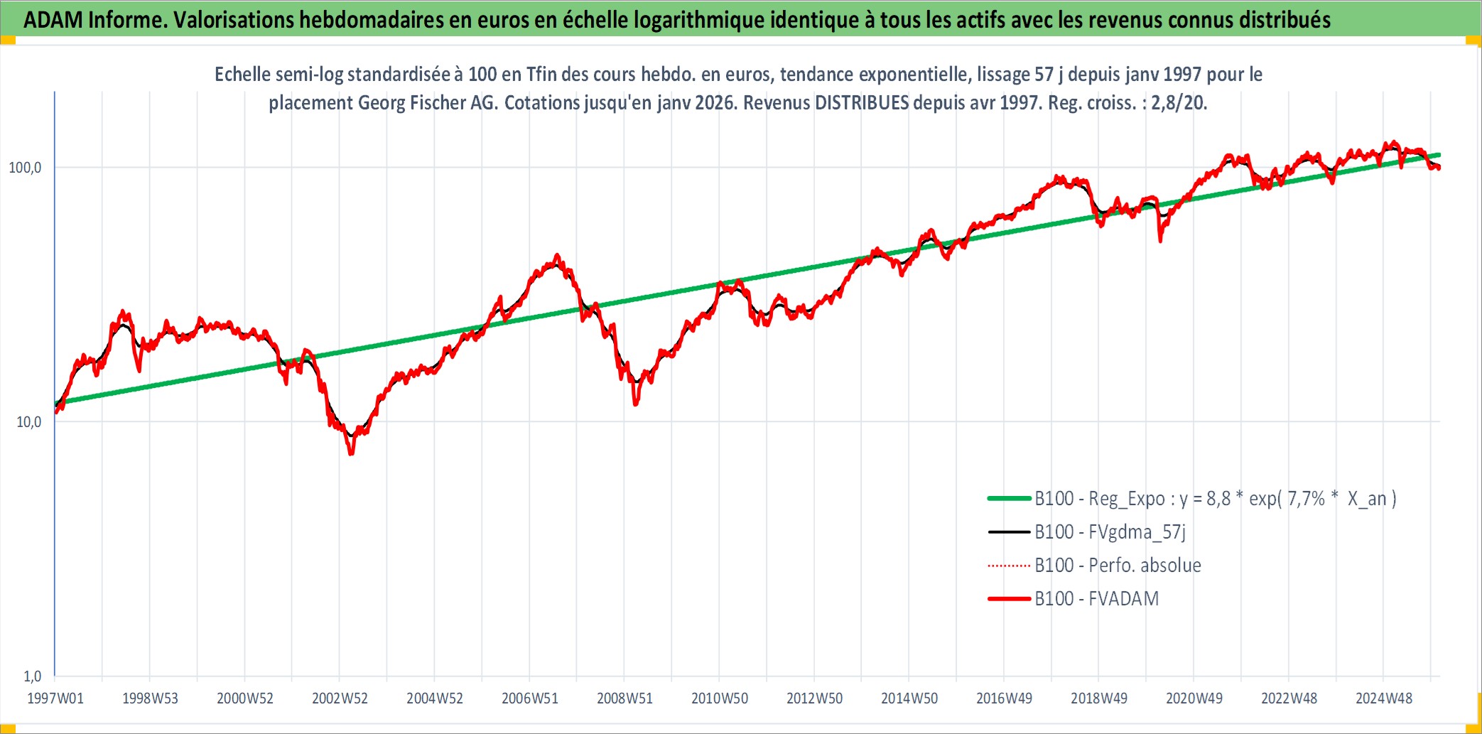 Site dédié aux investisseursPage dédiée sur site financeAnalyse des valorisations hebdomadaires de l'action Georg Fischer AG. Cet actif est cote en CHF. Les valorisations sont en contrevaleur EURO et couvrent les semaines 1997W01 a 2026W05. Les revenus de cet actif financier sont pris en compte depuis la semaine 1997W15. La note ESG de cet actif n'est pas connue.